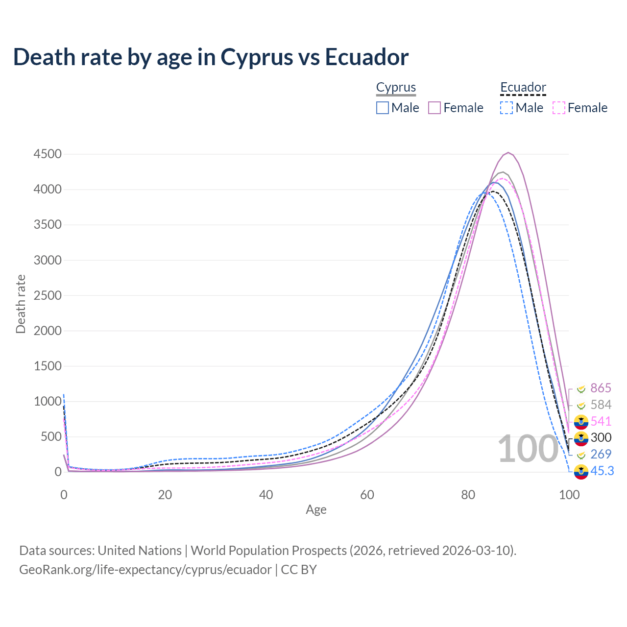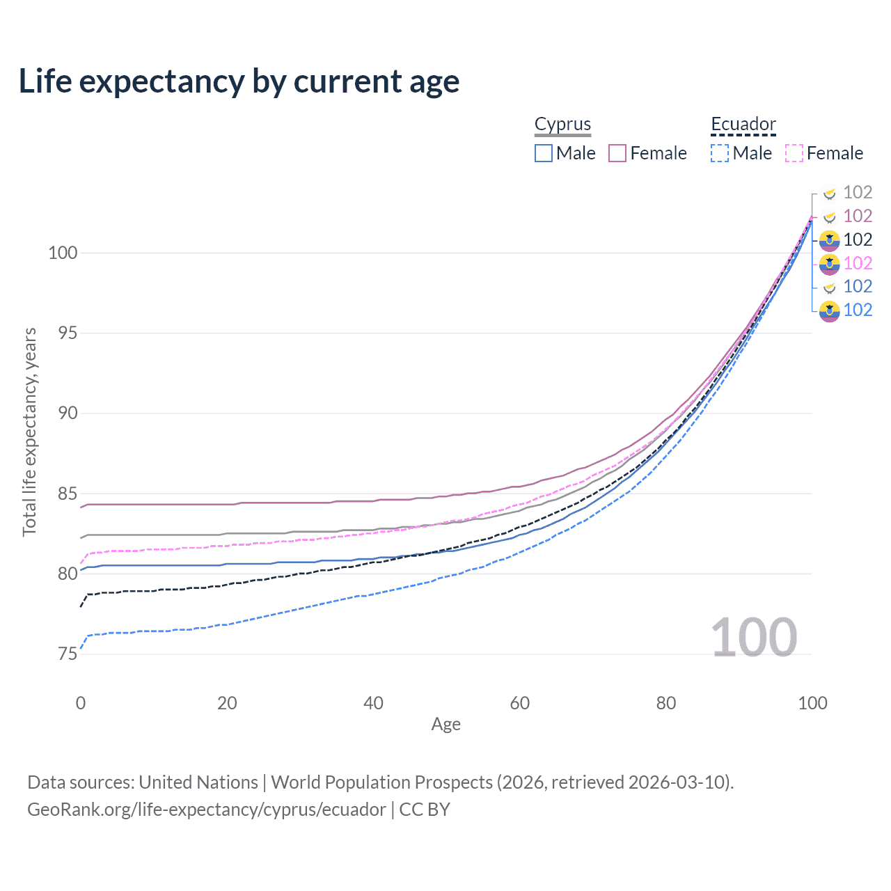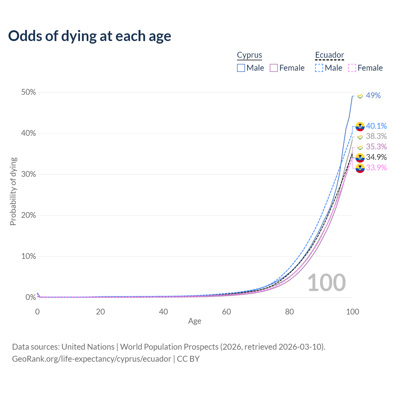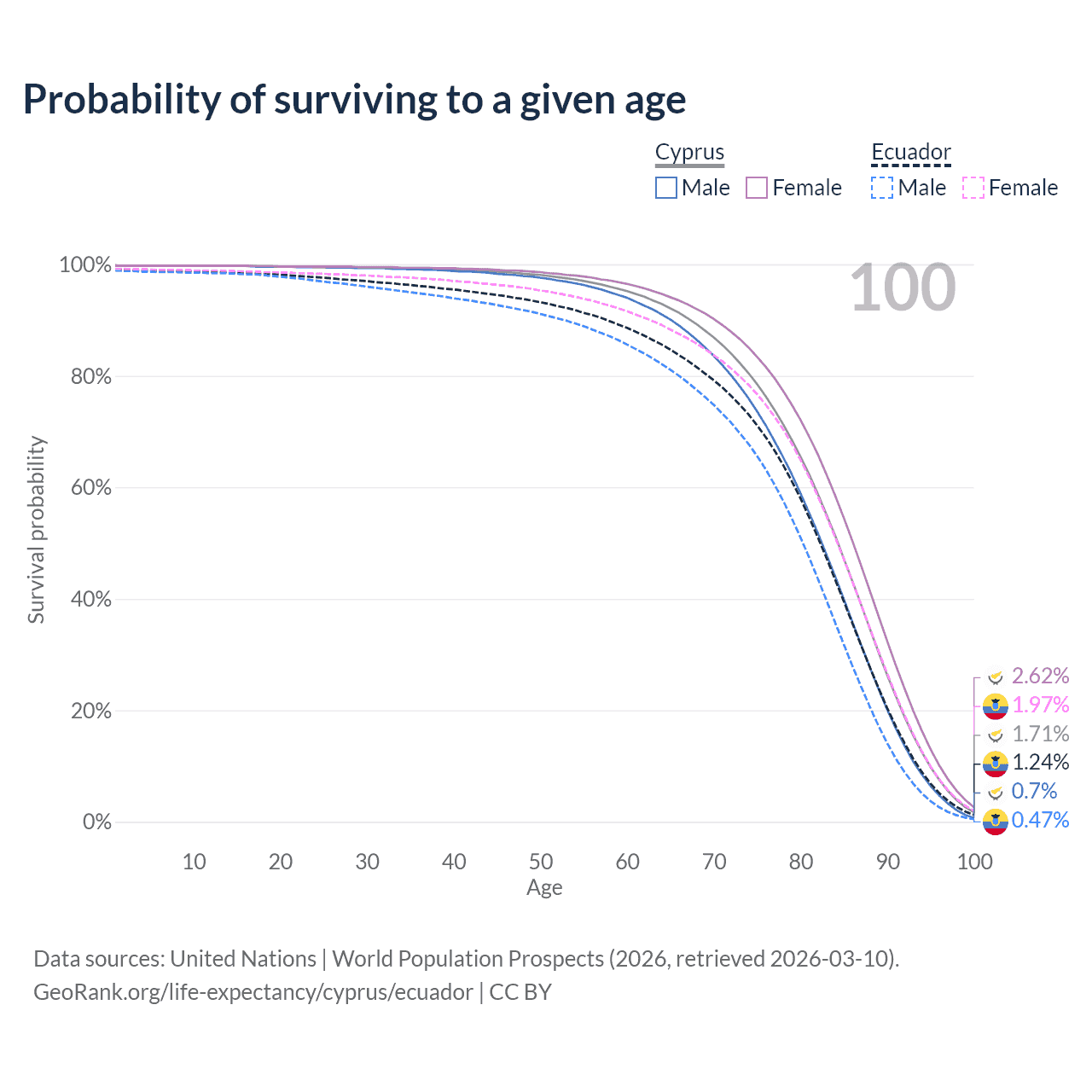 This life expectancy calculator shows the odds of living to 100, 95, 90, and below based on current age for both males and females in Cyprus and Ecuador, along with mean and median age of death. The calculations are based on the 2026 life tables (actuarial tables) from the UN World Population Prospects.