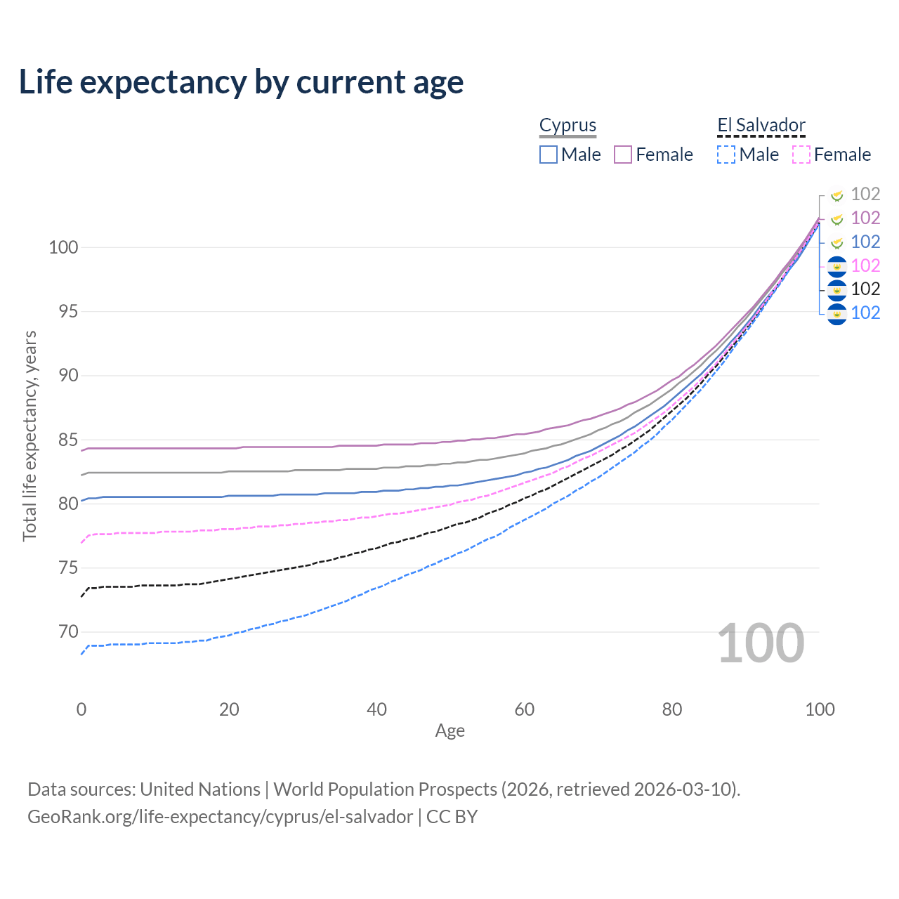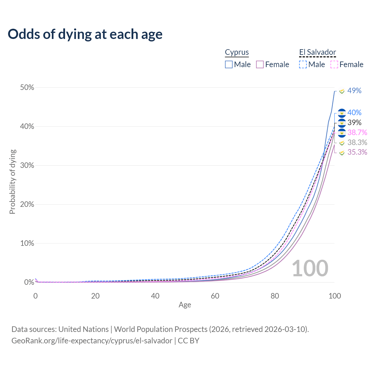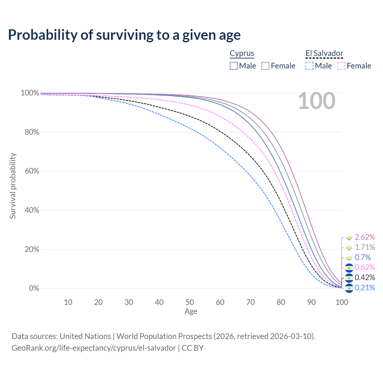 This life expectancy calculator shows the odds of living to 100, 95, 90, and below based on current age for both males and females in Cyprus and El Salvador, along with mean and median age of death. The calculations are based on the 2026 life tables (actuarial tables) from the UN World Population Prospects.