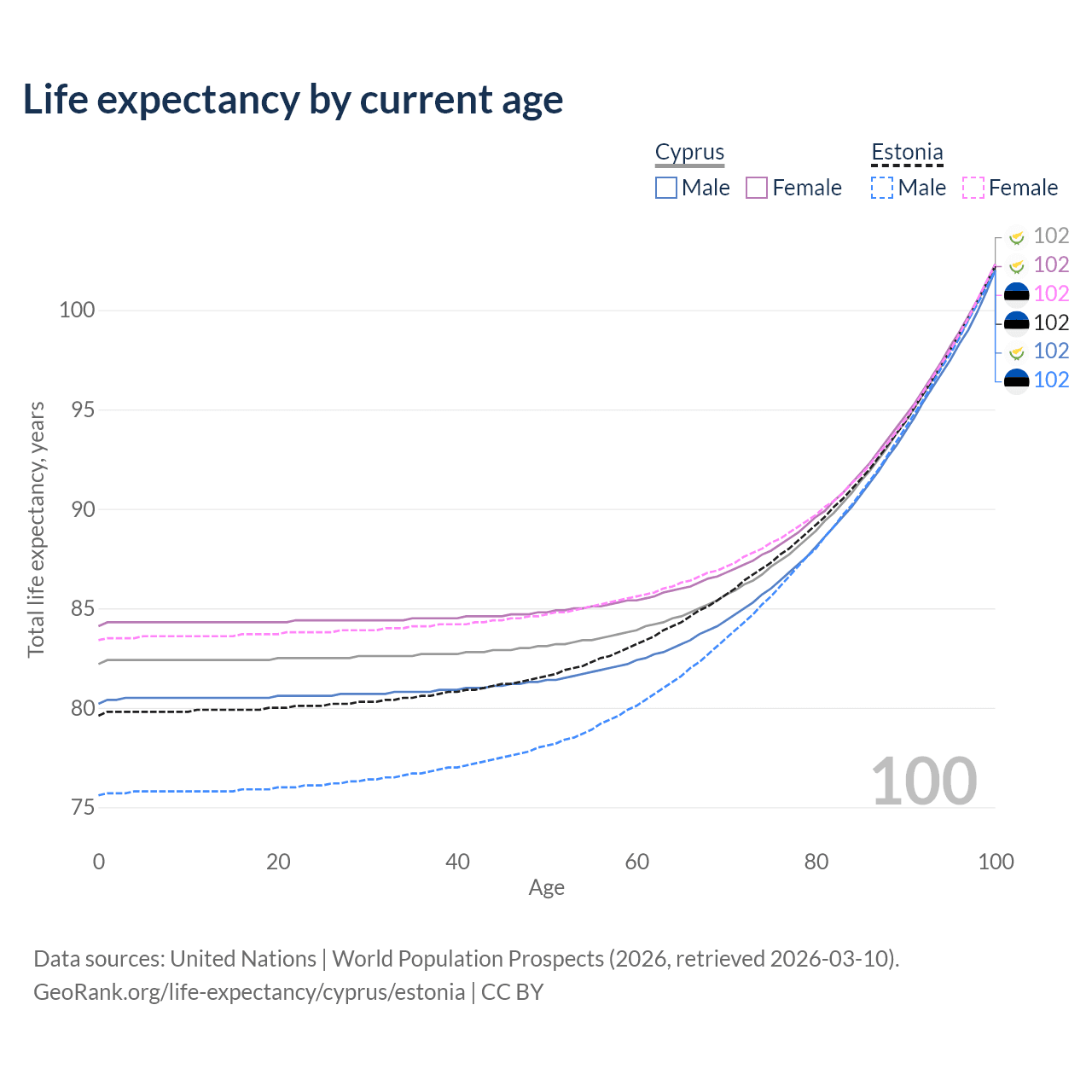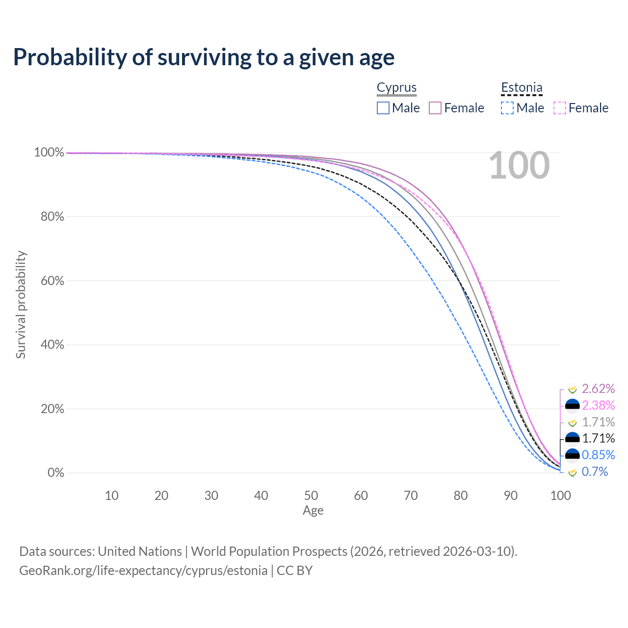 This life expectancy calculator shows the odds of living to 100, 95, 90, and below based on current age for both males and females in Cyprus and Estonia, along with mean and median age of death. The calculations are based on the 2026 life tables (actuarial tables) from the UN World Population Prospects.