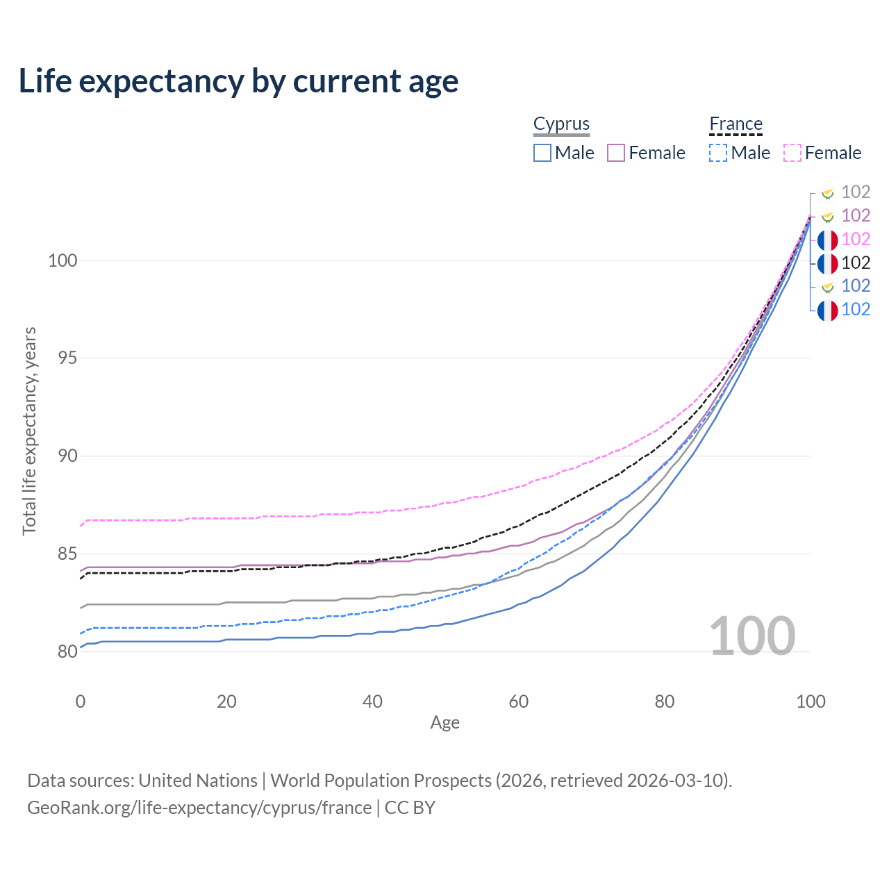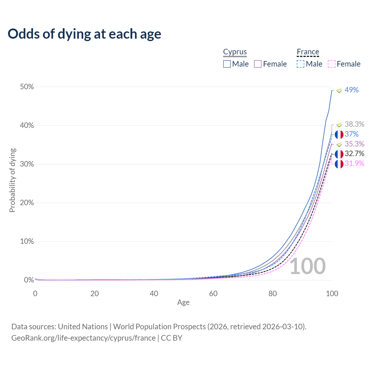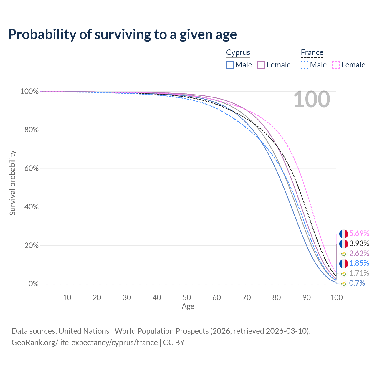 This life expectancy calculator shows the odds of living to 100, 95, 90, and below based on current age for both males and females in Cyprus and France, along with mean and median age of death. The calculations are based on the 2026 life tables (actuarial tables) from the UN World Population Prospects.