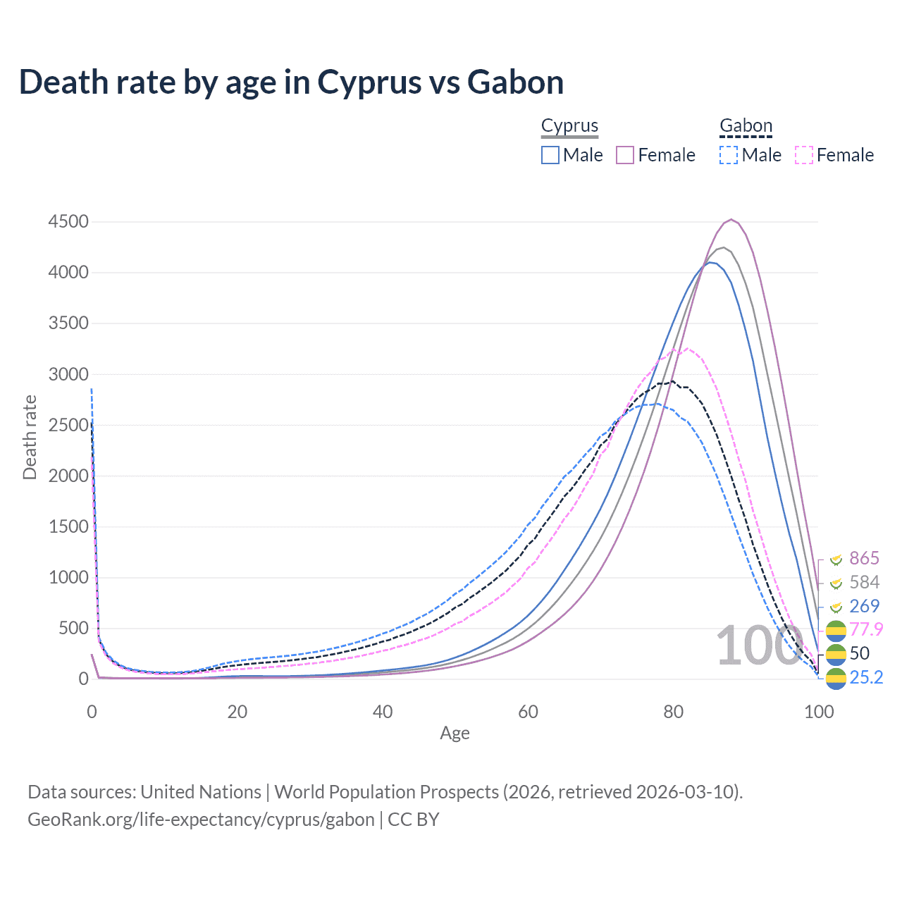 In Cyprus, the most common age of death is 87, compared to 80 in Gabon. The median age of death is 84.3 in Cyprus and 73.9 in Gabon, meaning only half of each cohort is expected to live past that age.