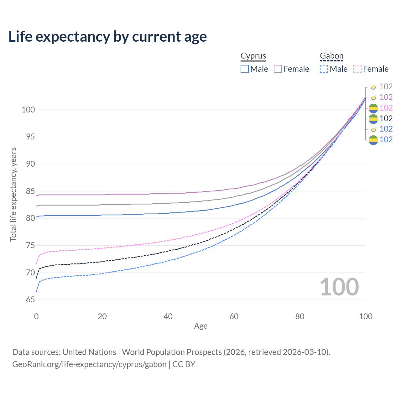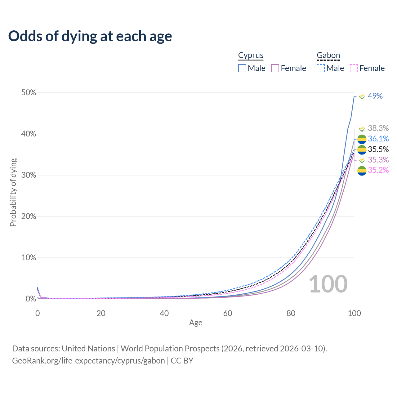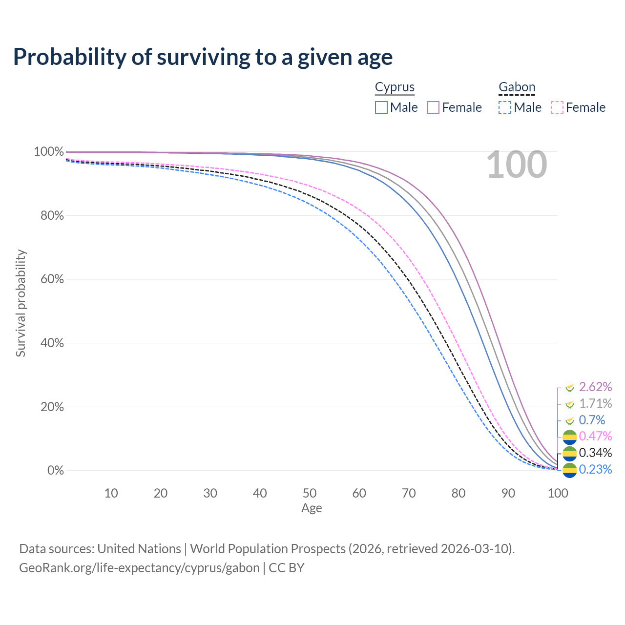 This life expectancy calculator shows the odds of living to 100, 95, 90, and below based on current age for both males and females in Cyprus and Gabon, along with mean and median age of death. The calculations are based on the 2026 life tables (actuarial tables) from the UN World Population Prospects.