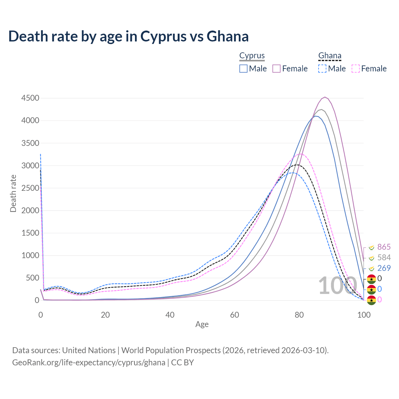 Note that this chart does not show rates per 100,000 population, as those would be skewed by age structure differences and reflect the demographics of Cyprus and Ghana more than their death rates.