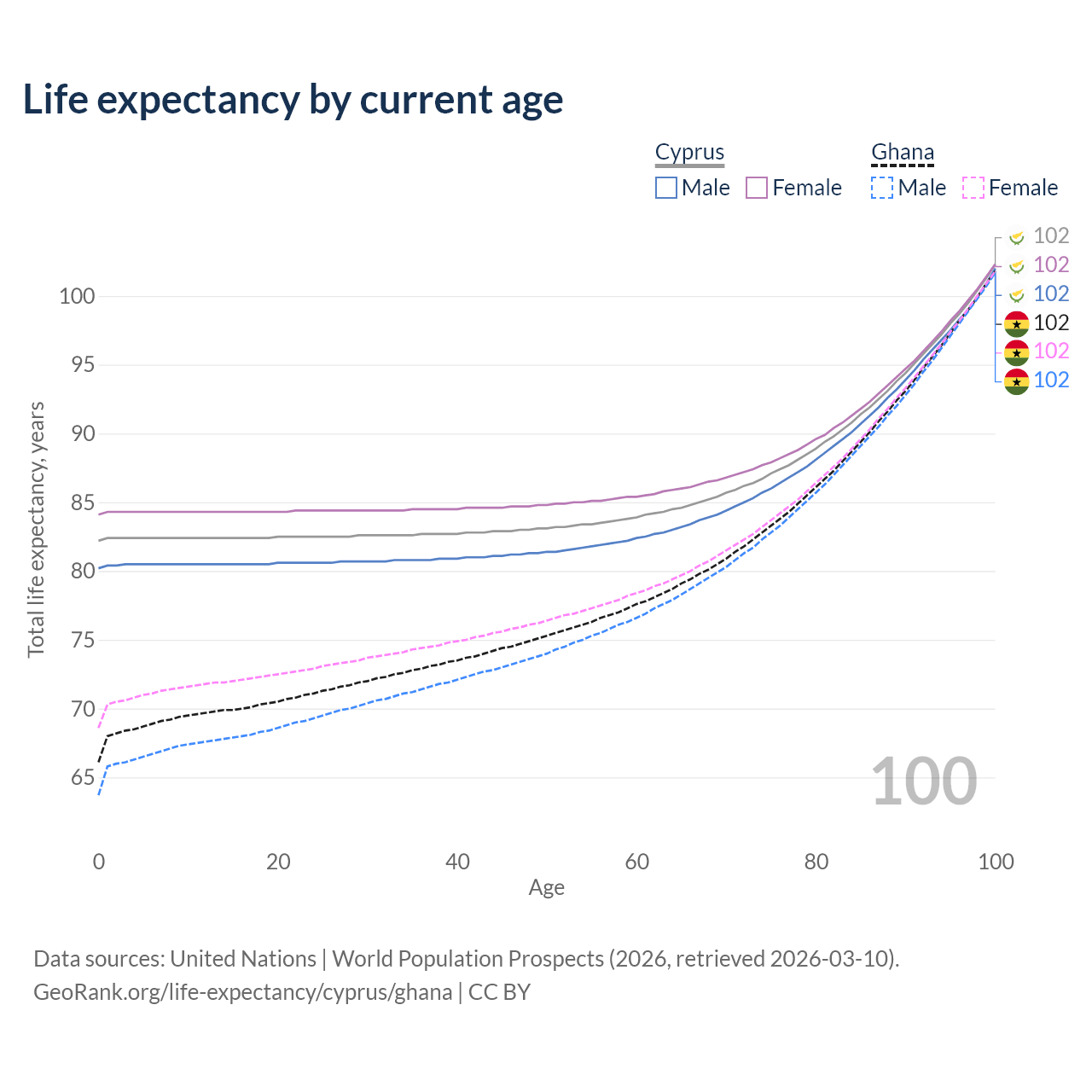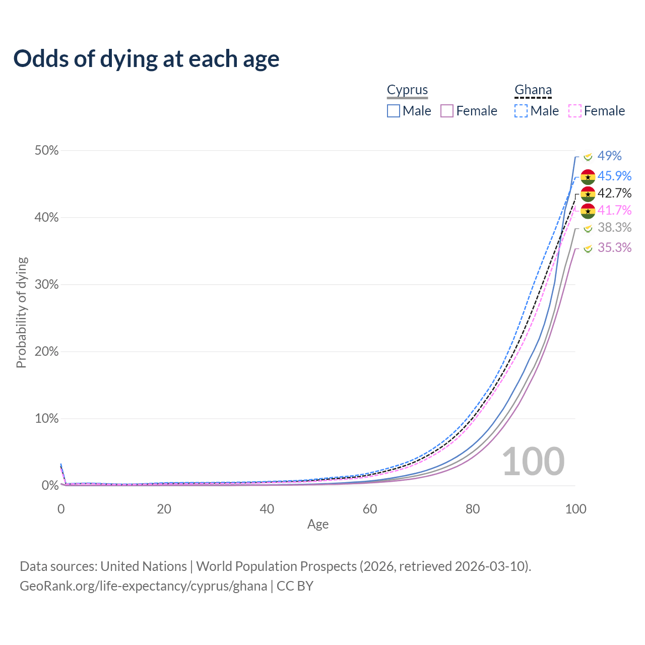This life expectancy calculator shows the odds of living to 100, 95, 90, and below based on current age for both males and females in Cyprus and Ghana, along with mean and median age of death. The calculations are based on the 2026 life tables (actuarial tables) from the UN World Population Prospects.