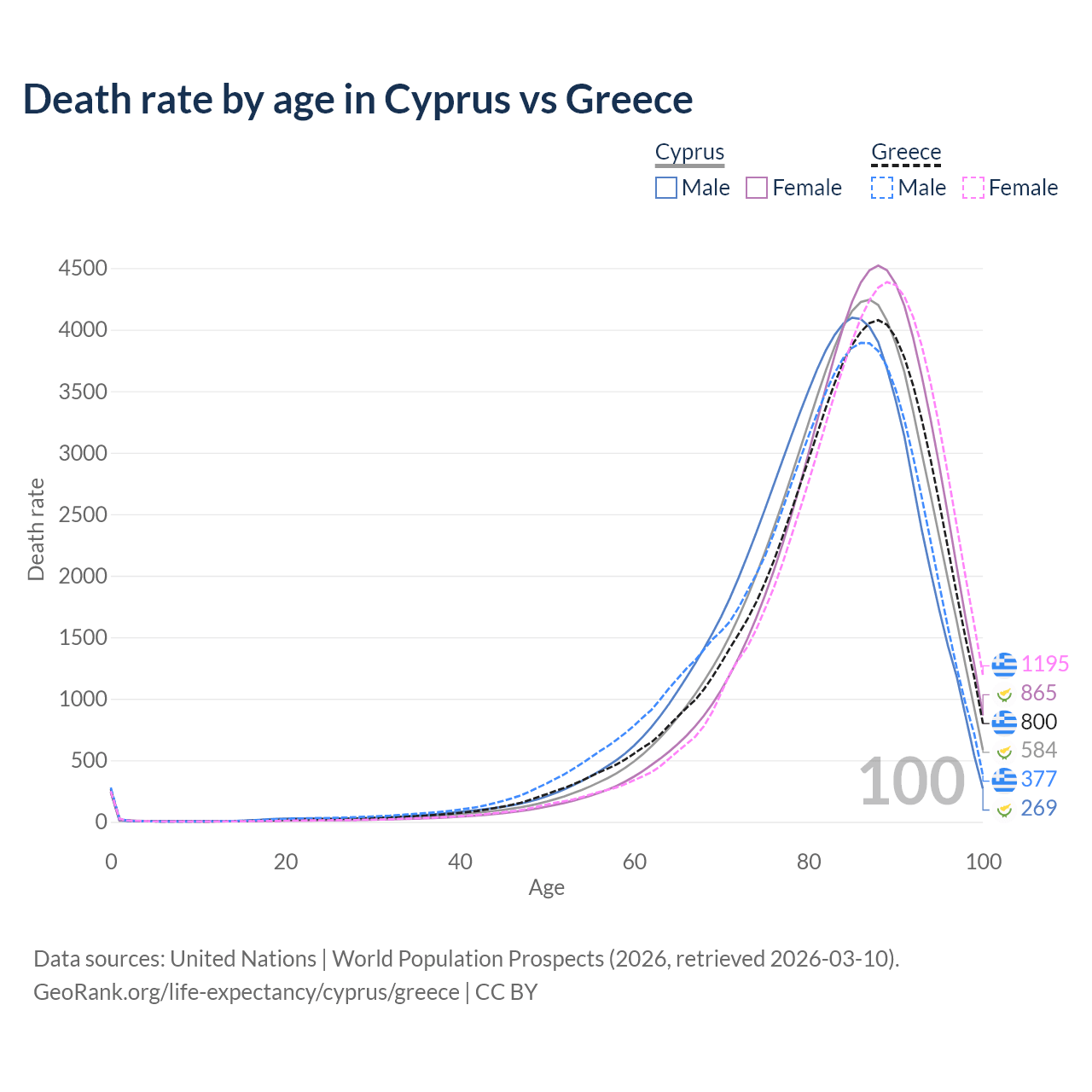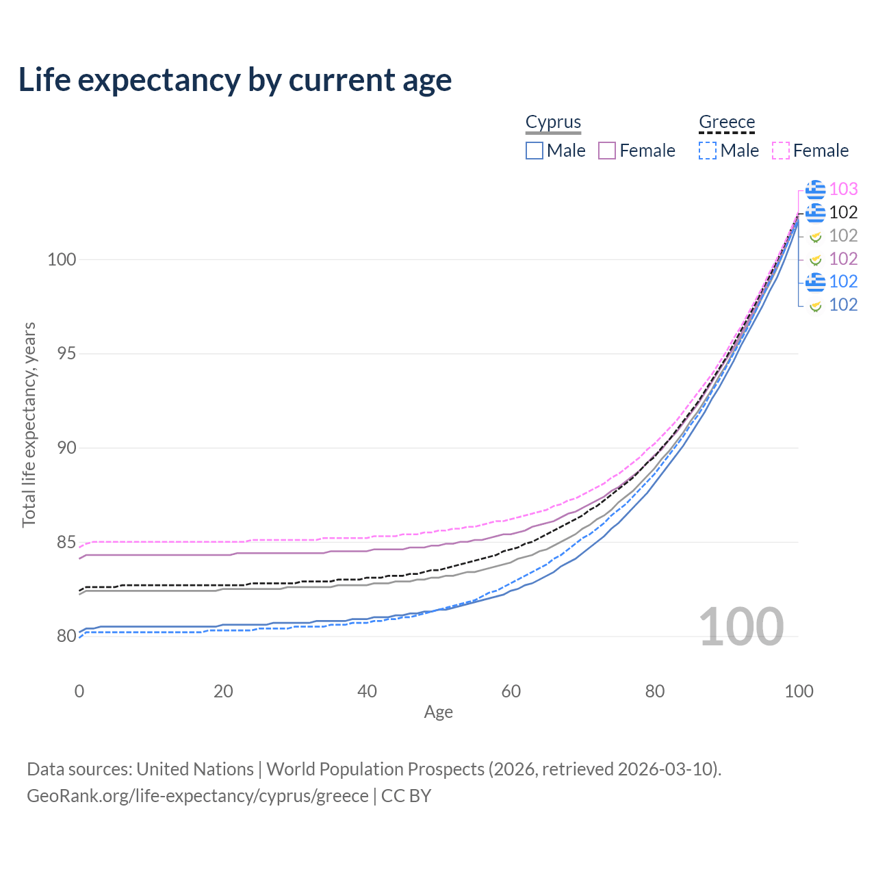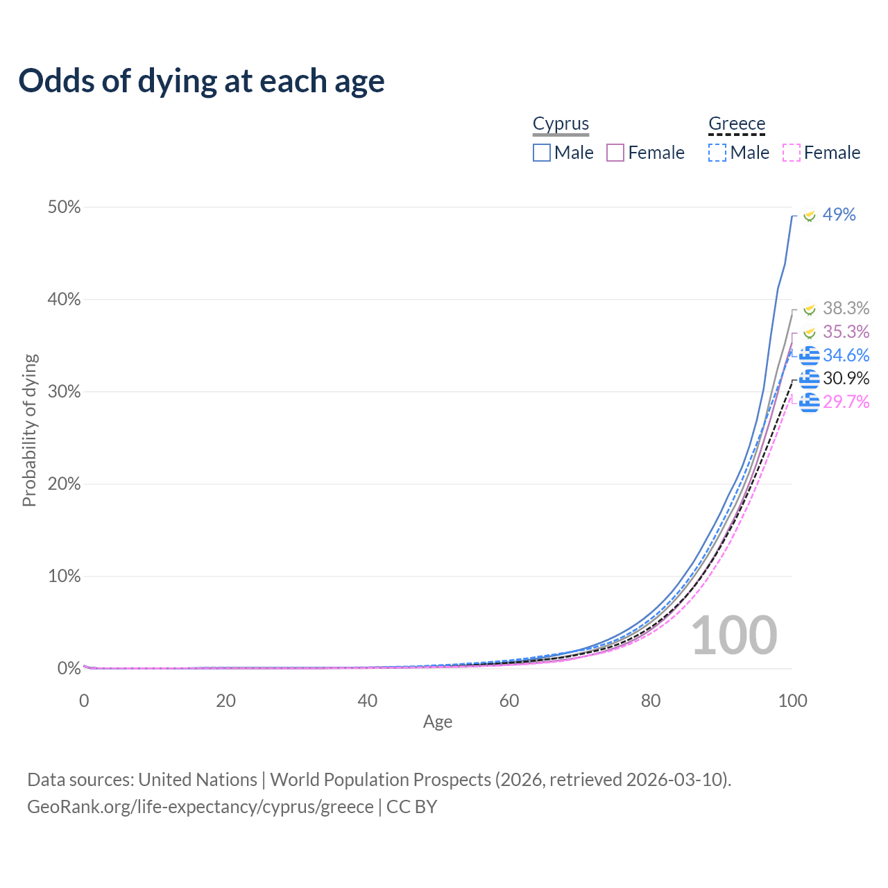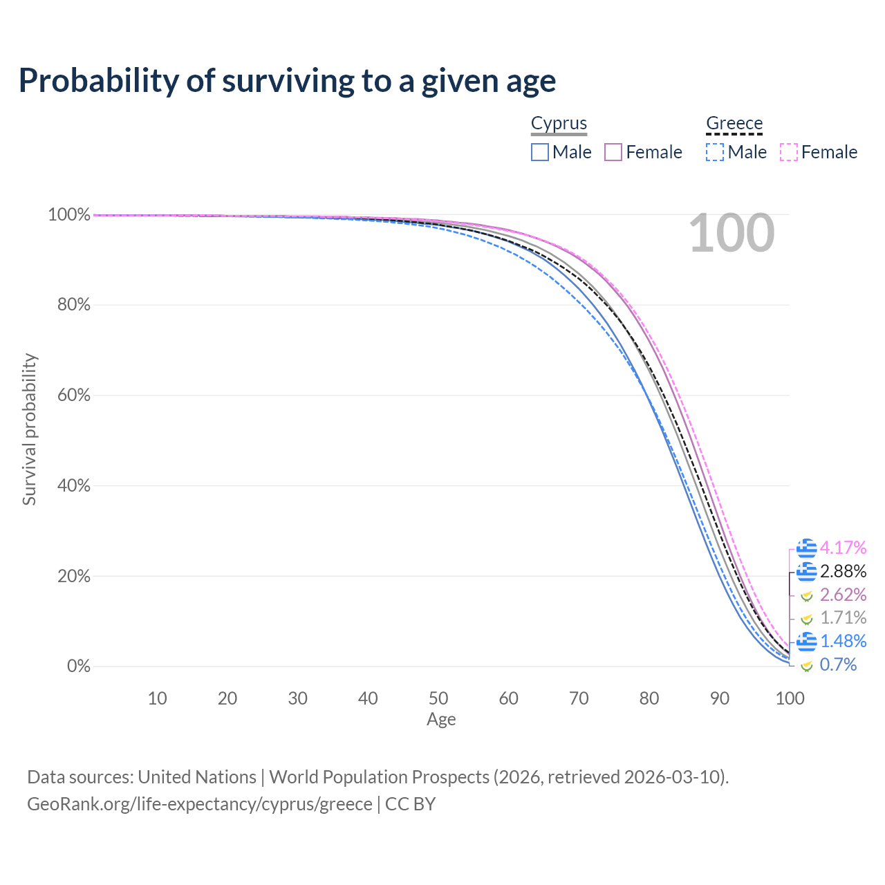 This life expectancy calculator shows the odds of living to 100, 95, 90, and below based on current age for both males and females in Cyprus and Greece, along with mean and median age of death. The calculations are based on the 2026 life tables (actuarial tables) from the UN World Population Prospects.