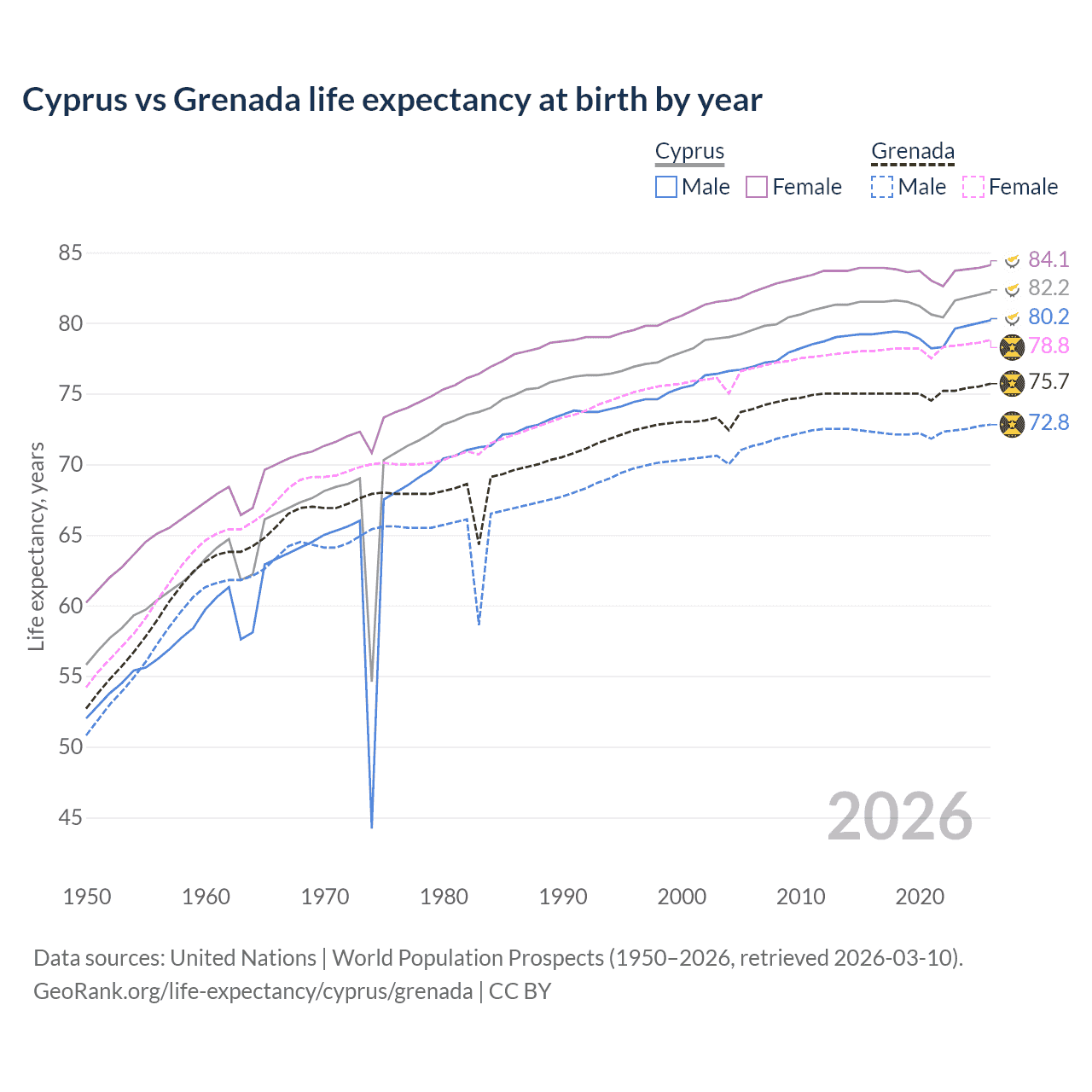 The average life expectancy at birth is 82.2 years in Cyprus vs 75.7 in Grenada. Cyprus is ranked 32/197 by life expectancy, and Grenada is 87/197. In Cyprus, the life expectancy is 80.2 years for males and 84.1 years for females. In Grenada, it's 72.8 years for males and 78.8 years for females.