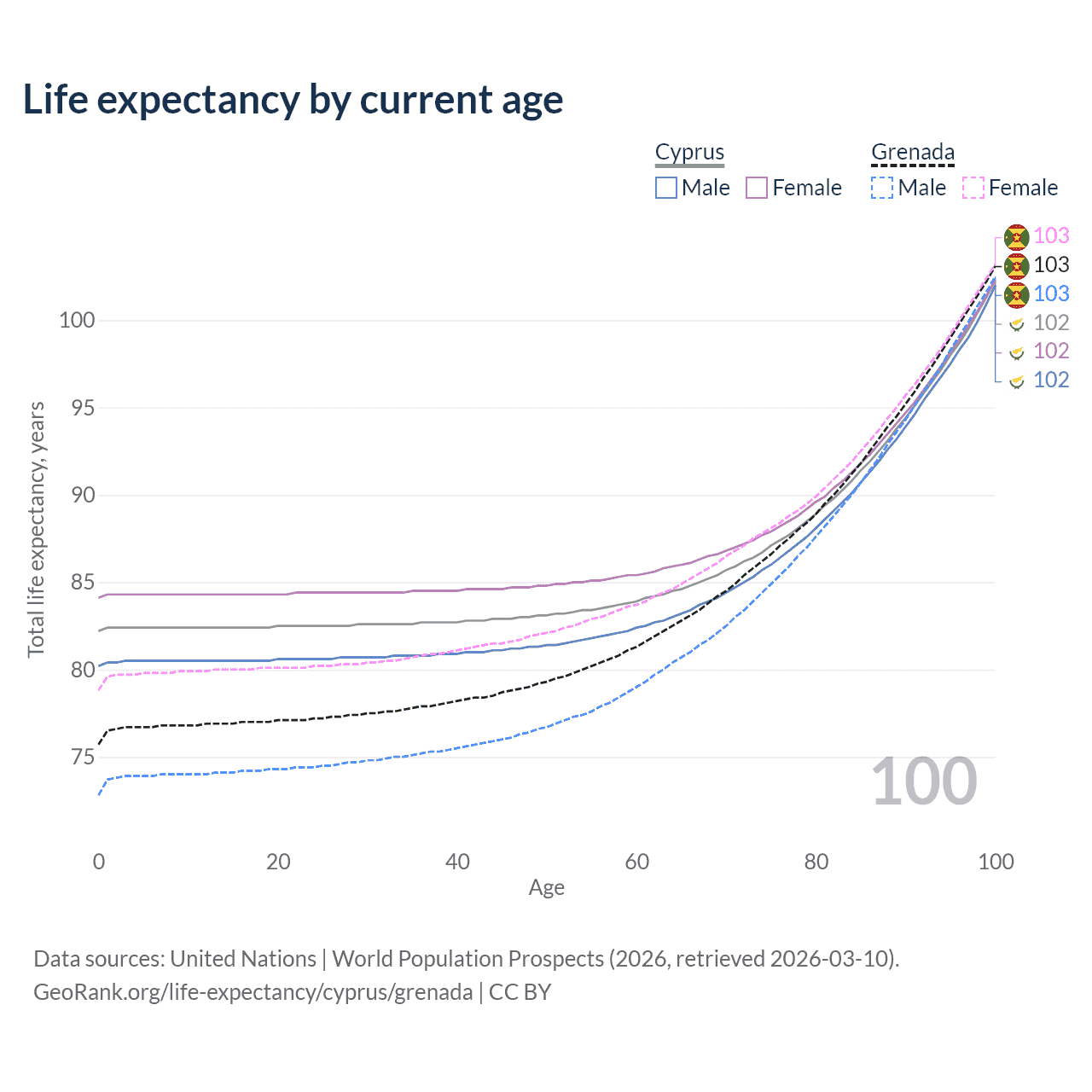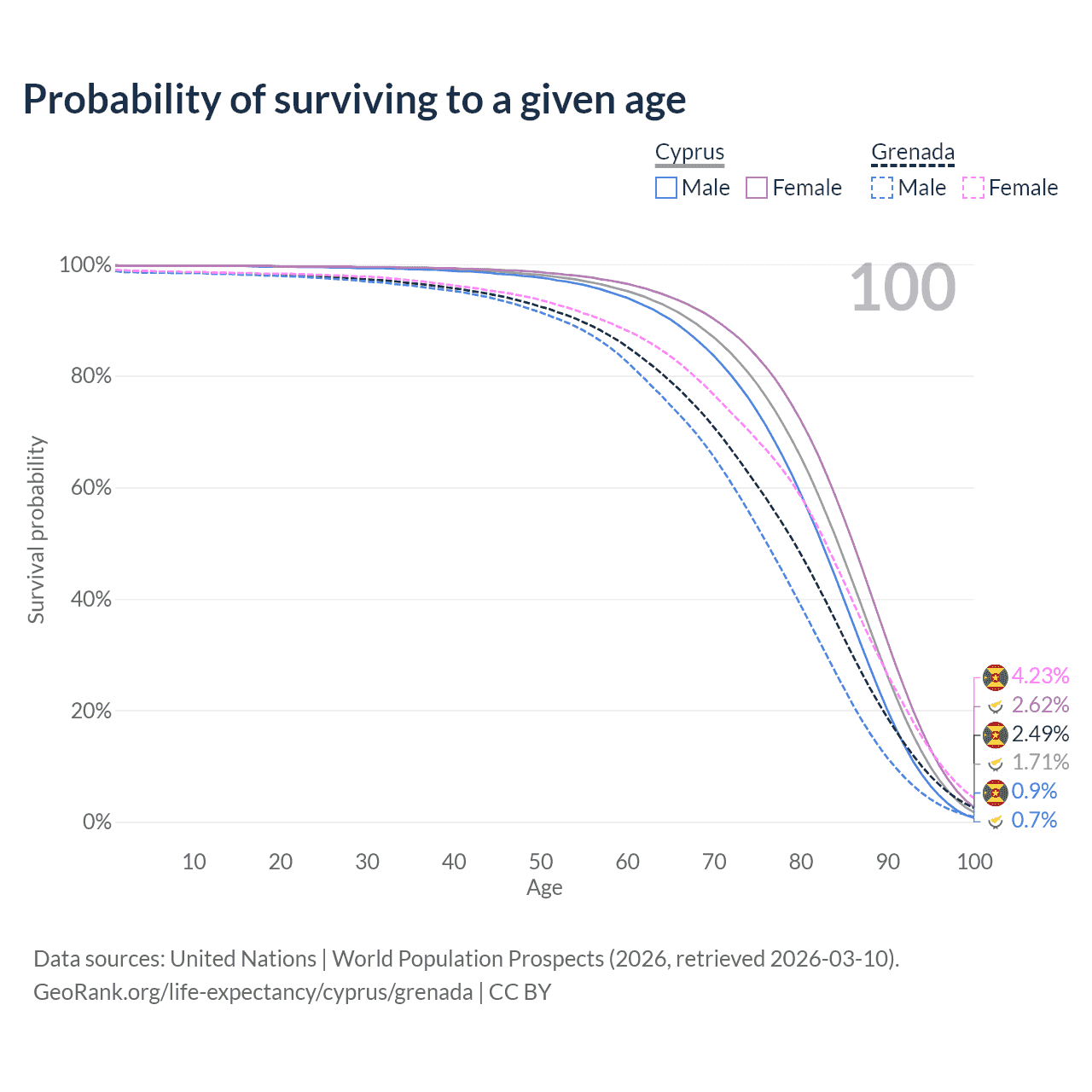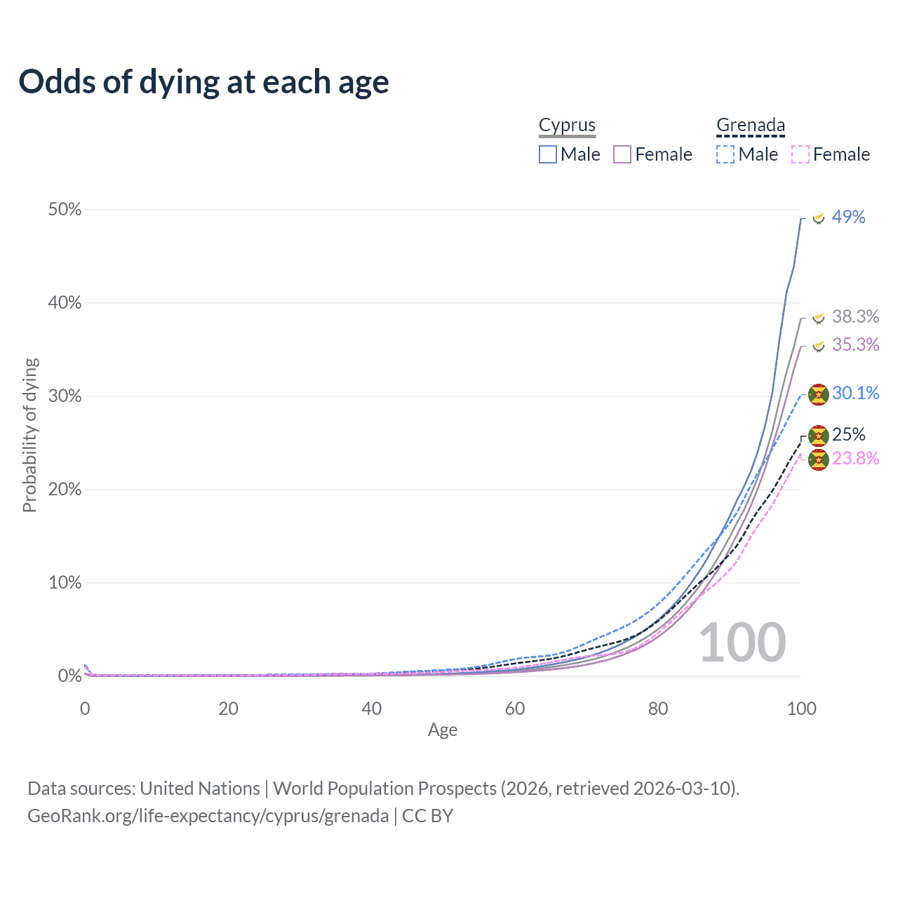This life expectancy calculator shows the odds of living to 100, 95, 90, and below based on current age for both males and females in Cyprus and Grenada, along with mean and median age of death. The calculations are based on the 2026 life tables (actuarial tables) from the UN World Population Prospects.