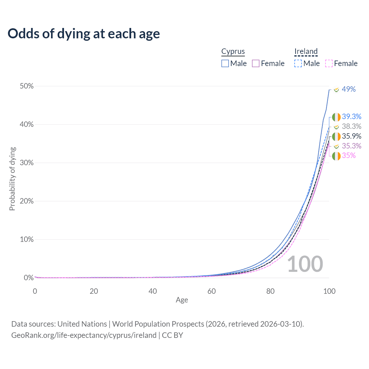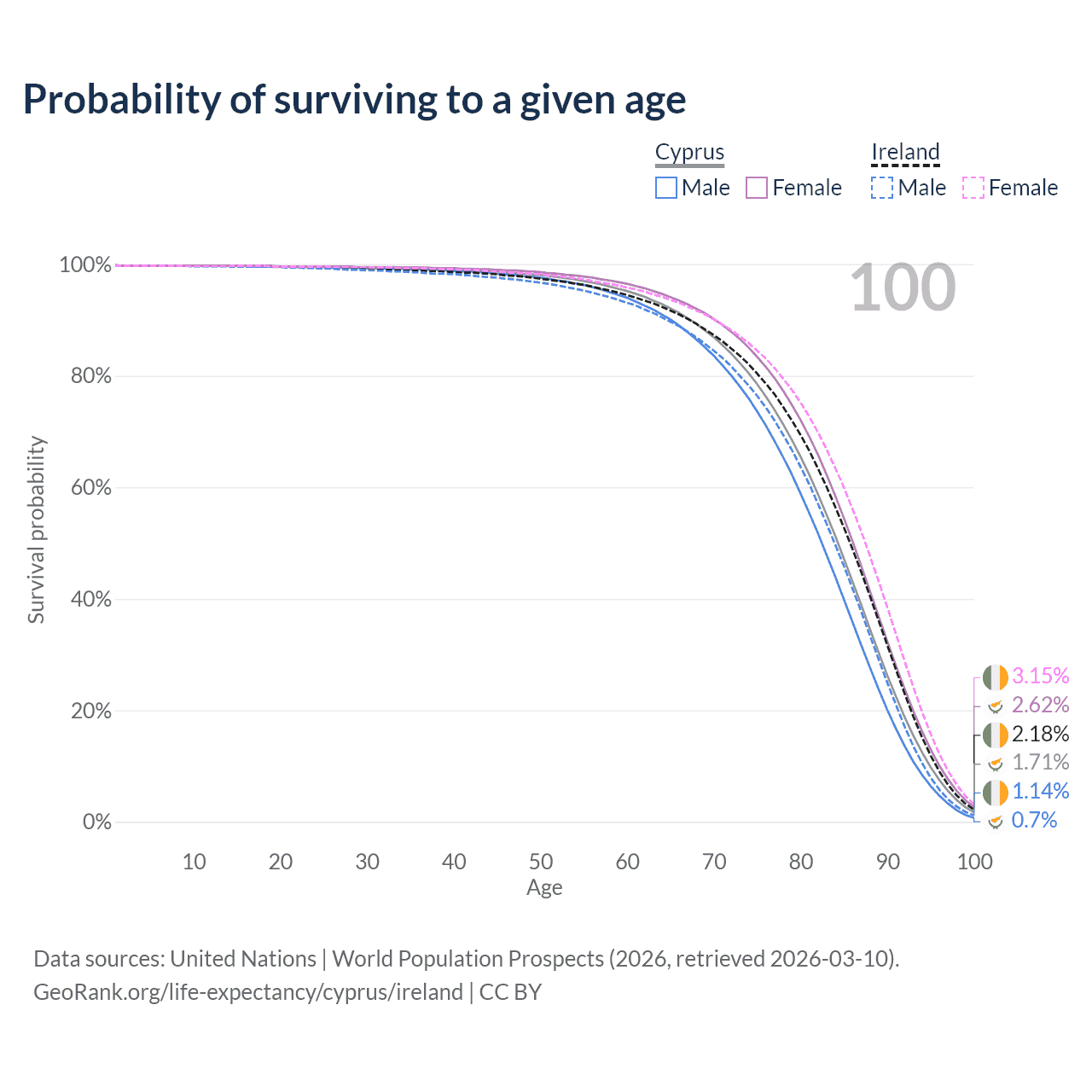This life expectancy calculator shows the odds of living to 100, 95, 90, and below based on current age for both males and females in Cyprus and Ireland, along with mean and median age of death. The calculations are based on the 2026 life tables (actuarial tables) from the UN World Population Prospects.