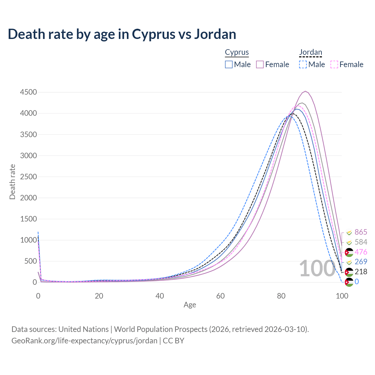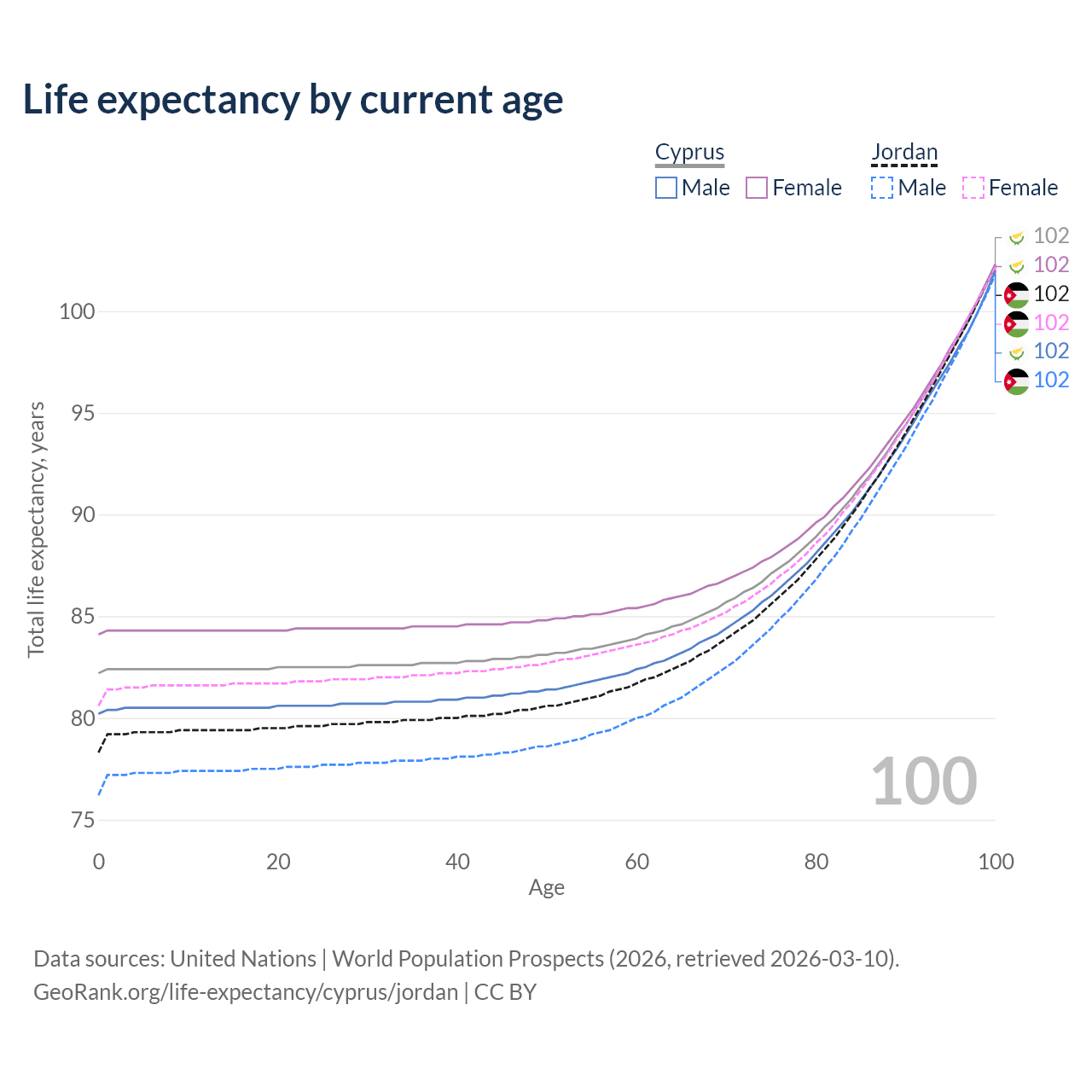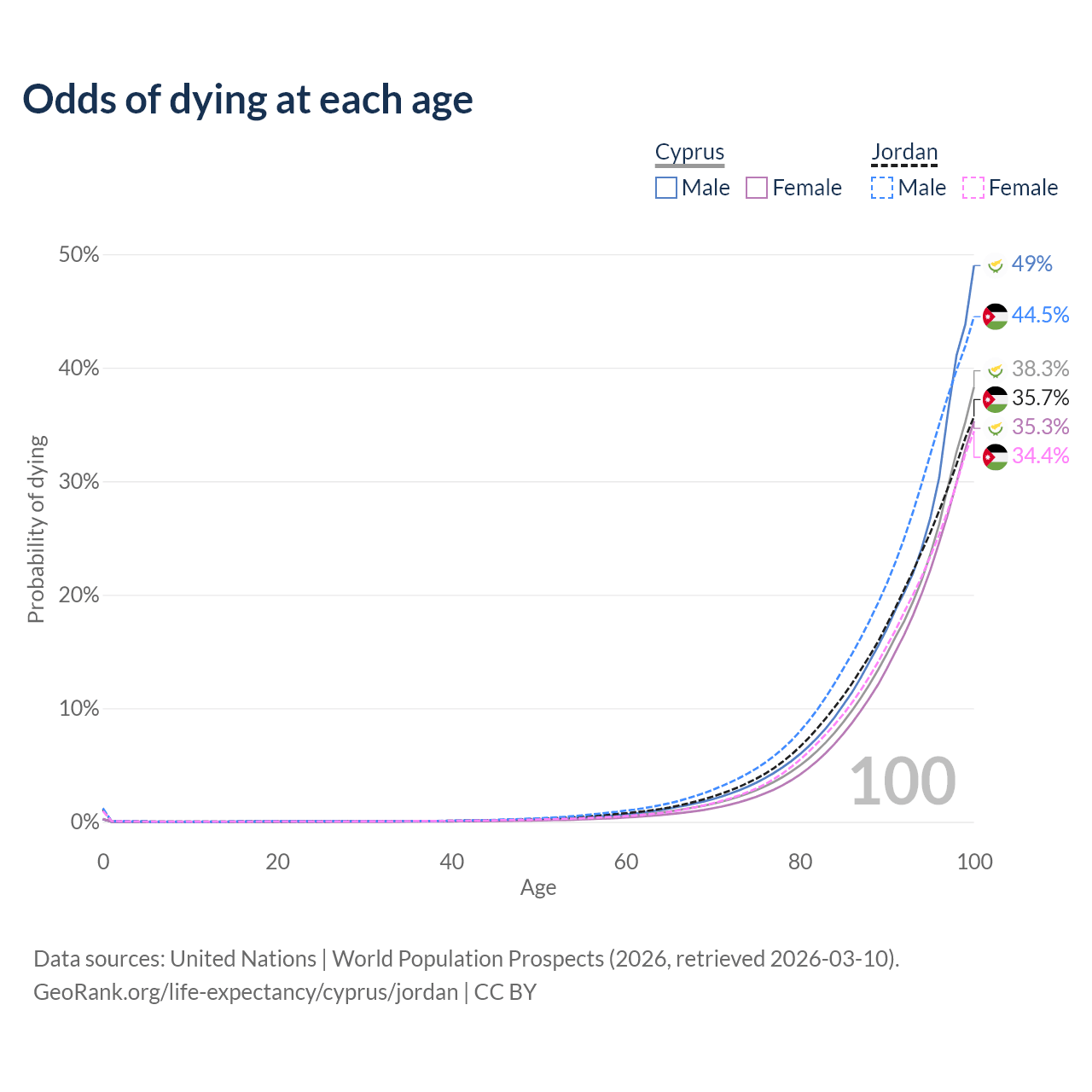 This life expectancy calculator shows the odds of living to 100, 95, 90, and below based on current age for both males and females in Cyprus and Jordan, along with mean and median age of death. The calculations are based on the 2026 life tables (actuarial tables) from the UN World Population Prospects.