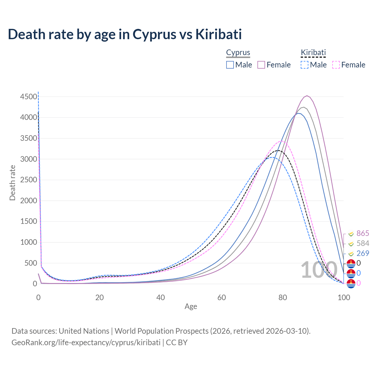 In Cyprus, the most common age of death is 87, compared to 0 in Kiribati. The median age of death is 84.3 in Cyprus and 73.1 in Kiribati, meaning only half of each cohort is expected to live past that age.