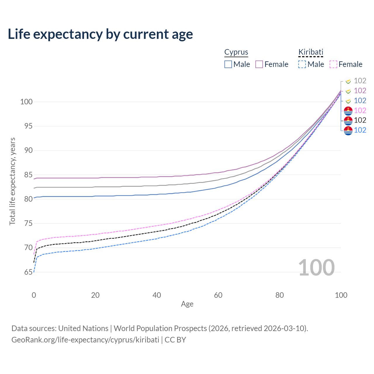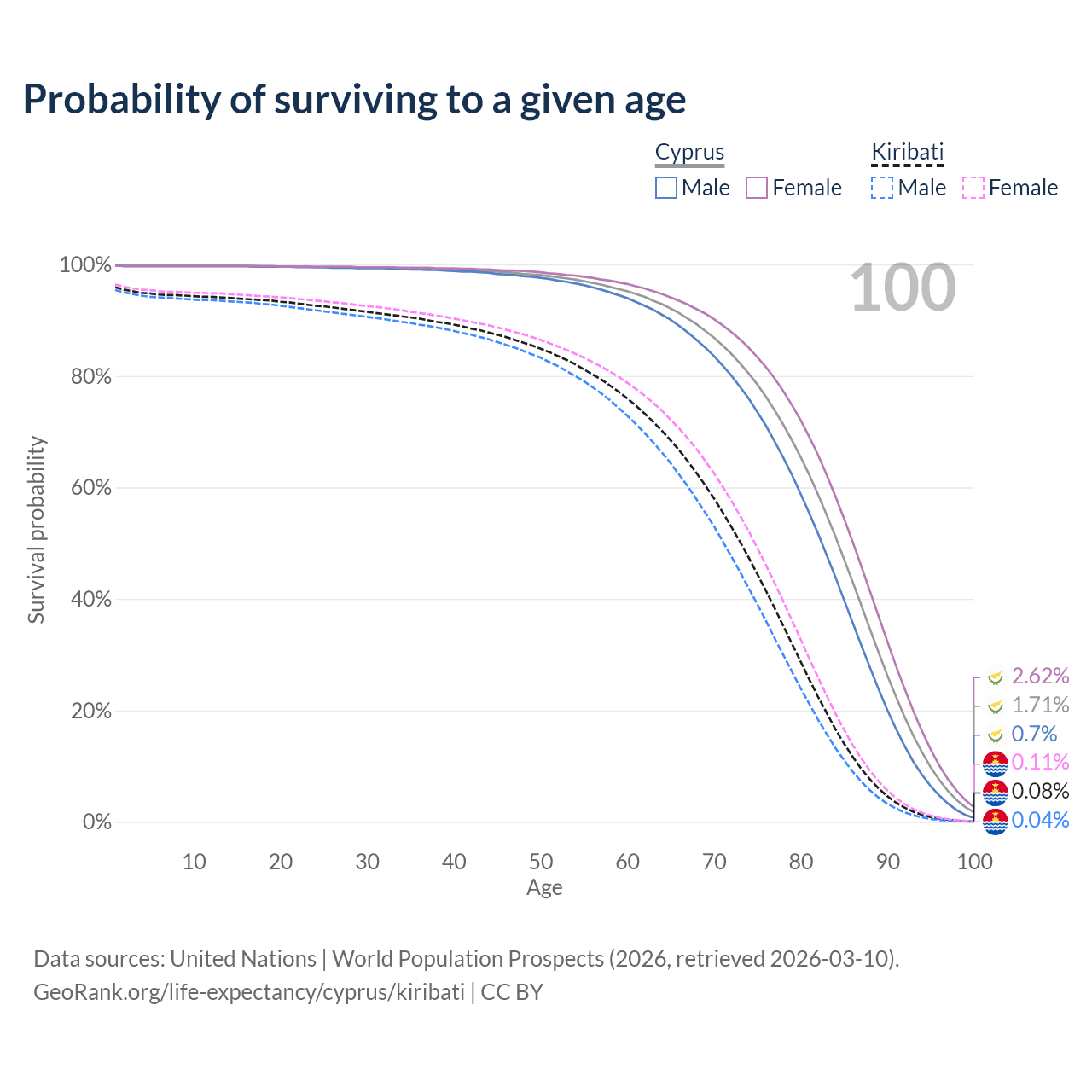 This life expectancy calculator shows the odds of living to 100, 95, 90, and below based on current age for both males and females in Cyprus and Kiribati, along with mean and median age of death. The calculations are based on the 2026 life tables (actuarial tables) from the UN World Population Prospects.
