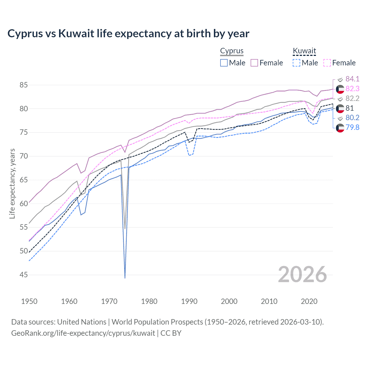 The average life expectancy at birth is 82.2 years in Cyprus vs 81 in Kuwait. Cyprus is ranked 32/197 by life expectancy, and Kuwait is 41/197. In Cyprus, the life expectancy is 80.2 years for males and 84.1 years for females. In Kuwait, it's 79.8 years for males and 82.3 years for females.