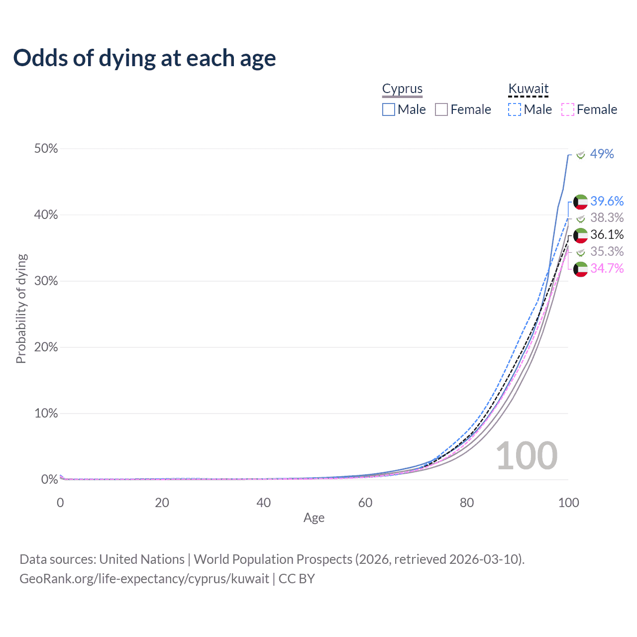 This life expectancy calculator shows the odds of living to 100, 95, 90, and below based on current age for both males and females in Cyprus and Kuwait, along with mean and median age of death. The calculations are based on the 2026 life tables (actuarial tables) from the UN World Population Prospects.