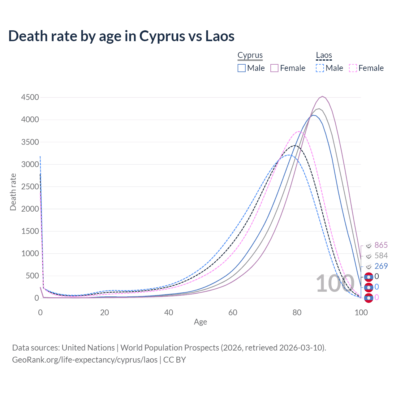 In Cyprus, the most common age of death is 87, compared to 79 in Laos. The median age of death is 84.3 in Cyprus and 74.7 in Laos, meaning only half of each cohort is expected to live past that age.