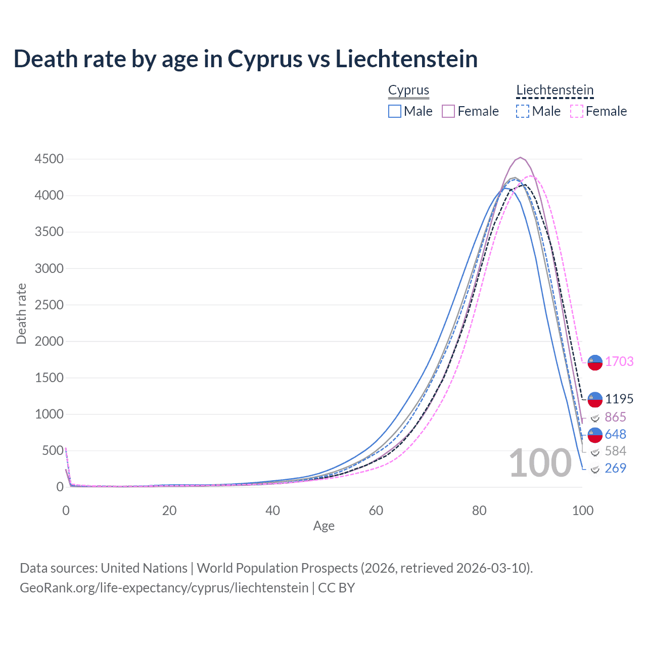 In Cyprus, the most common age of death is 87, compared to 89 in Liechtenstein. The median age of death is 84.3 in Cyprus and 86.3 in Liechtenstein, meaning only half of each cohort is expected to live past that age.