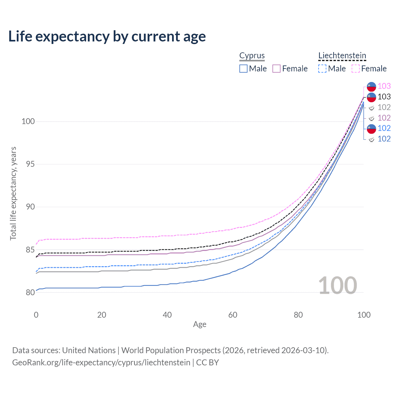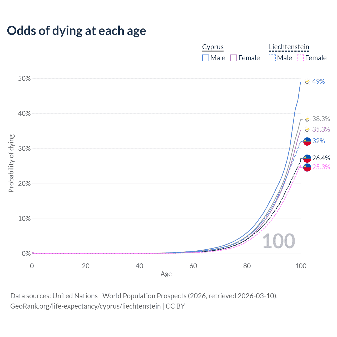 This life expectancy calculator shows the odds of living to 100, 95, 90, and below based on current age for both males and females in Cyprus and Liechtenstein, along with mean and median age of death. The calculations are based on the 2026 life tables (actuarial tables) from the UN World Population Prospects.