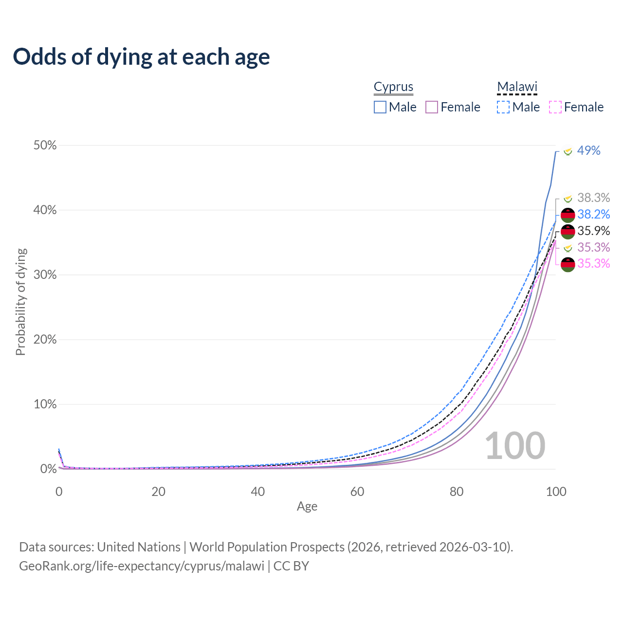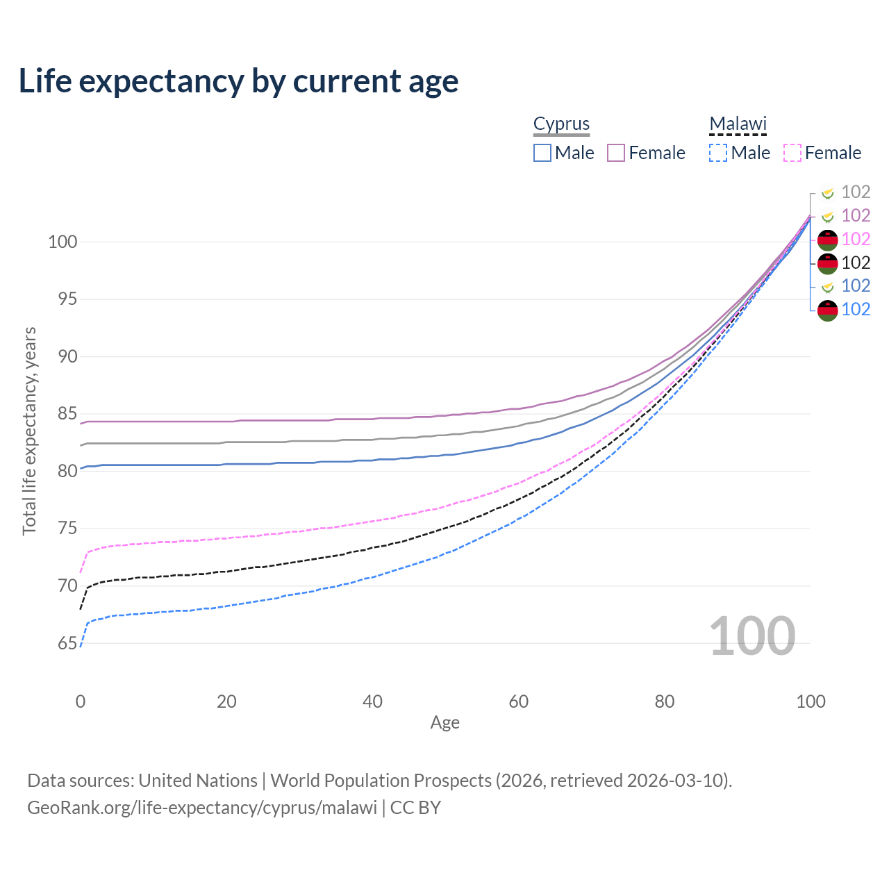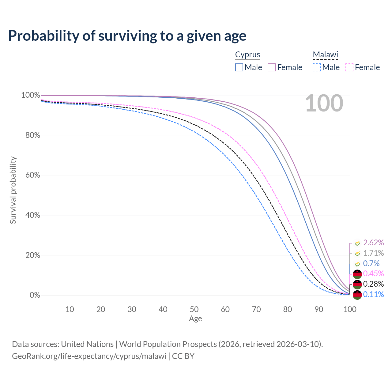 This life expectancy calculator shows the odds of living to 100, 95, 90, and below based on current age for both males and females in Cyprus and Malawi, along with mean and median age of death. The calculations are based on the 2026 life tables (actuarial tables) from the UN World Population Prospects.