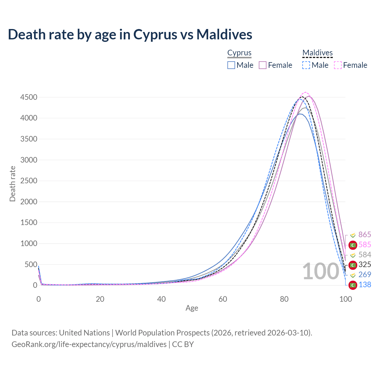 In Cyprus, the most common age of death is 87, compared to 86 in Maldives. The median age of death is 84.3 in Cyprus and 83.8 in Maldives, meaning only half of each cohort is expected to live past that age.
