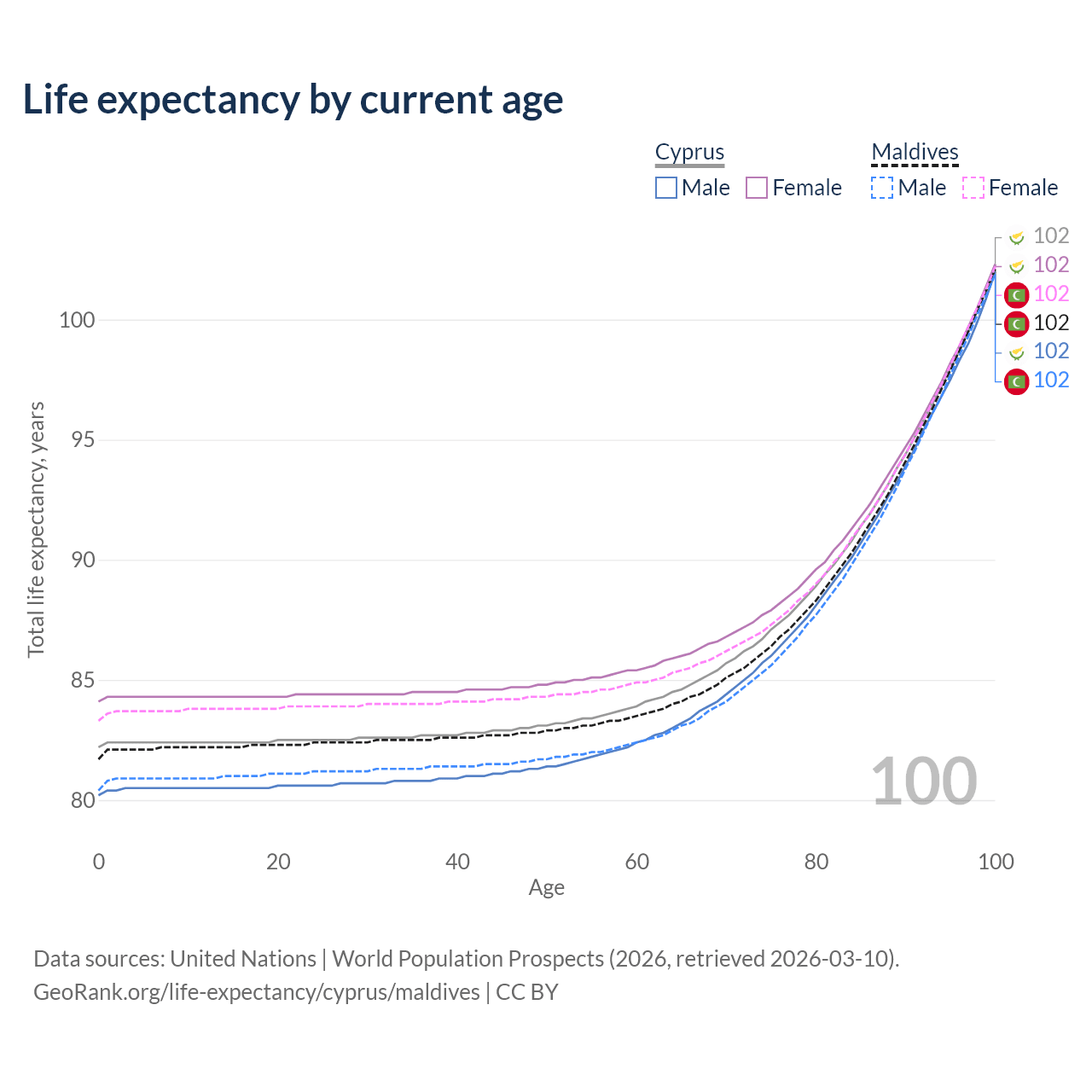 This life expectancy calculator shows the odds of living to 100, 95, 90, and below based on current age for both males and females in Cyprus and Maldives, along with mean and median age of death. The calculations are based on the 2026 life tables (actuarial tables) from the UN World Population Prospects.