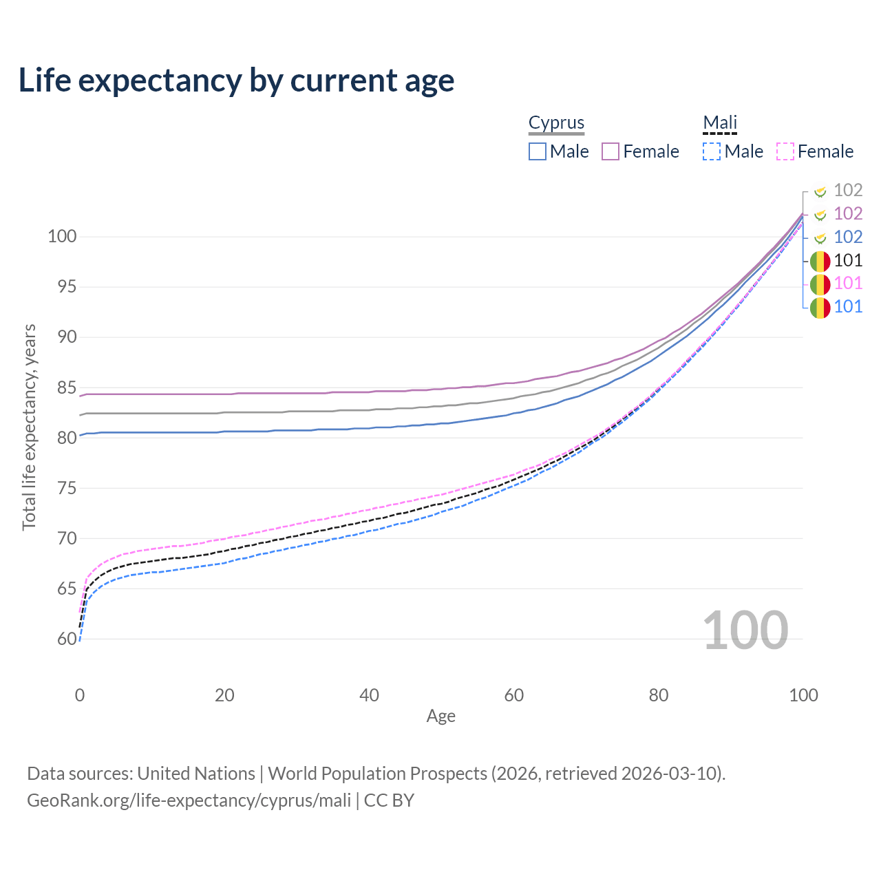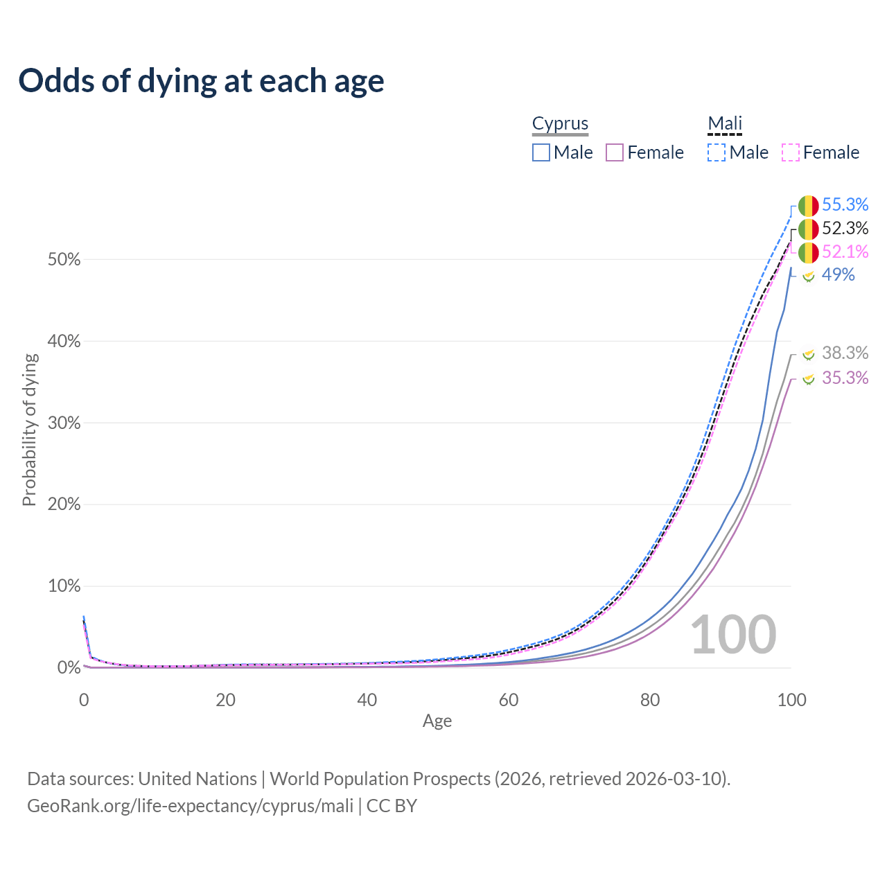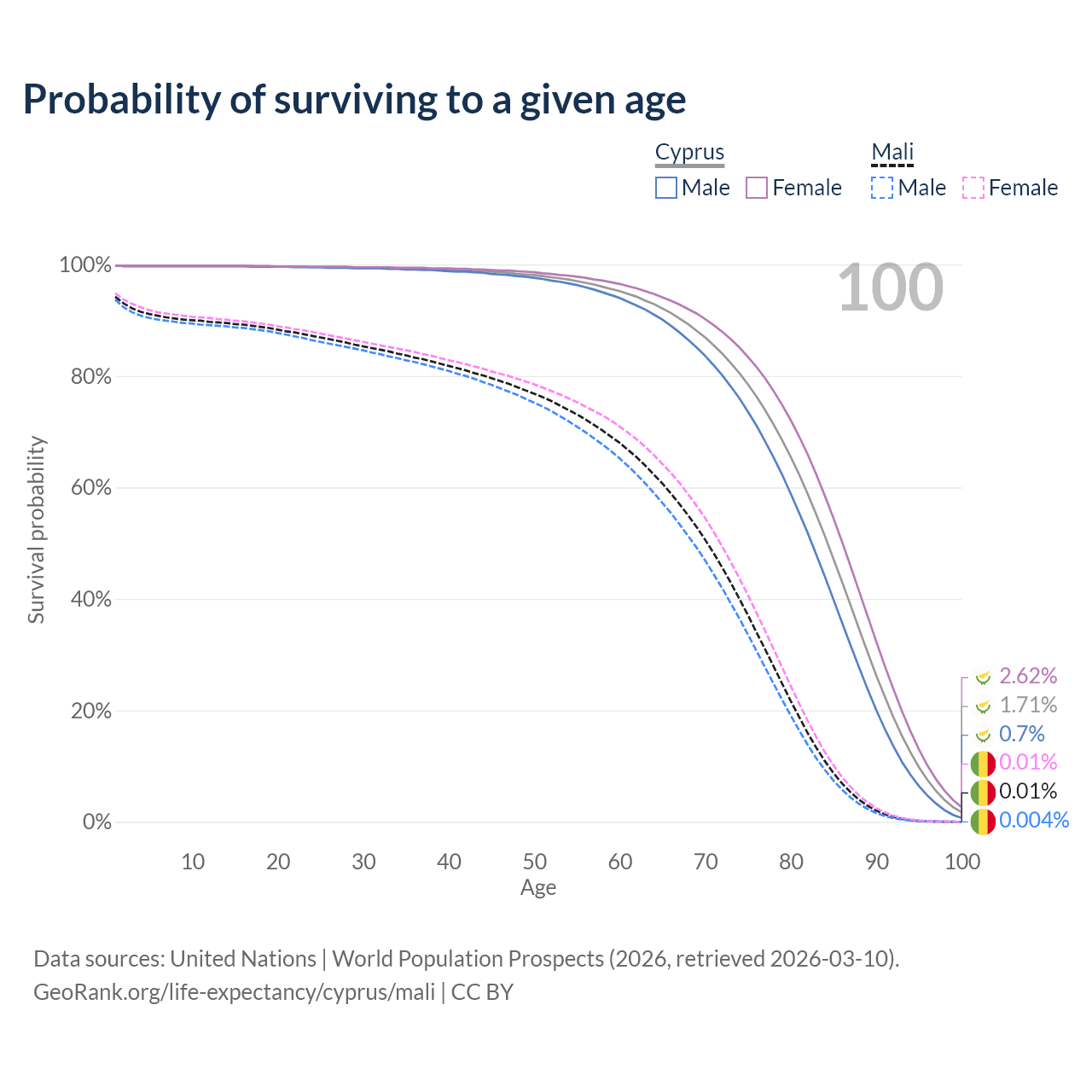 This life expectancy calculator shows the odds of living to 100, 95, 90, and below based on current age for both males and females in Cyprus and Mali, along with mean and median age of death. The calculations are based on the 2026 life tables (actuarial tables) from the UN World Population Prospects.