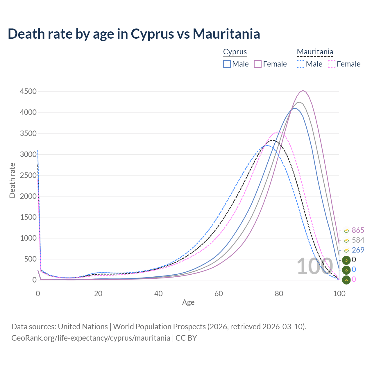 In Cyprus, the most common age of death is 87, compared to 78 in Mauritania. The median age of death is 84.3 in Cyprus and 74.1 in Mauritania, meaning only half of each cohort is expected to live past that age.