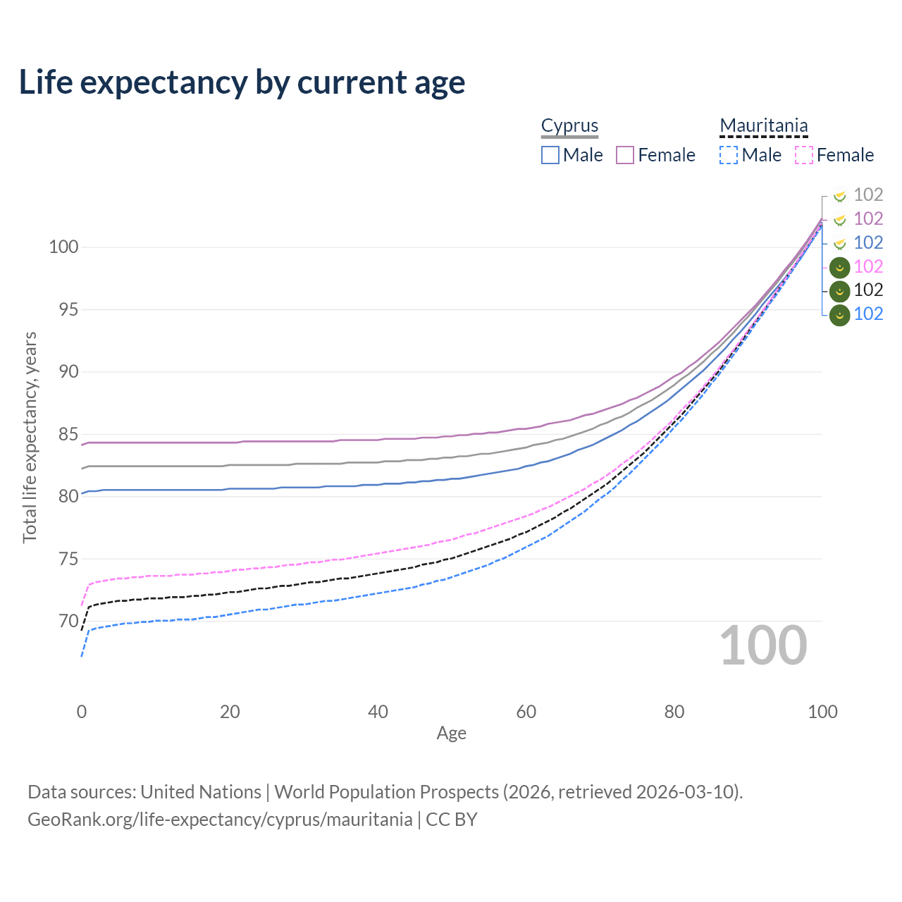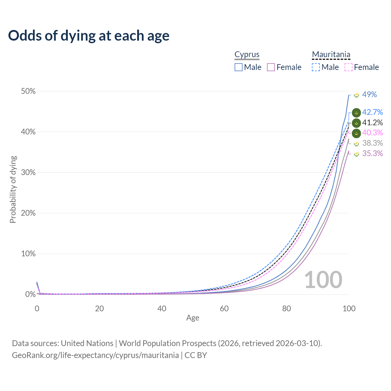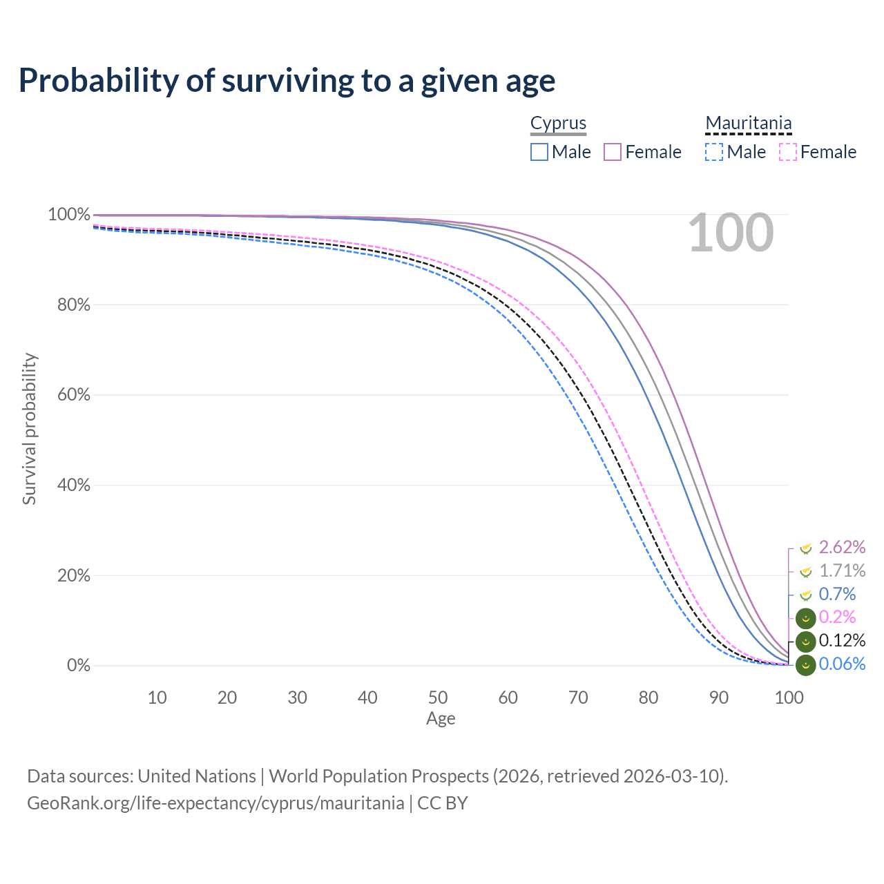 This life expectancy calculator shows the odds of living to 100, 95, 90, and below based on current age for both males and females in Cyprus and Mauritania, along with mean and median age of death. The calculations are based on the 2026 life tables (actuarial tables) from the UN World Population Prospects.