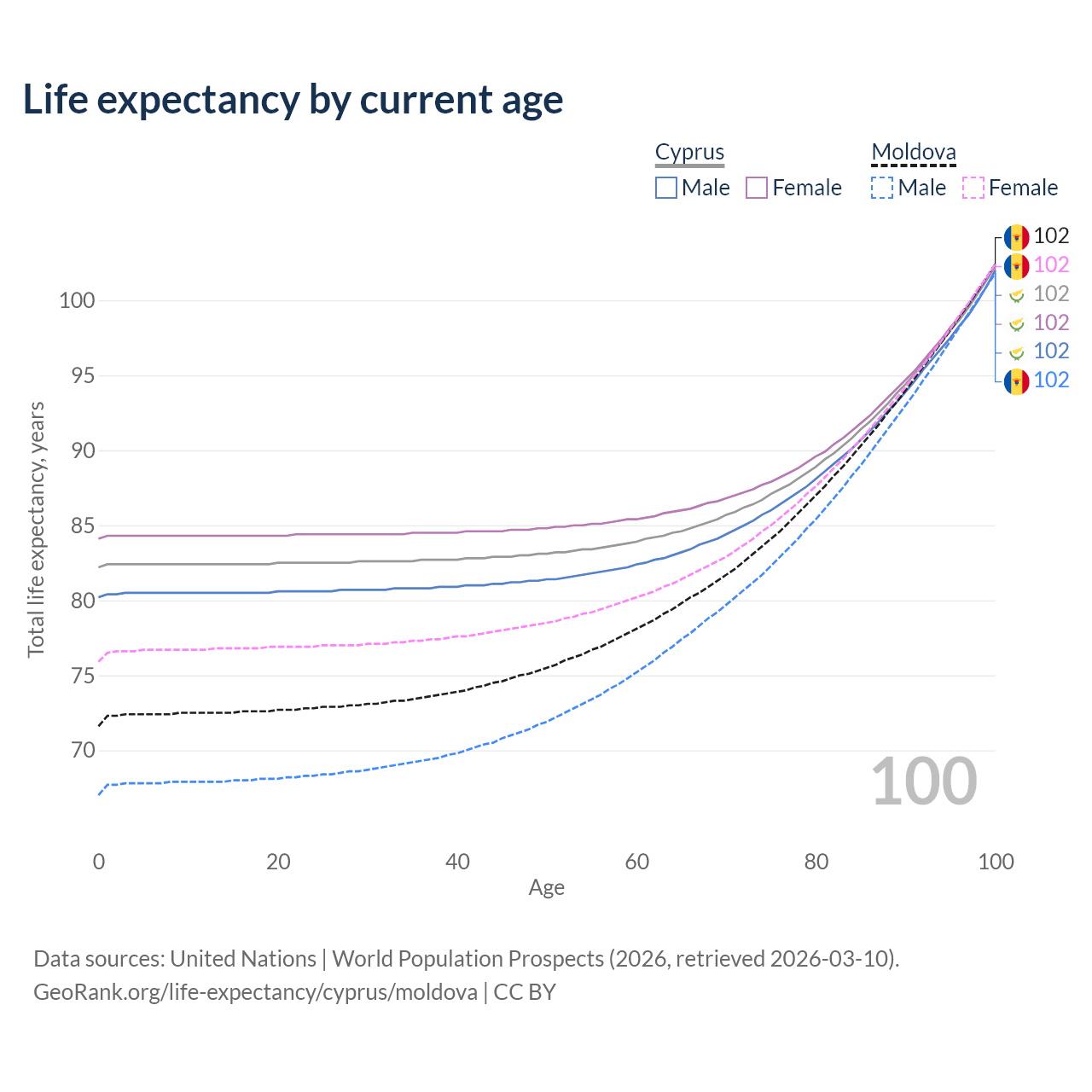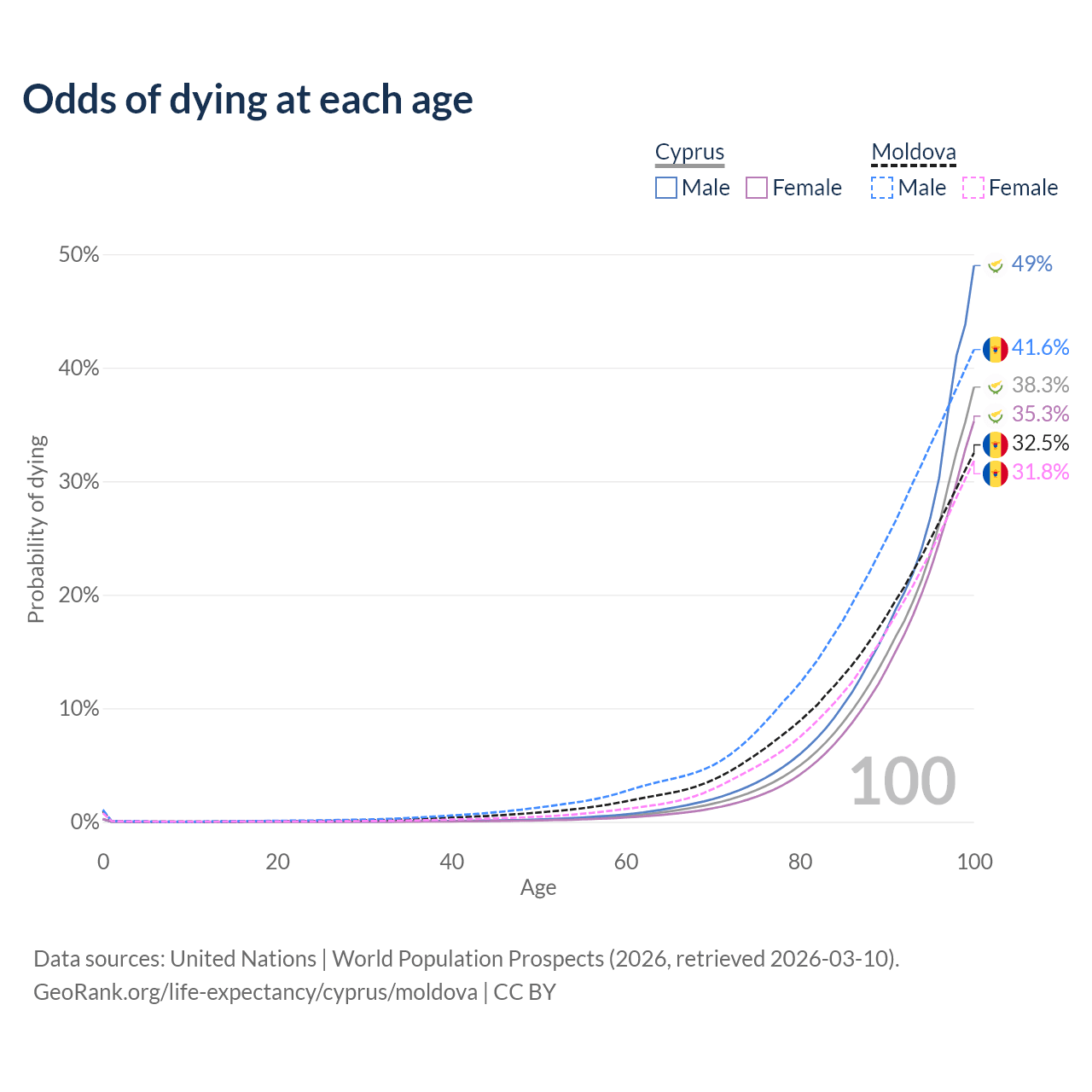 This life expectancy calculator shows the odds of living to 100, 95, 90, and below based on current age for both males and females in Cyprus and Moldova, along with mean and median age of death. The calculations are based on the 2026 life tables (actuarial tables) from the UN World Population Prospects.