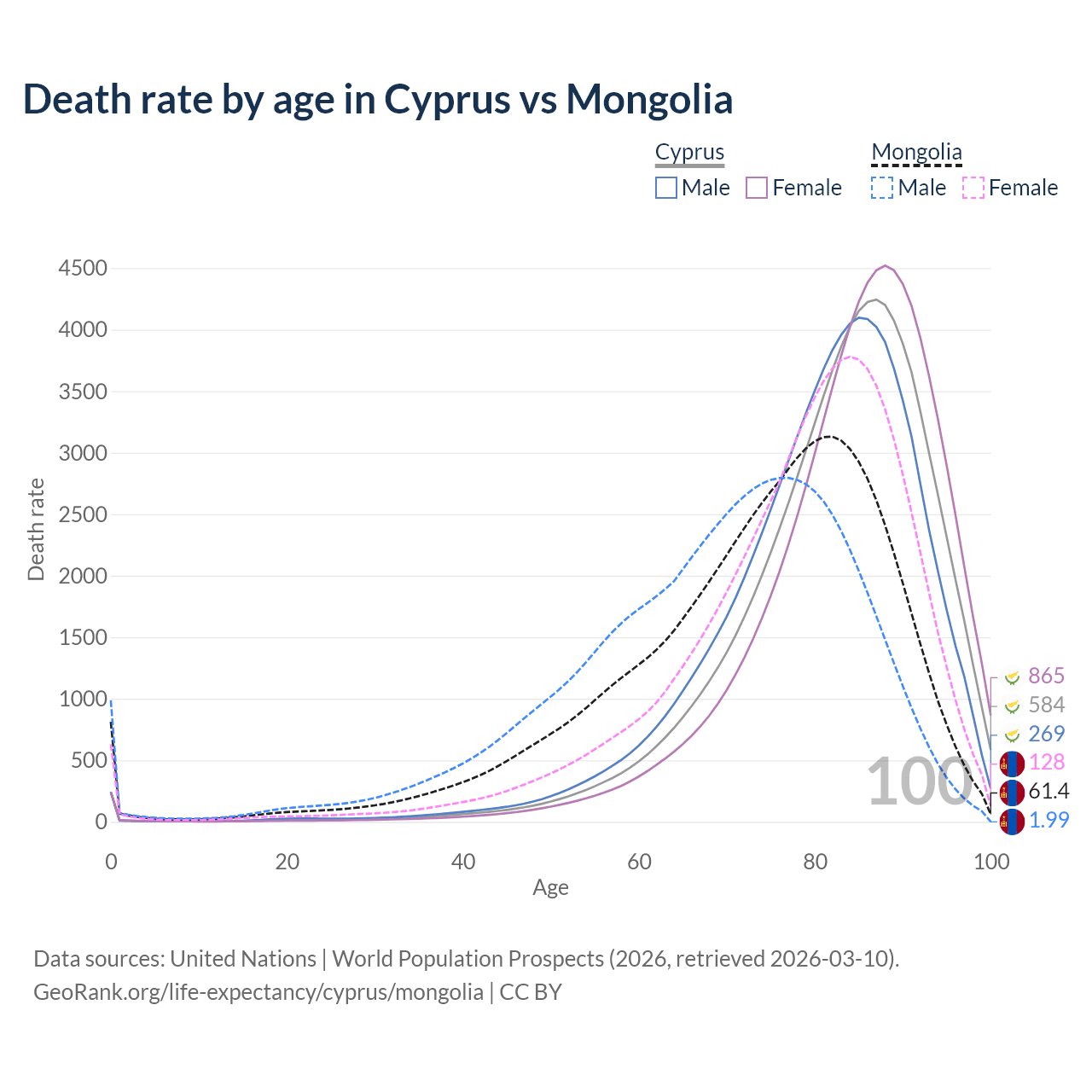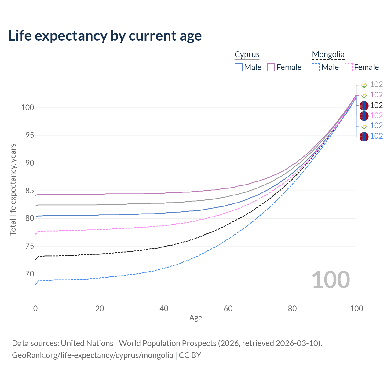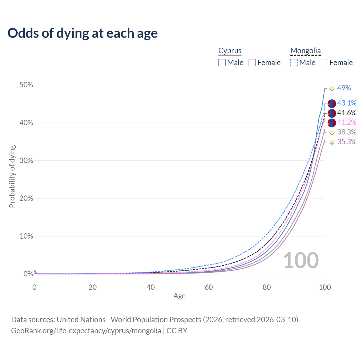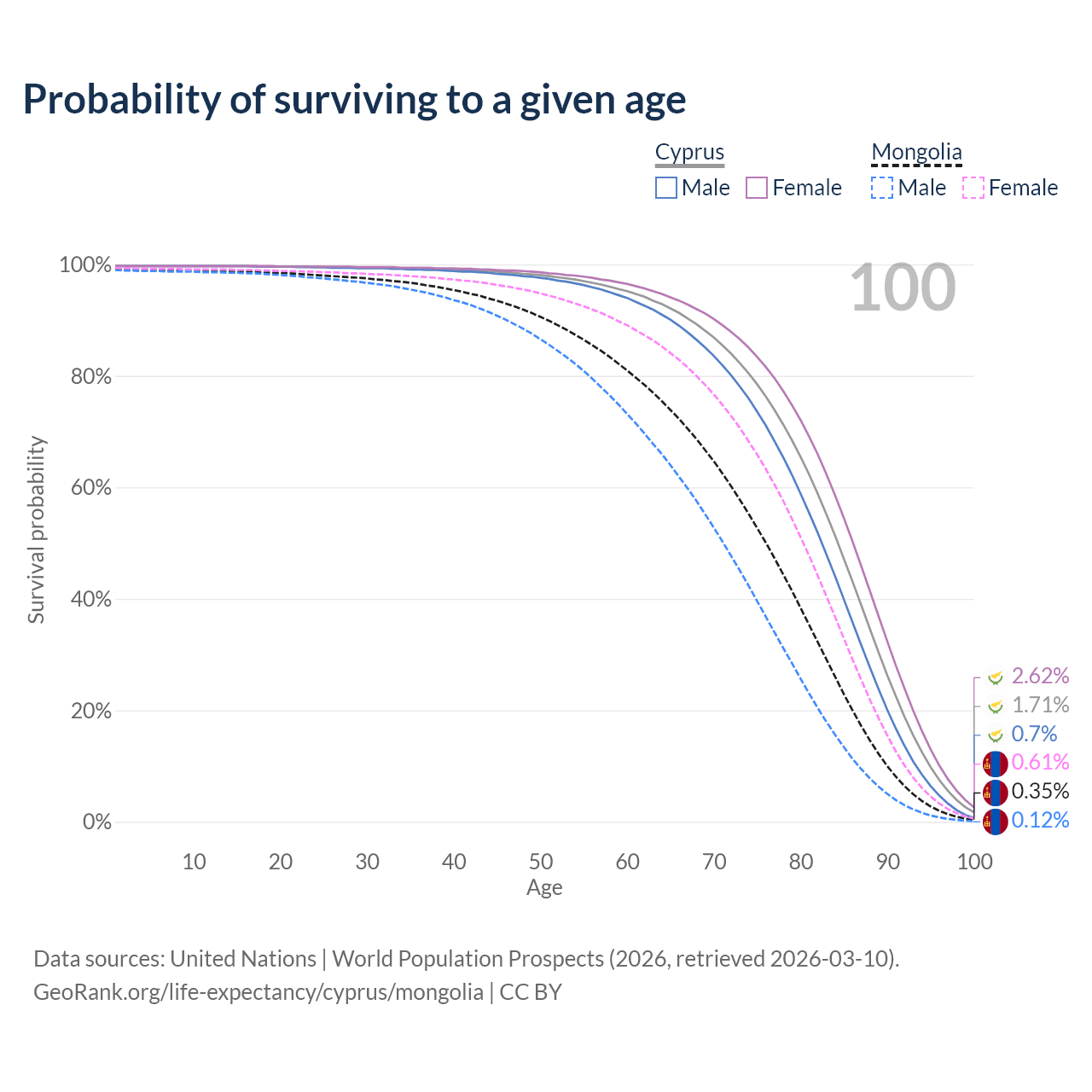This life expectancy calculator shows the odds of living to 100, 95, 90, and below based on current age for both males and females in Cyprus and Mongolia, along with mean and median age of death. The calculations are based on the 2026 life tables (actuarial tables) from the UN World Population Prospects.