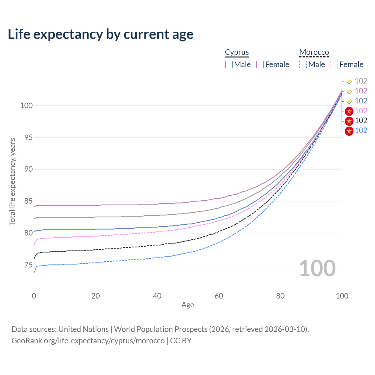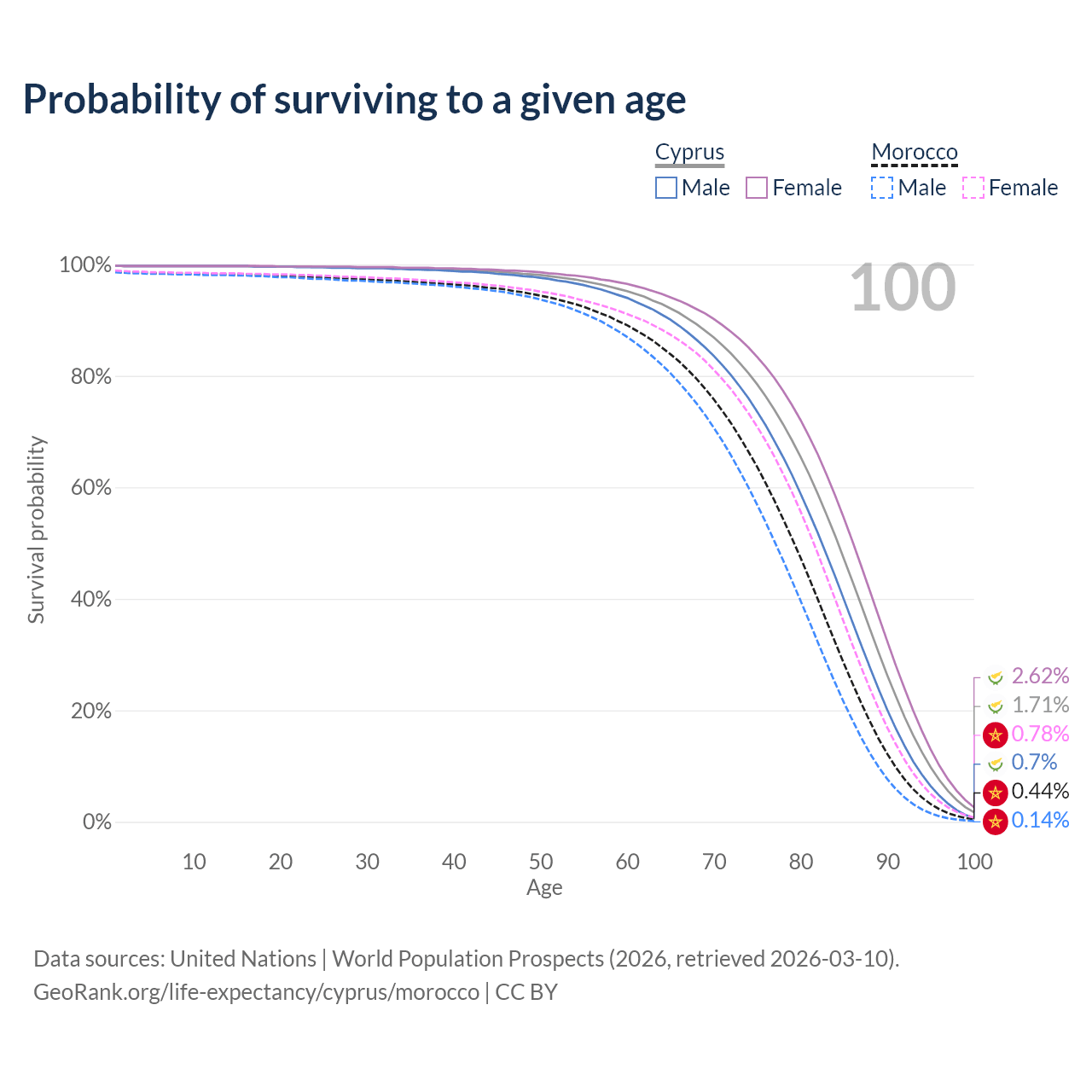 This life expectancy calculator shows the odds of living to 100, 95, 90, and below based on current age for both males and females in Cyprus and Morocco, along with mean and median age of death. The calculations are based on the 2026 life tables (actuarial tables) from the UN World Population Prospects.
