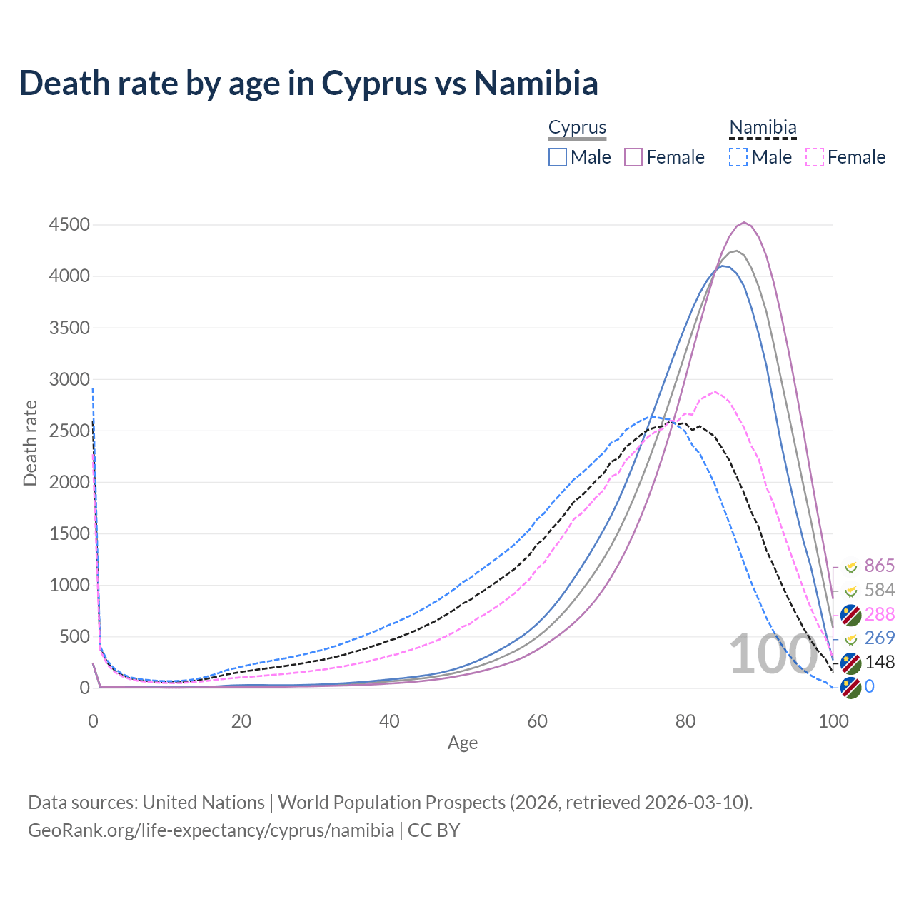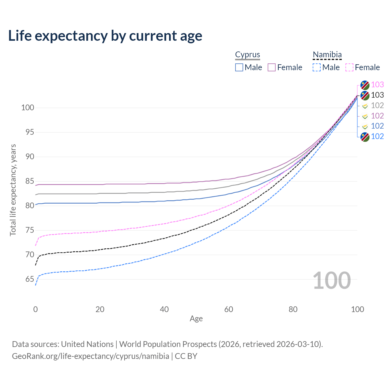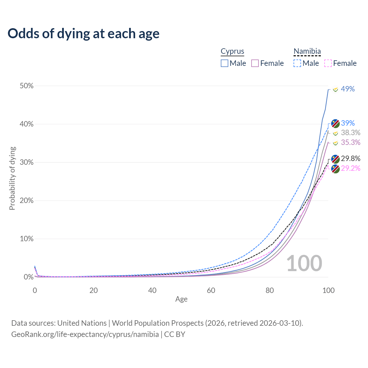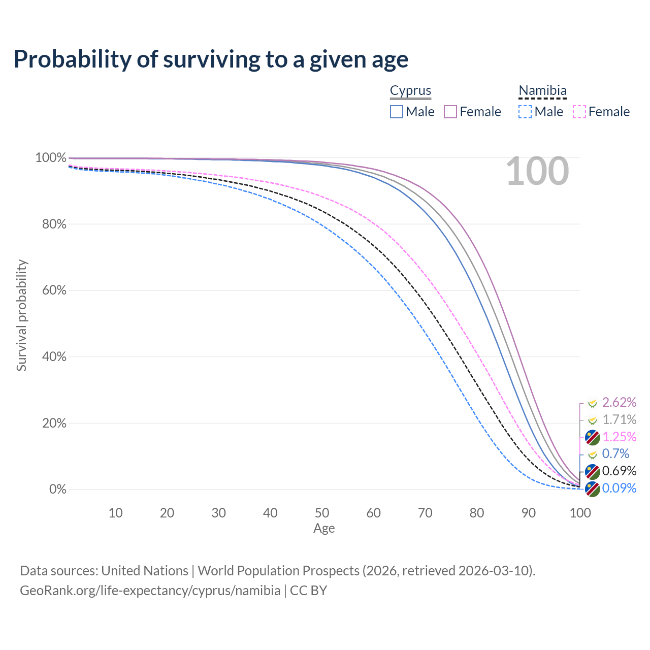 This life expectancy calculator shows the odds of living to 100, 95, 90, and below based on current age for both males and females in Cyprus and Namibia, along with mean and median age of death. The calculations are based on the 2026 life tables (actuarial tables) from the UN World Population Prospects.