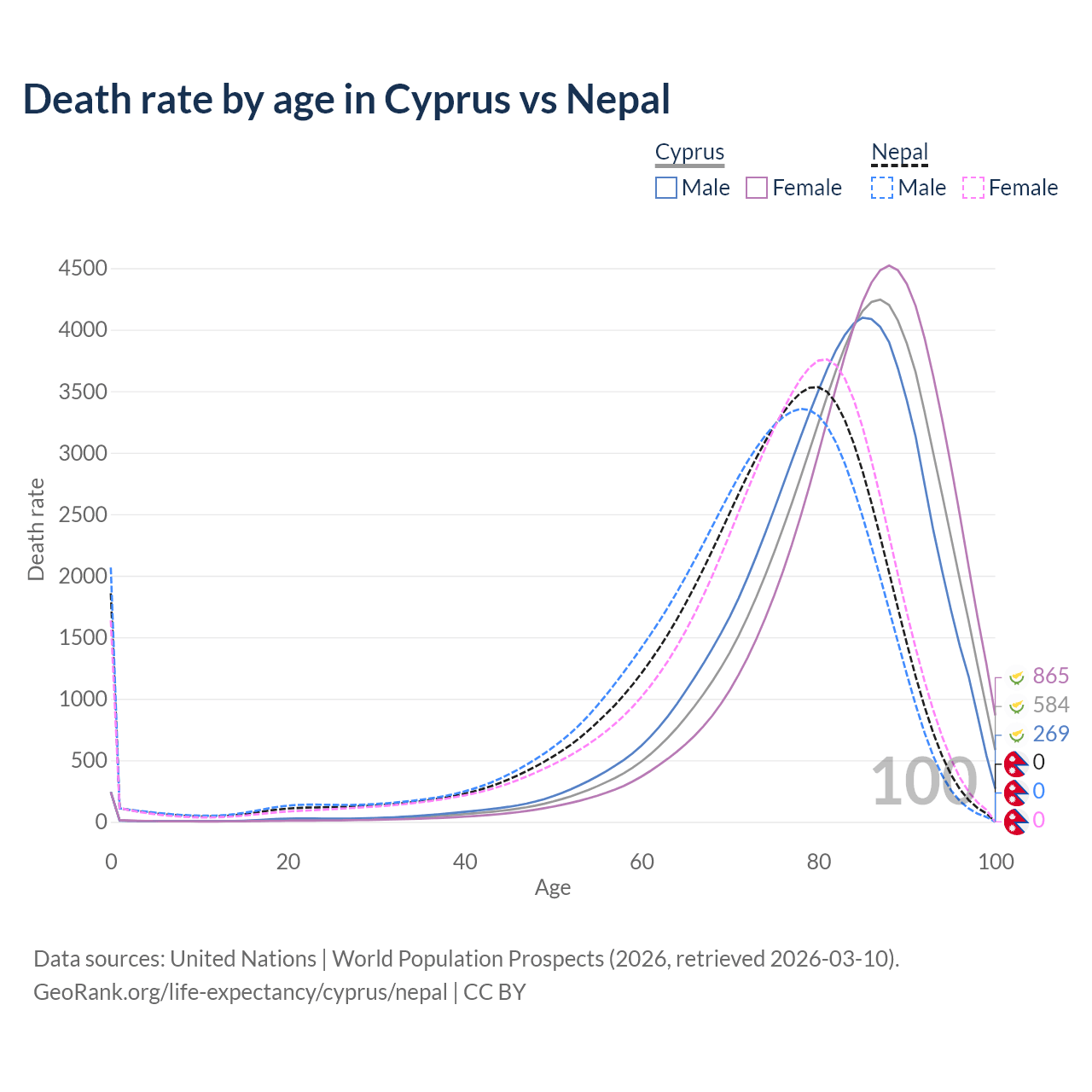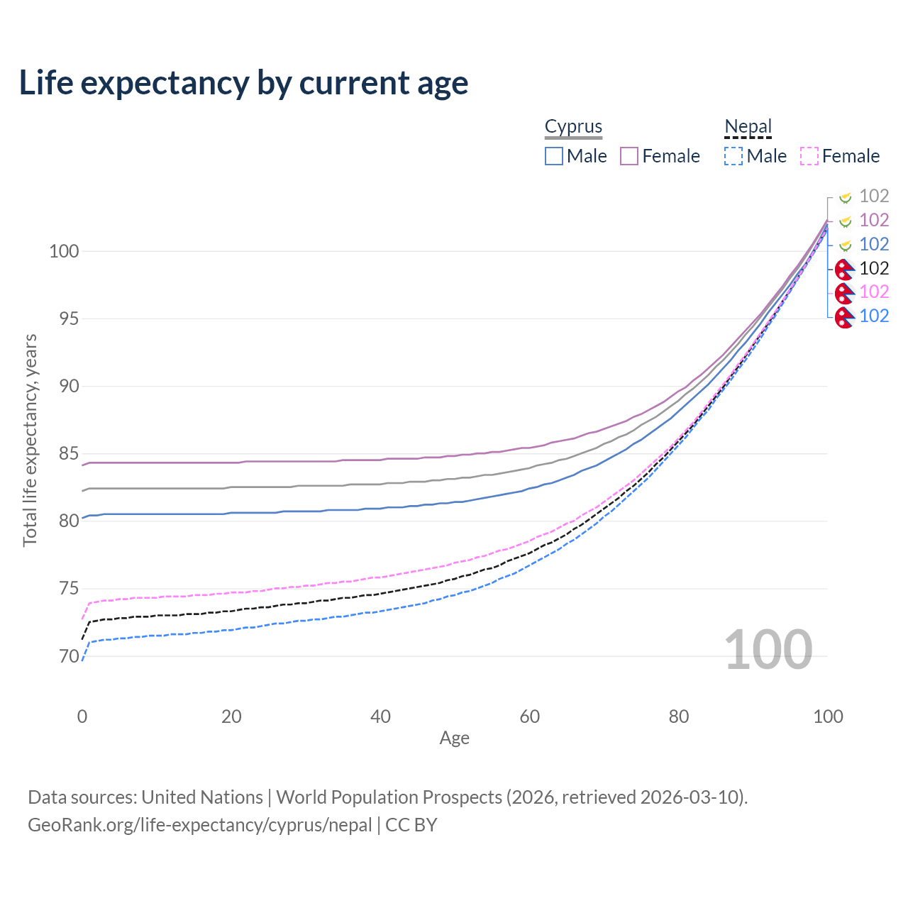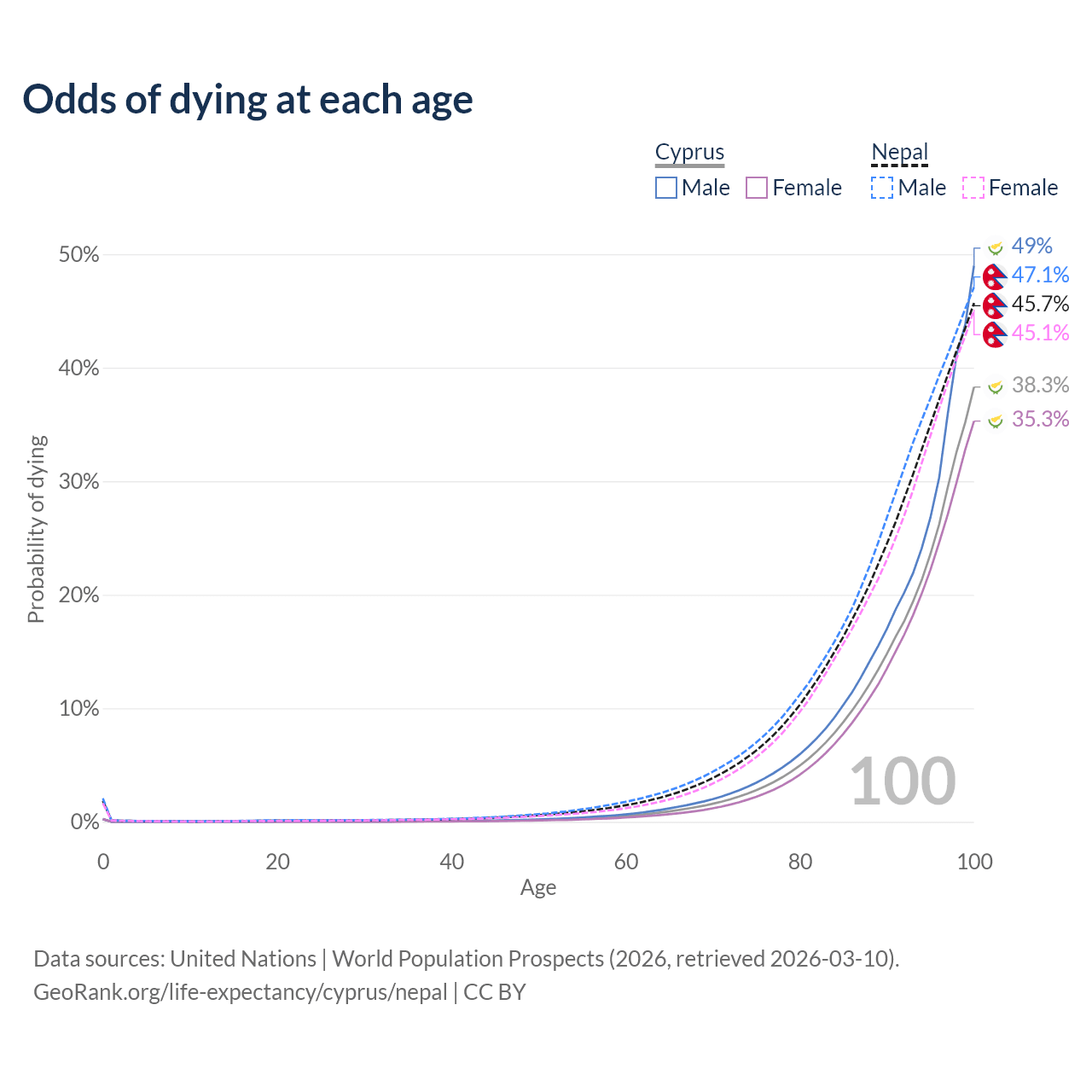 This life expectancy calculator shows the odds of living to 100, 95, 90, and below based on current age for both males and females in Cyprus and Nepal, along with mean and median age of death. The calculations are based on the 2026 life tables (actuarial tables) from the UN World Population Prospects.