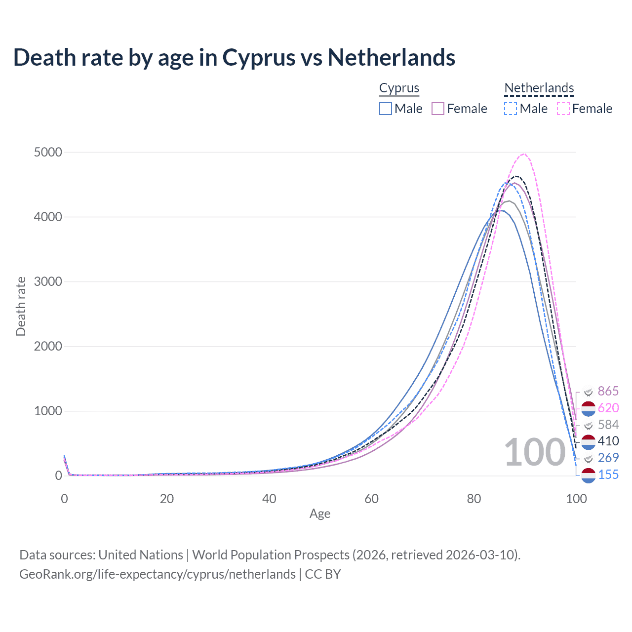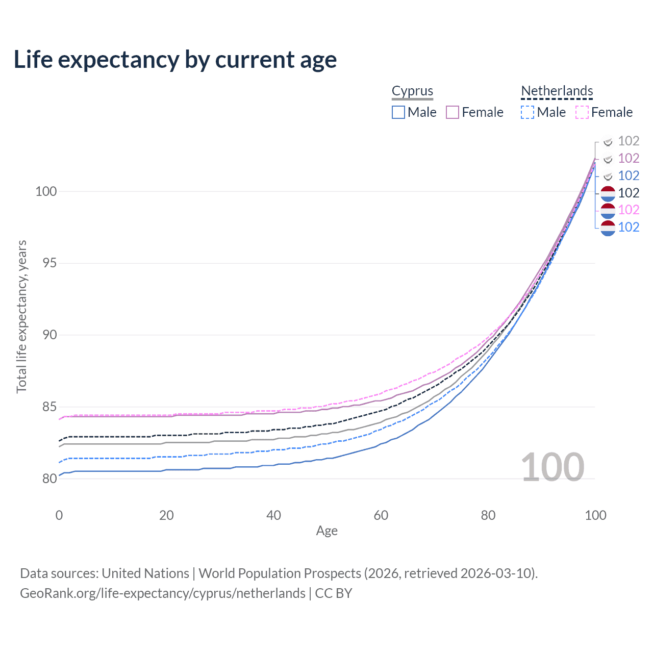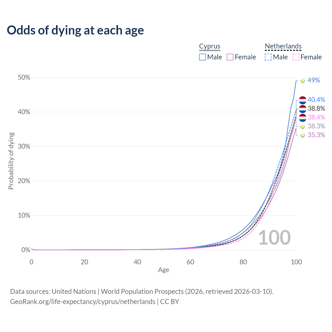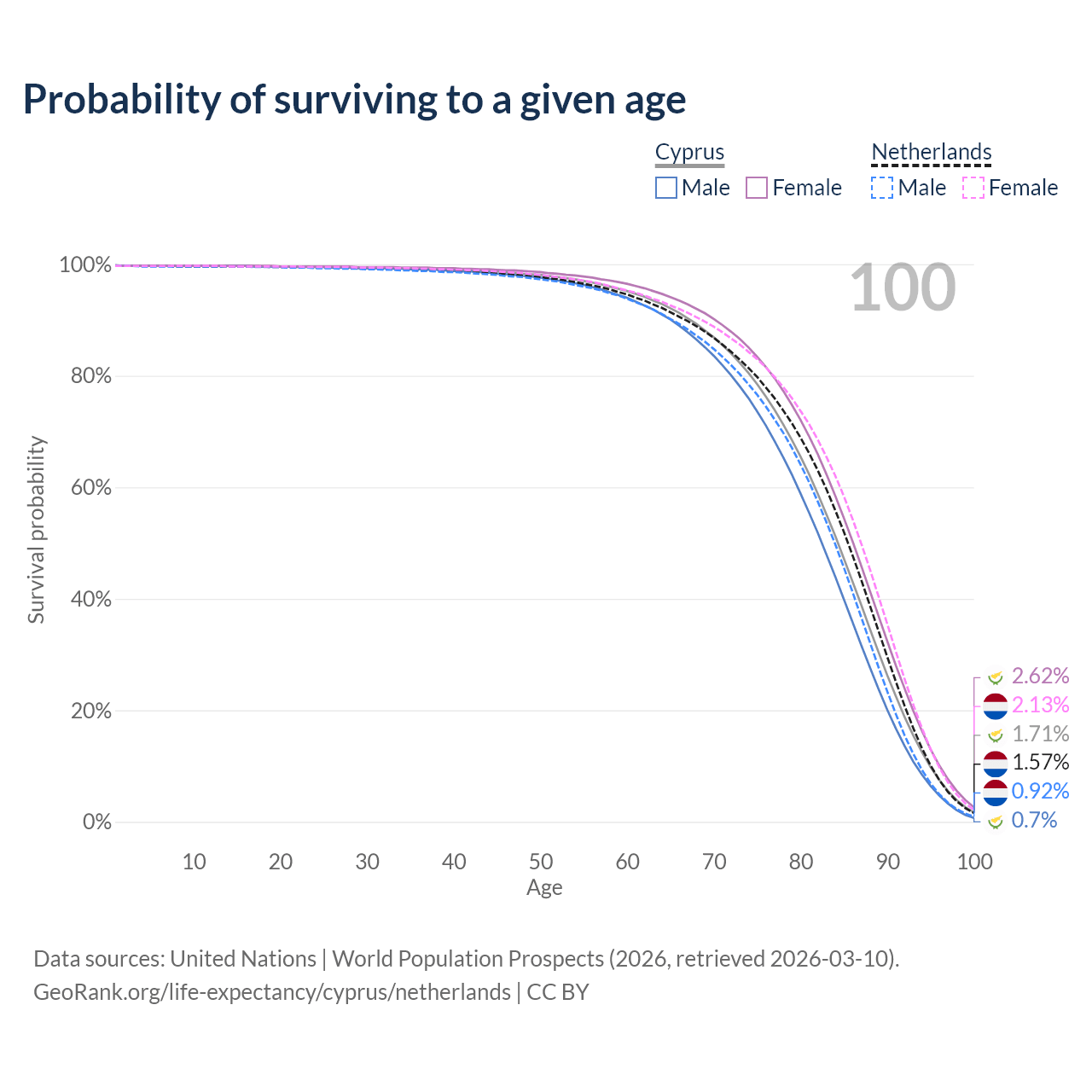 This life expectancy calculator shows the odds of living to 100, 95, 90, and below based on current age for both males and females in Cyprus and the Netherlands, along with mean and median age of death. The calculations are based on the 2026 life tables (actuarial tables) from the UN World Population Prospects.