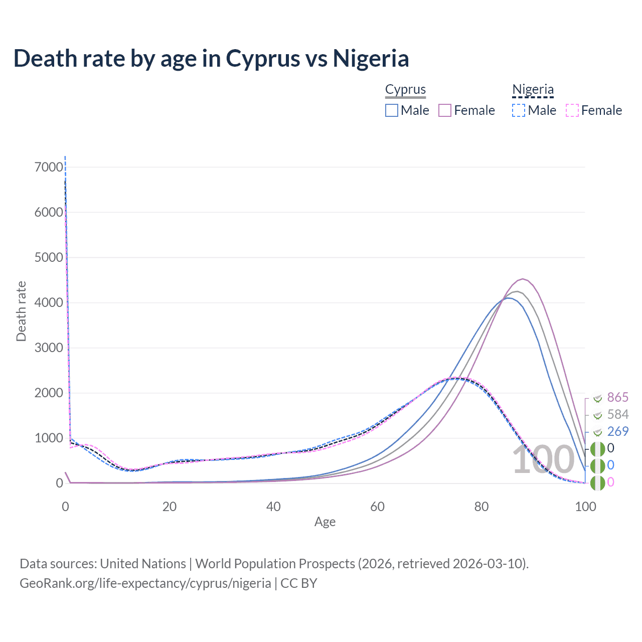 In Cyprus, the most common age of death is 87, compared to 0 in Nigeria. The median age of death is 84.3 in Cyprus and 64.3 in Nigeria, meaning only half of each cohort is expected to live past that age.