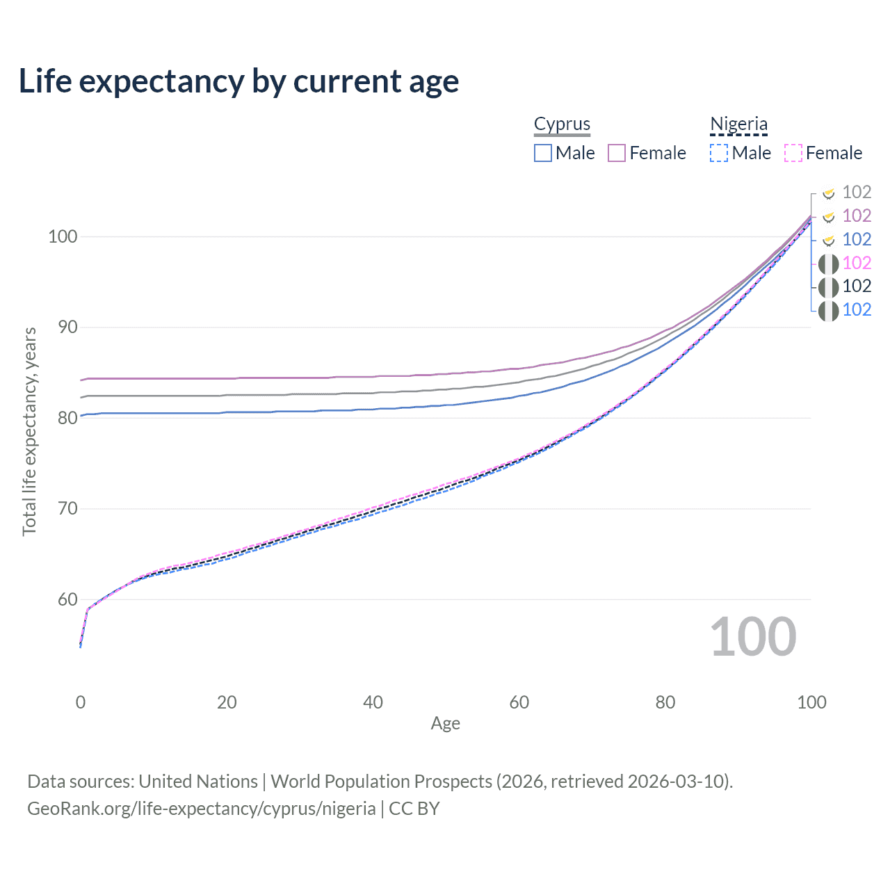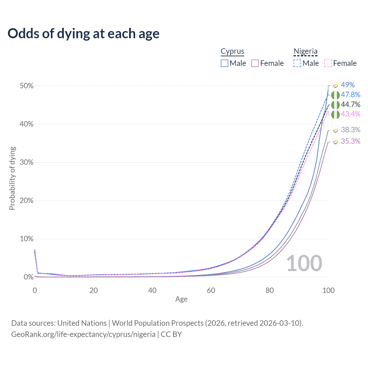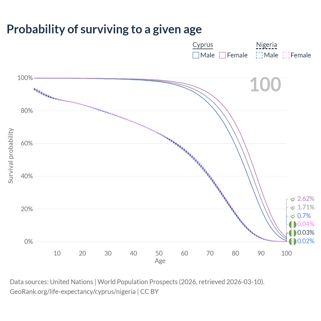This life expectancy calculator shows the odds of living to 100, 95, 90, and below based on current age for both males and females in Cyprus and Nigeria, along with mean and median age of death. The calculations are based on the 2026 life tables (actuarial tables) from the UN World Population Prospects.
