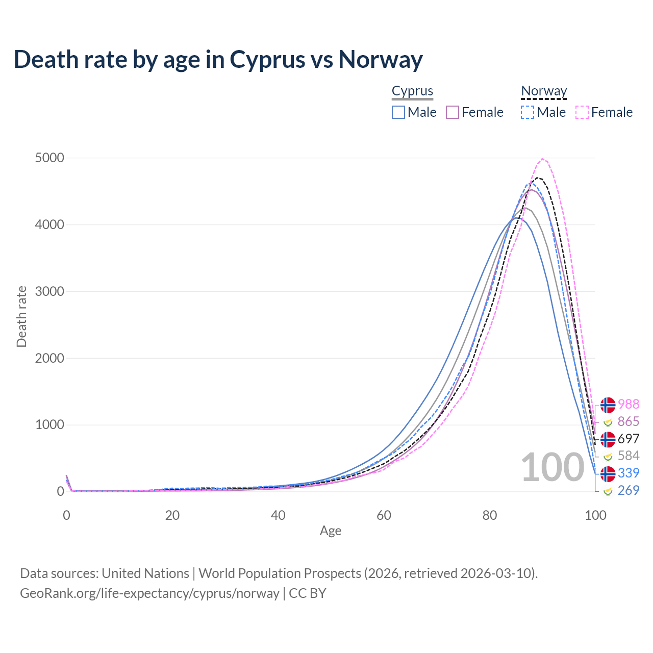 In Cyprus, the most common age of death is 87, compared to 89 in Norway. The median age of death is 84.3 in Cyprus and 86.5 in Norway, meaning only half of each cohort is expected to live past that age.