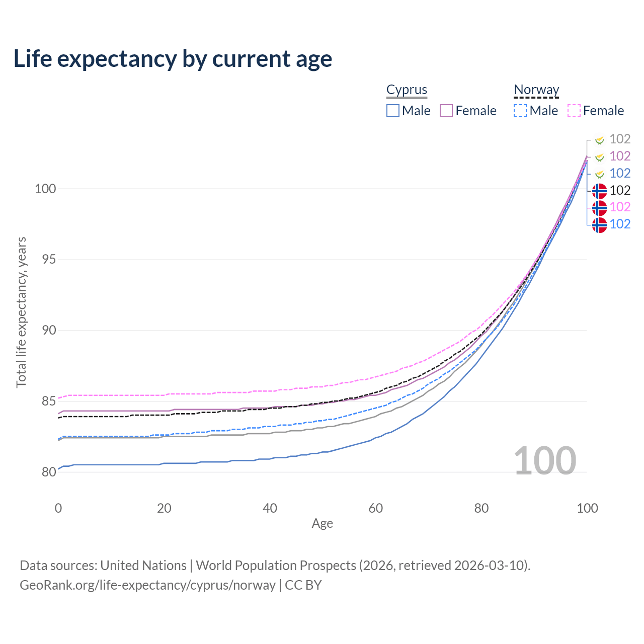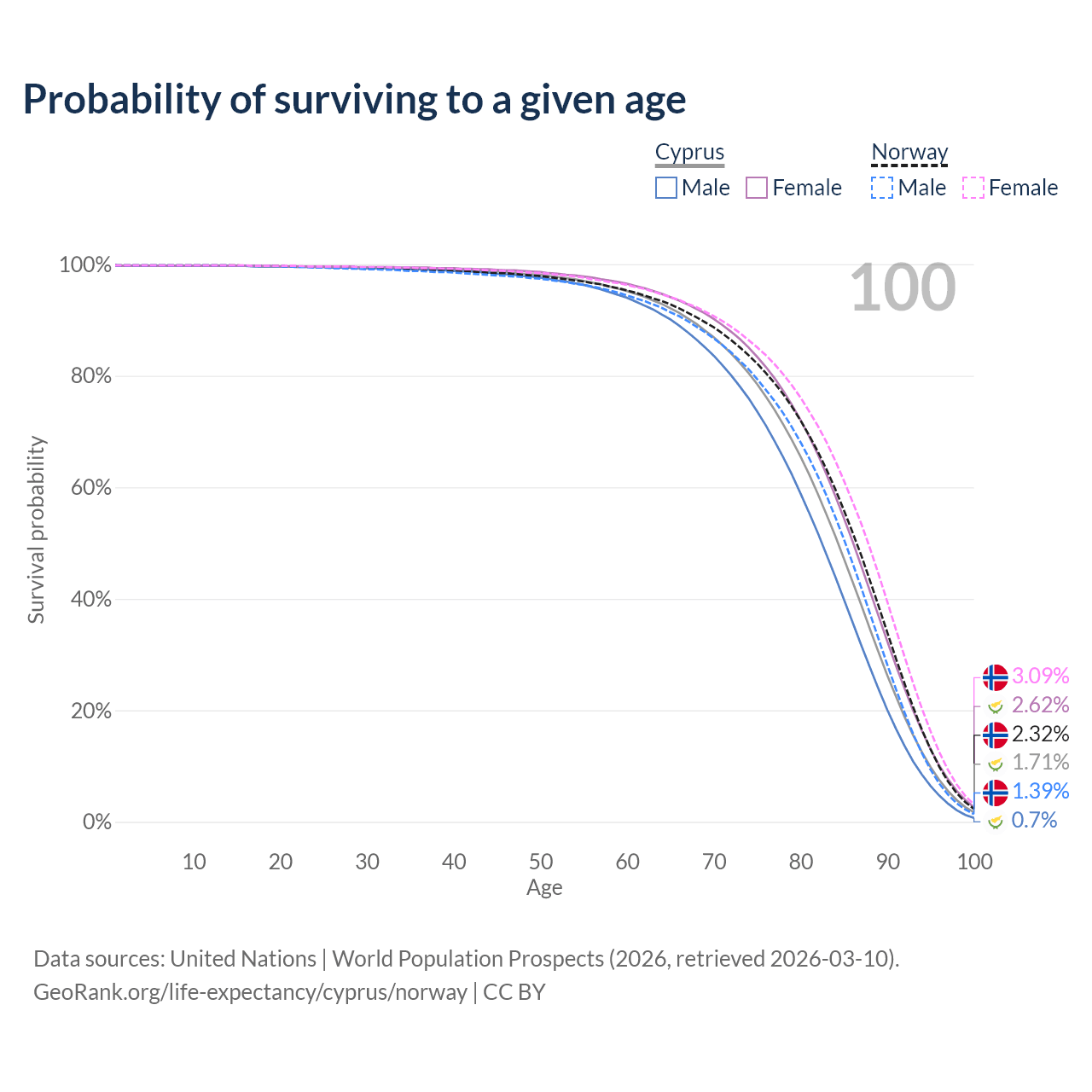 This life expectancy calculator shows the odds of living to 100, 95, 90, and below based on current age for both males and females in Cyprus and Norway, along with mean and median age of death. The calculations are based on the 2026 life tables (actuarial tables) from the UN World Population Prospects.