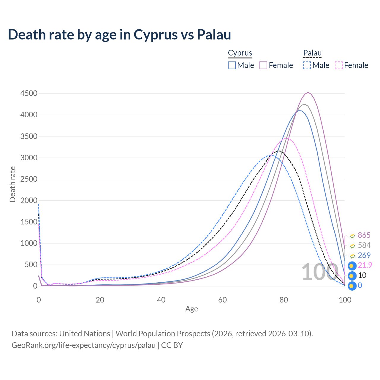 In Cyprus, the most common age of death is 87, compared to 78 in Palau. The median age of death is 84.3 in Cyprus and 73.8 in Palau, meaning only half of each cohort is expected to live past that age.