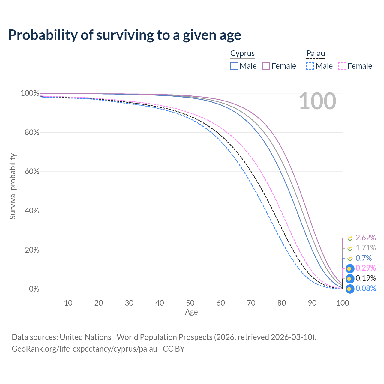 This life expectancy calculator shows the odds of living to 100, 95, 90, and below based on current age for both males and females in Cyprus and Palau, along with mean and median age of death. The calculations are based on the 2026 life tables (actuarial tables) from the UN World Population Prospects.