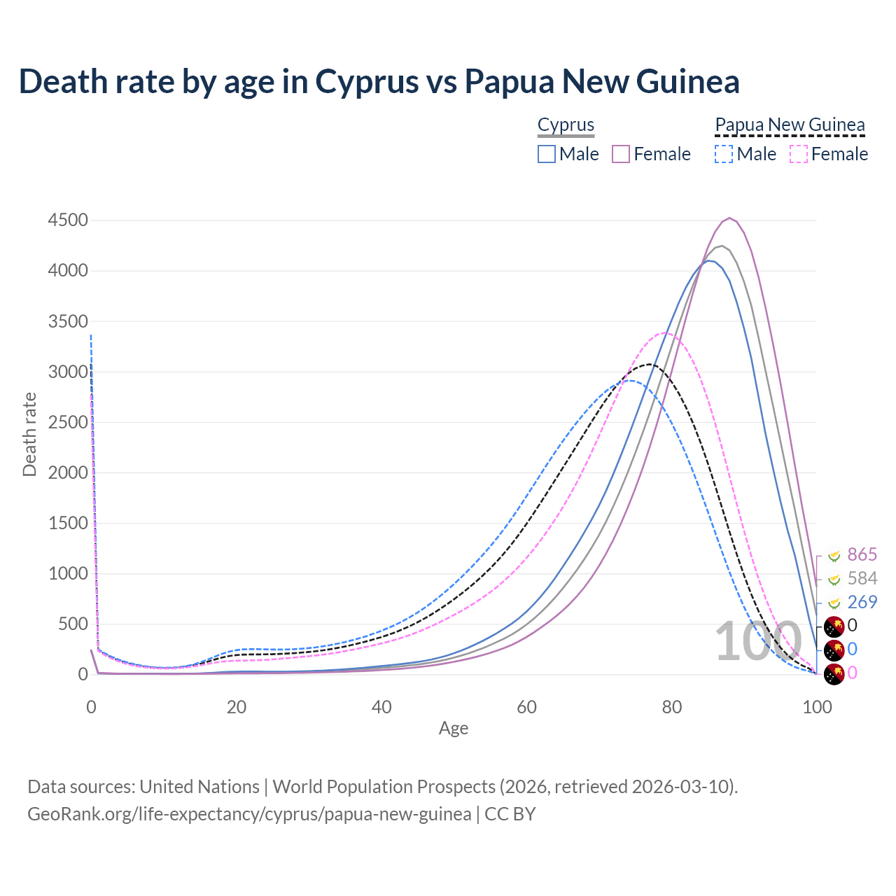 In Cyprus, the most common age of death is 87, compared to 0 in Papua New Guinea. The median age of death is 84.3 in Cyprus and 71.7 in Papua New Guinea, meaning only half of each cohort is expected to live past that age.