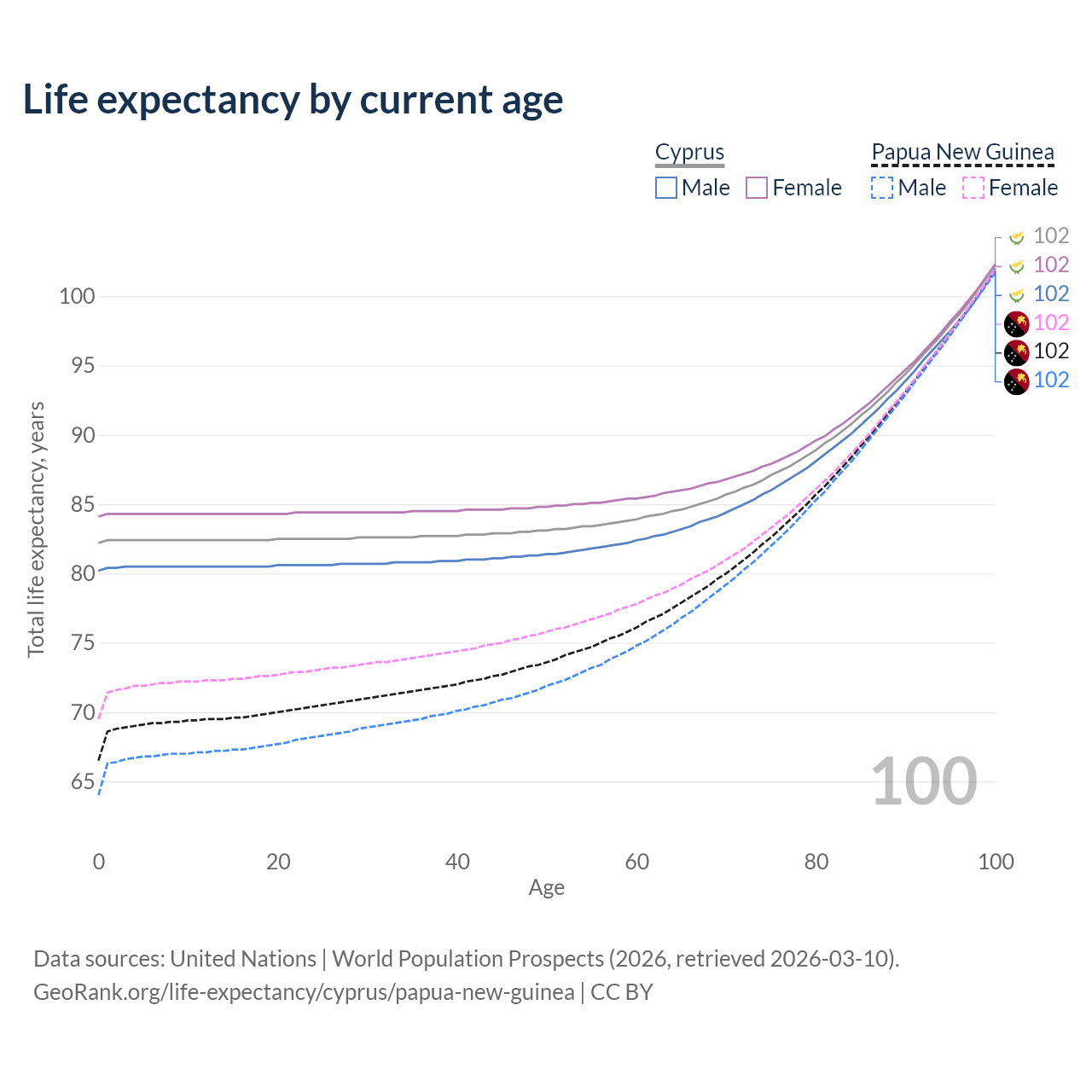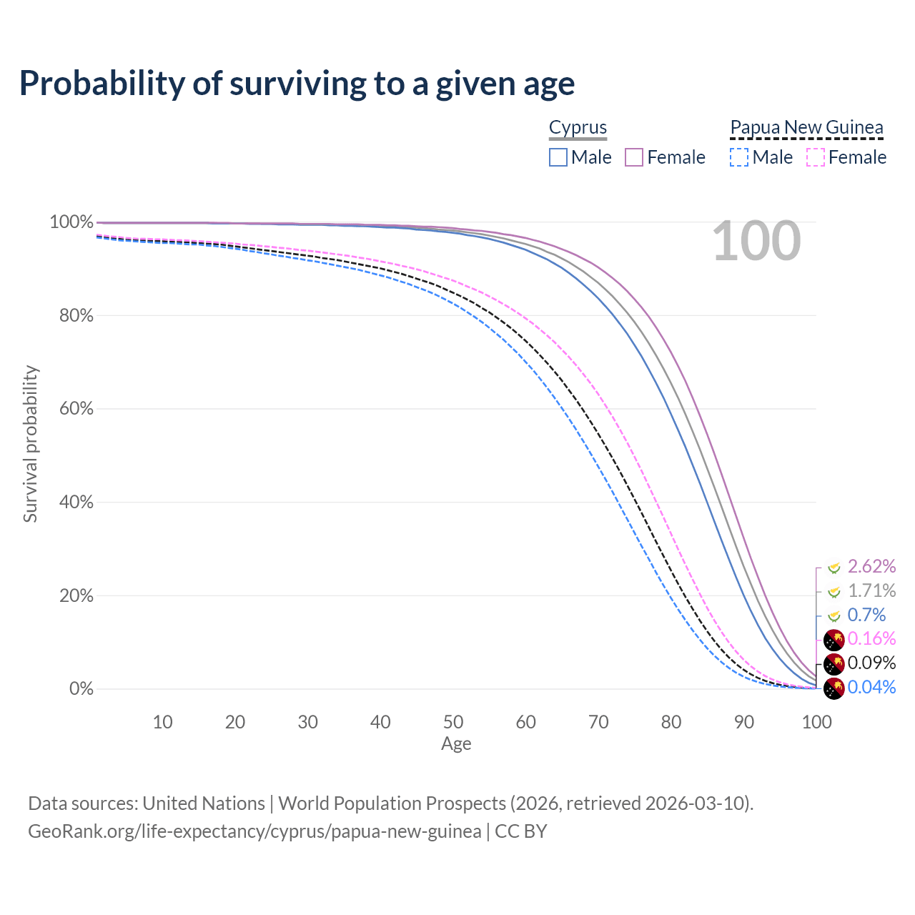 This life expectancy calculator shows the odds of living to 100, 95, 90, and below based on current age for both males and females in Cyprus and Papua New Guinea, along with mean and median age of death. The calculations are based on the 2026 life tables (actuarial tables) from the UN World Population Prospects.
