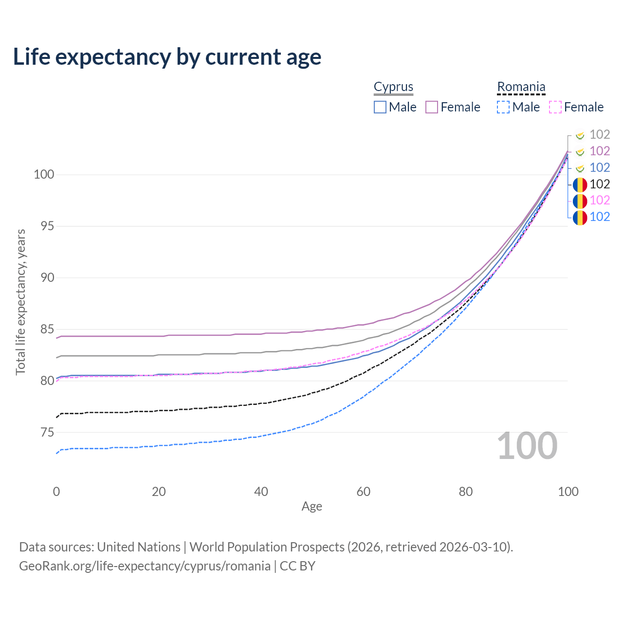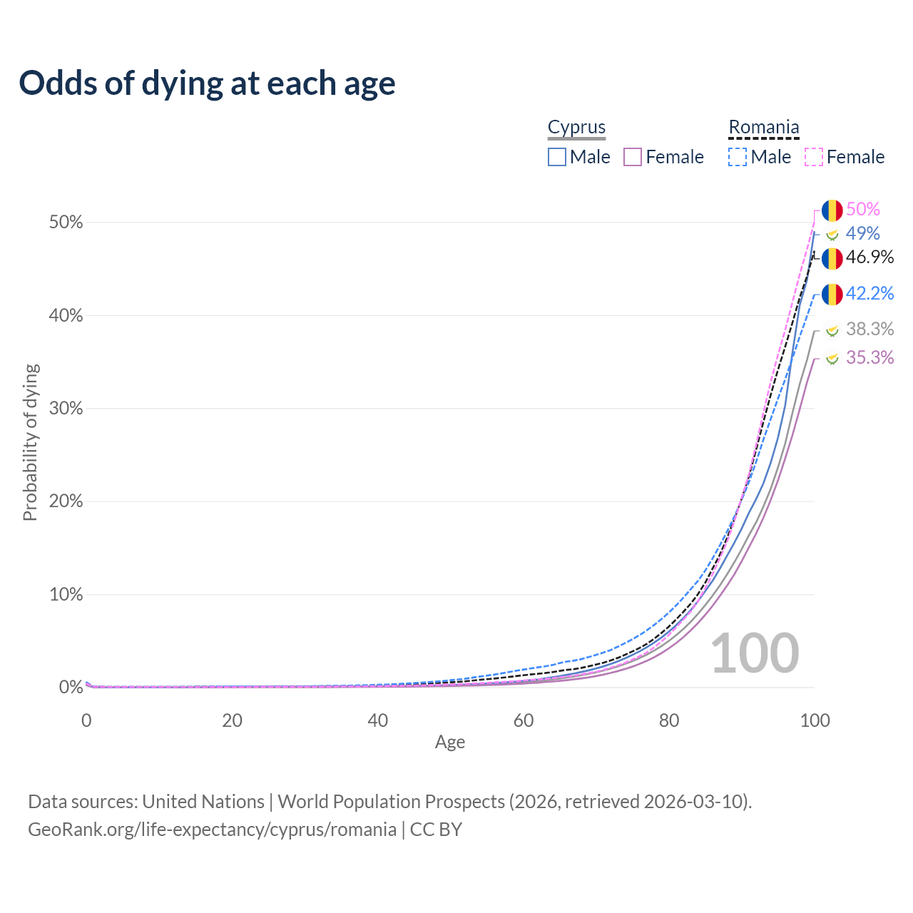This life expectancy calculator shows the odds of living to 100, 95, 90, and below based on current age for both males and females in Cyprus and Romania, along with mean and median age of death. The calculations are based on the 2026 life tables (actuarial tables) from the UN World Population Prospects.