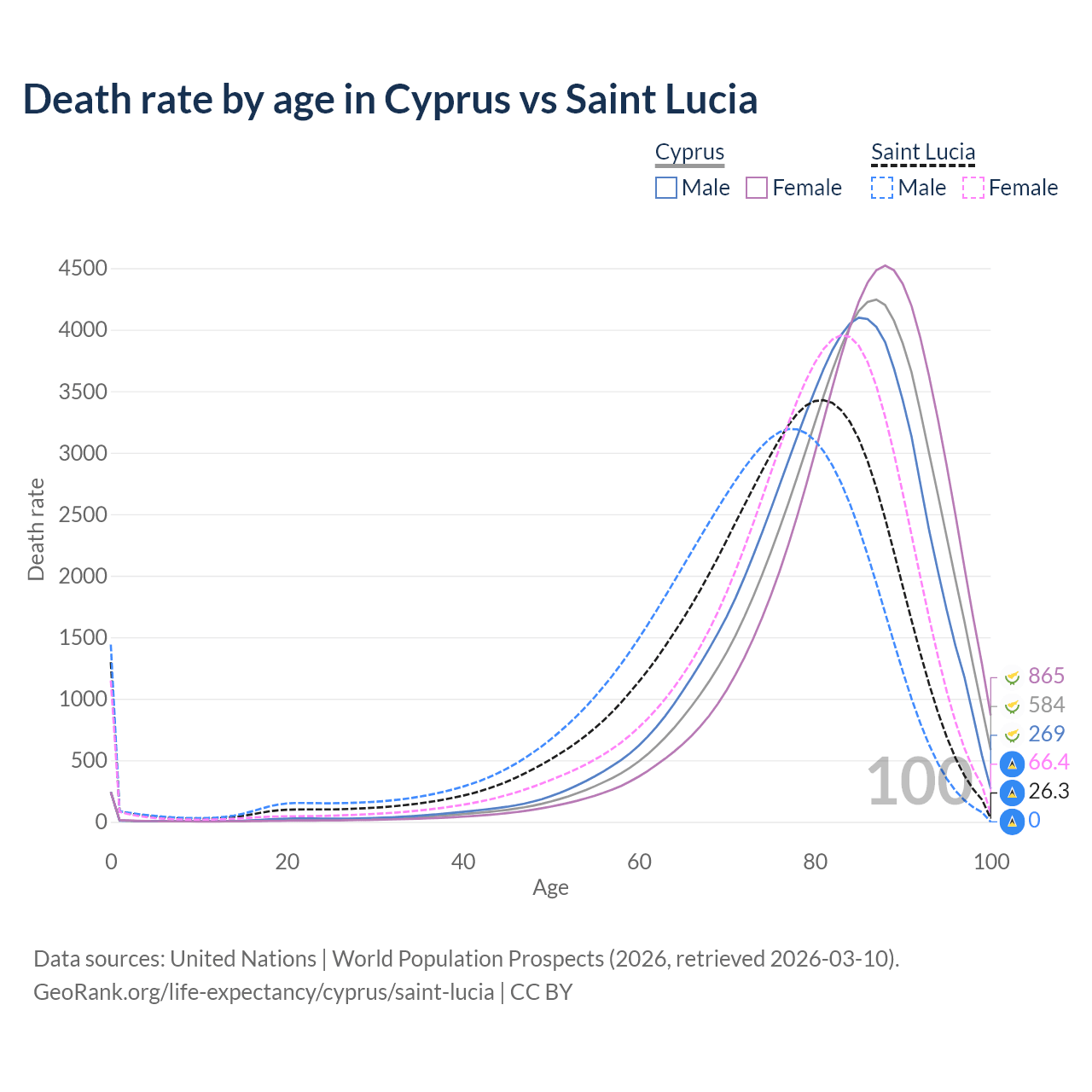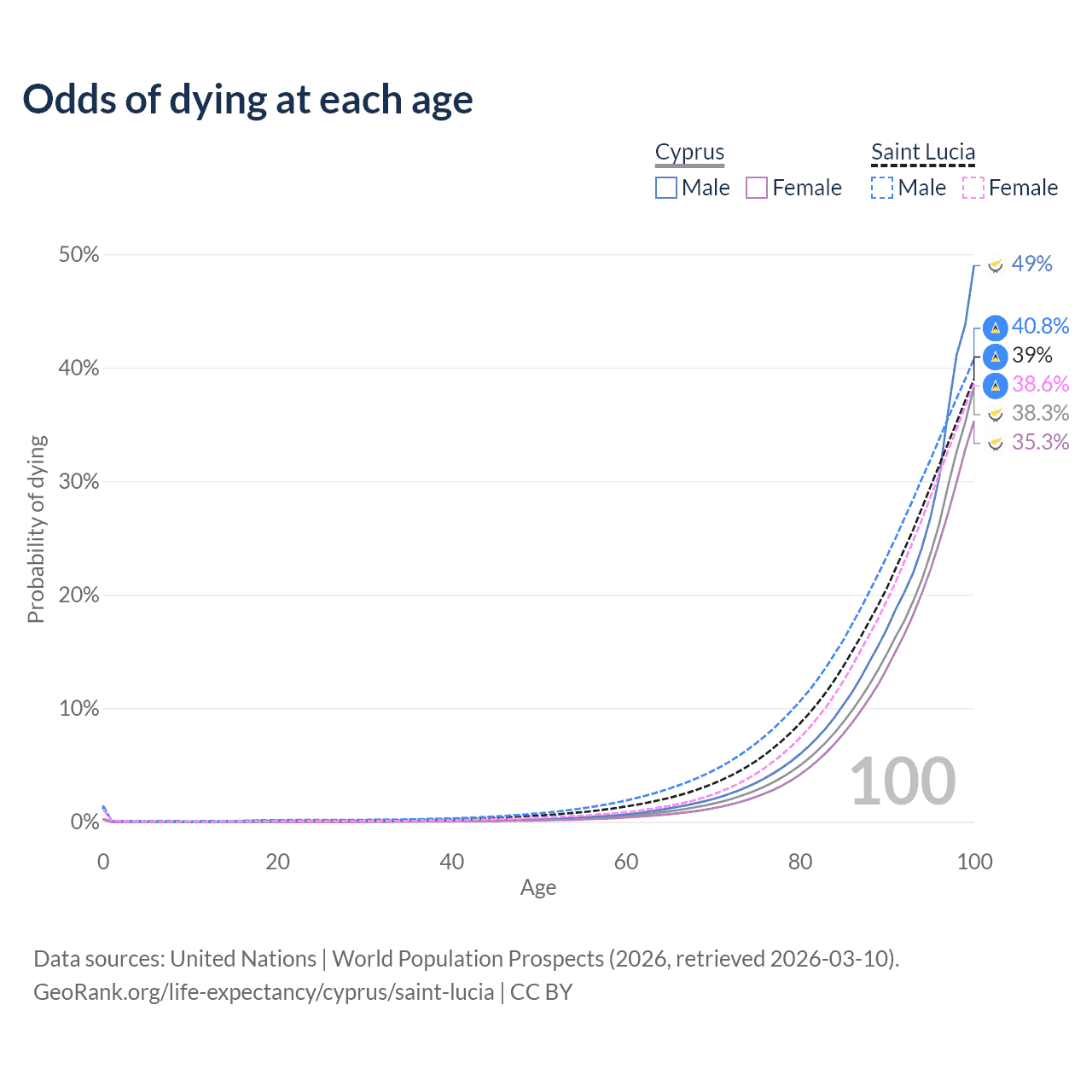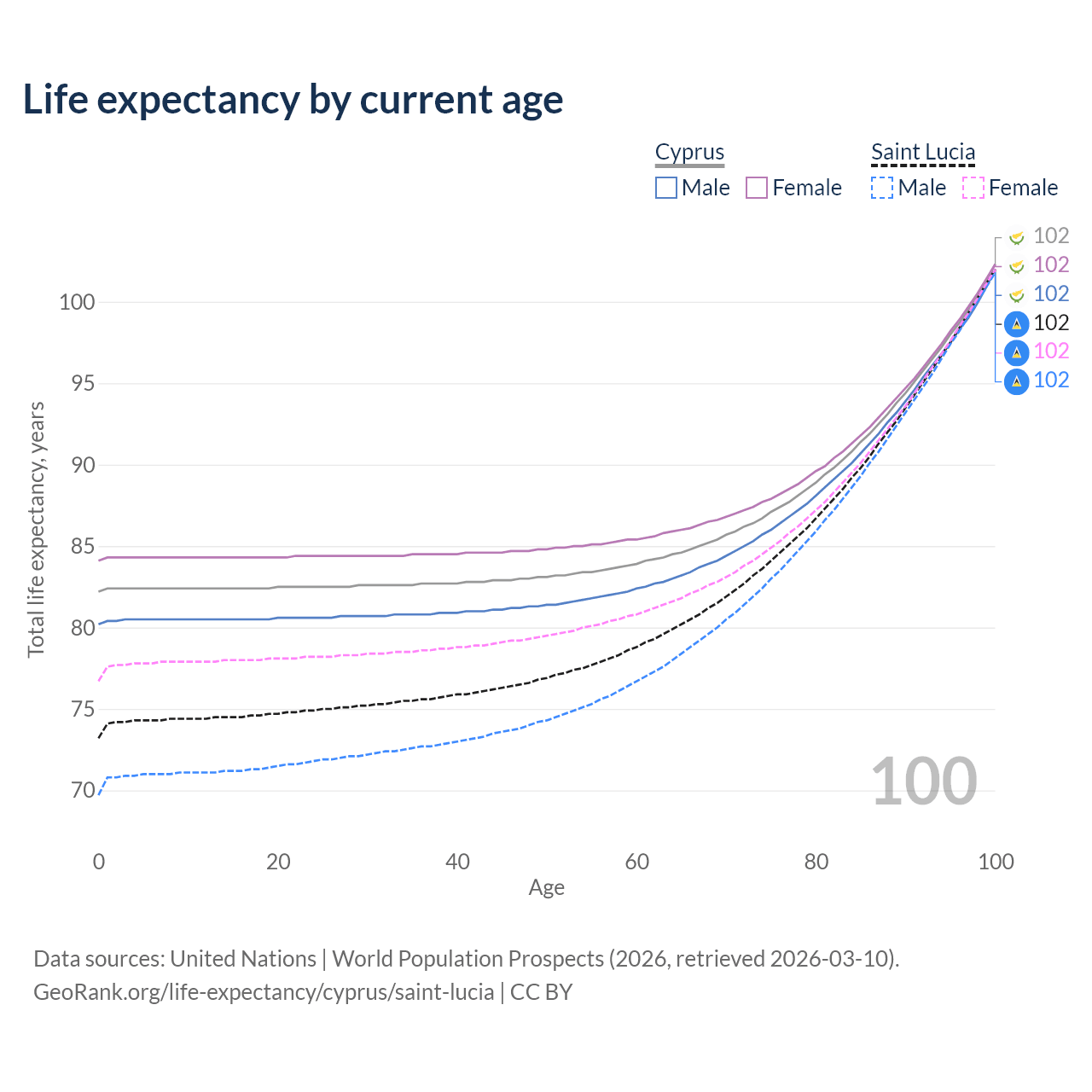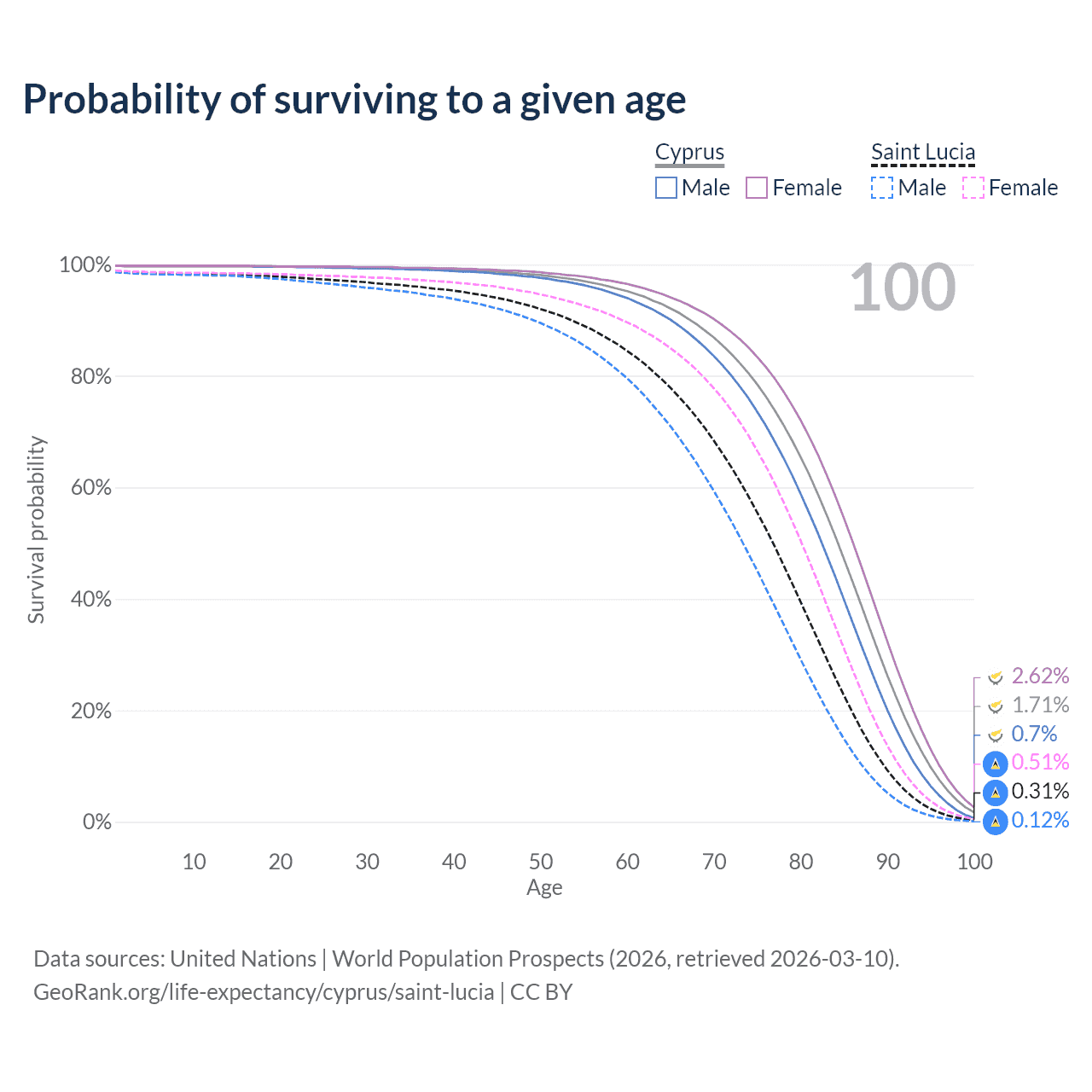 This life expectancy calculator shows the odds of living to 100, 95, 90, and below based on current age for both males and females in Cyprus and Saint Lucia, along with mean and median age of death. The calculations are based on the 2026 life tables (actuarial tables) from the UN World Population Prospects.