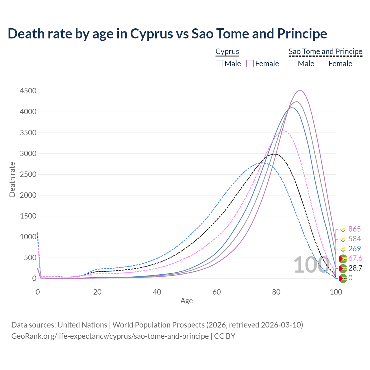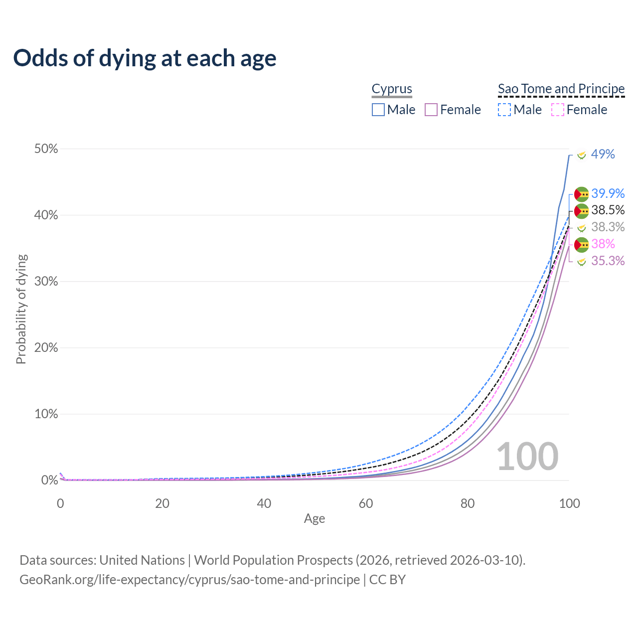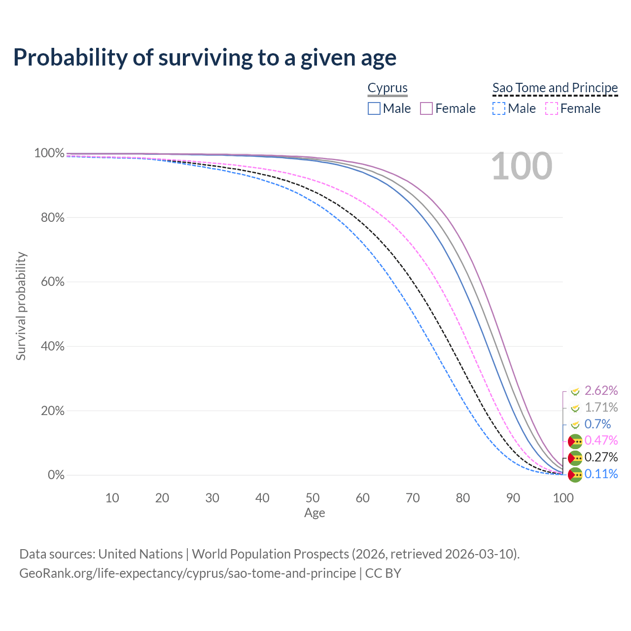 This life expectancy calculator shows the odds of living to 100, 95, 90, and below based on current age for both males and females in Cyprus and Sao Tome and Principe, along with mean and median age of death. The calculations are based on the 2026 life tables (actuarial tables) from the UN World Population Prospects.