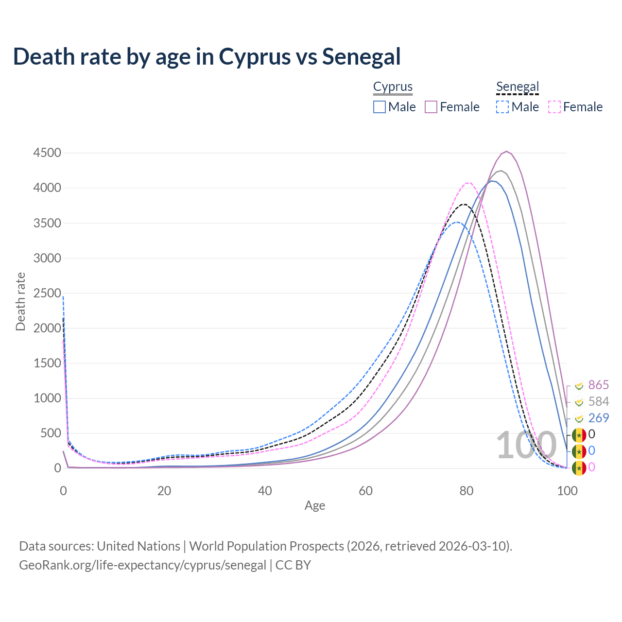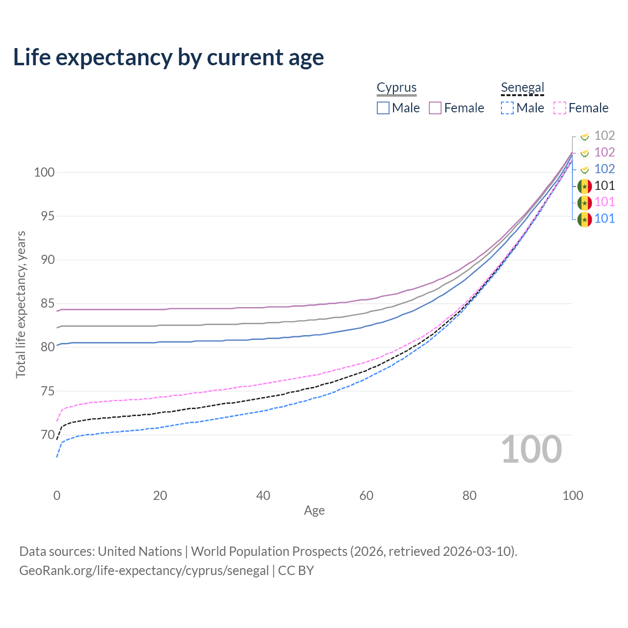 This life expectancy calculator shows the odds of living to 100, 95, 90, and below based on current age for both males and females in Cyprus and Senegal, along with mean and median age of death. The calculations are based on the 2026 life tables (actuarial tables) from the UN World Population Prospects.