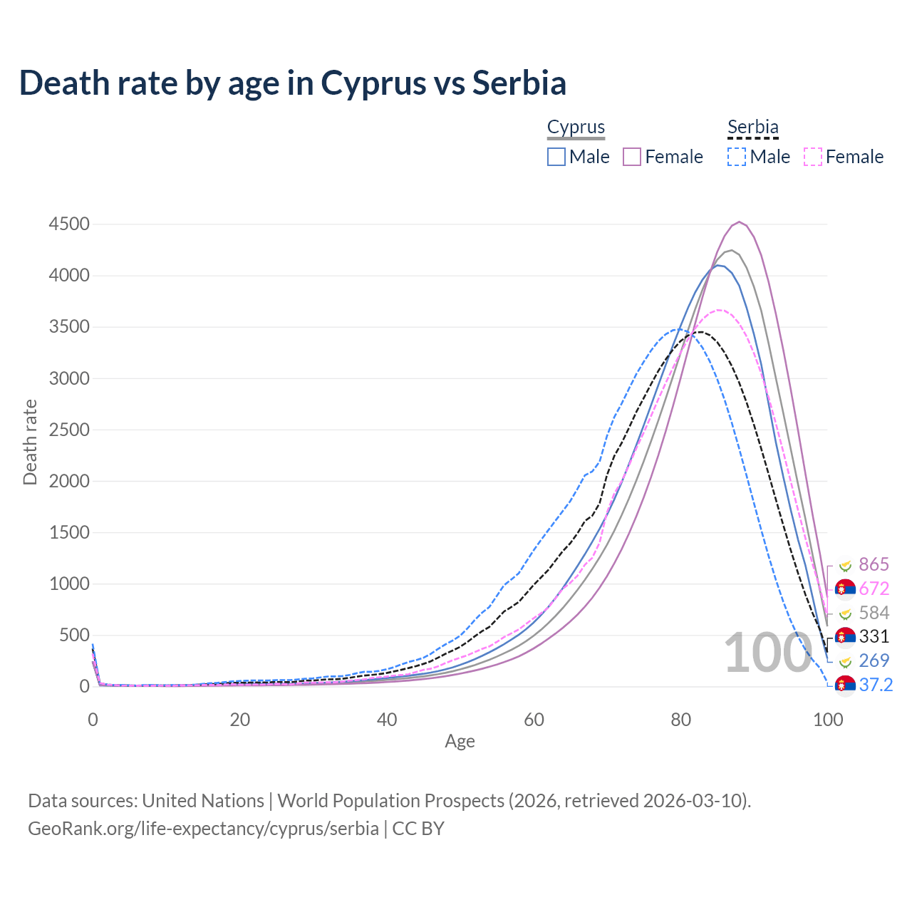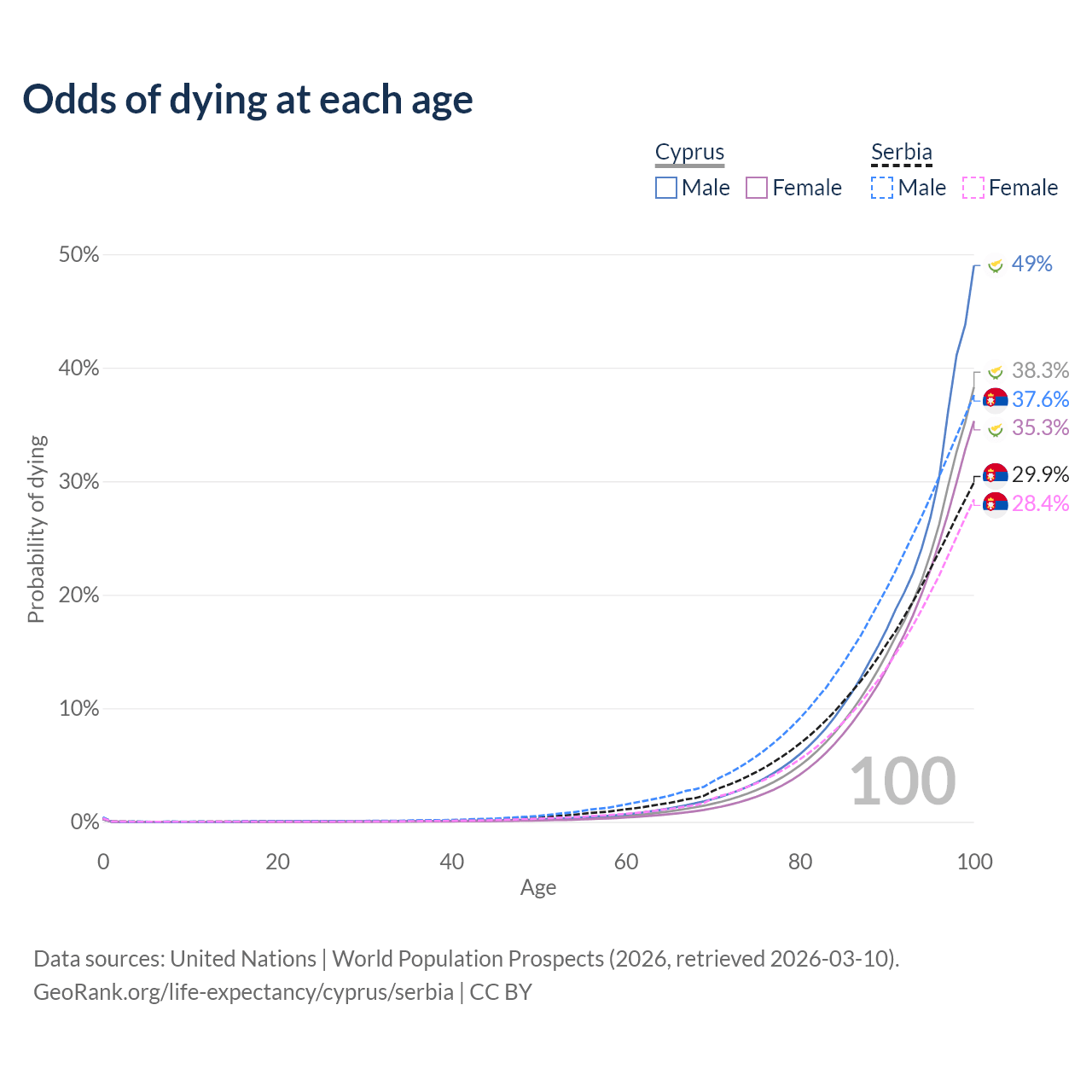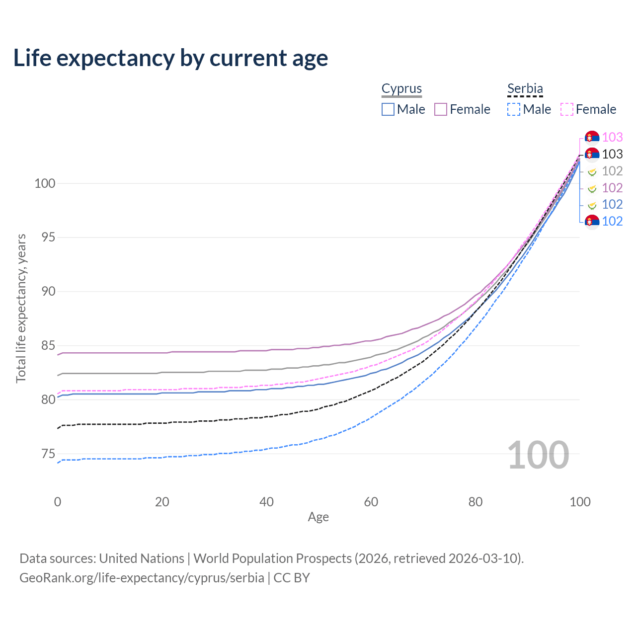 This life expectancy calculator shows the odds of living to 100, 95, 90, and below based on current age for both males and females in Cyprus and Serbia, along with mean and median age of death. The calculations are based on the 2026 life tables (actuarial tables) from the UN World Population Prospects.