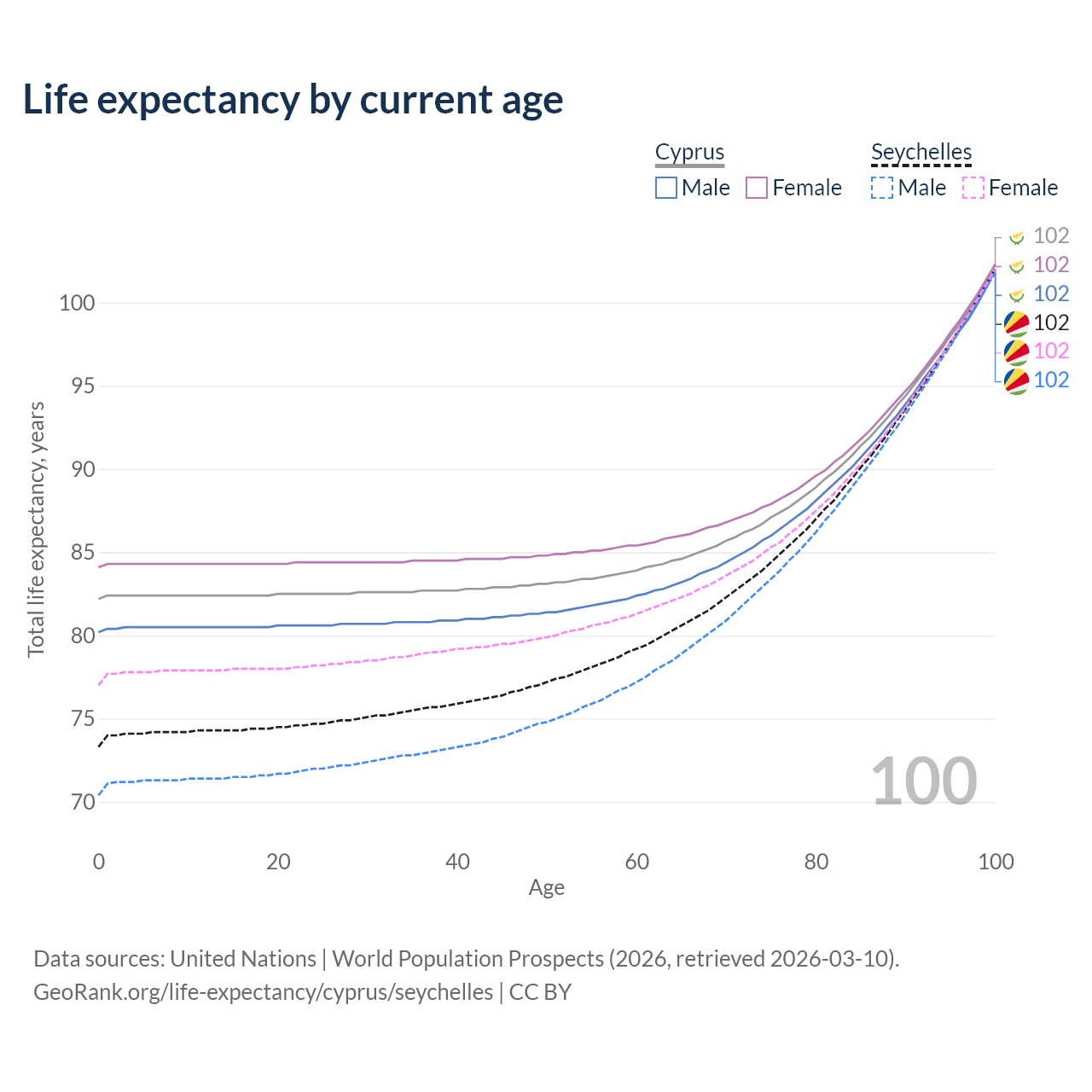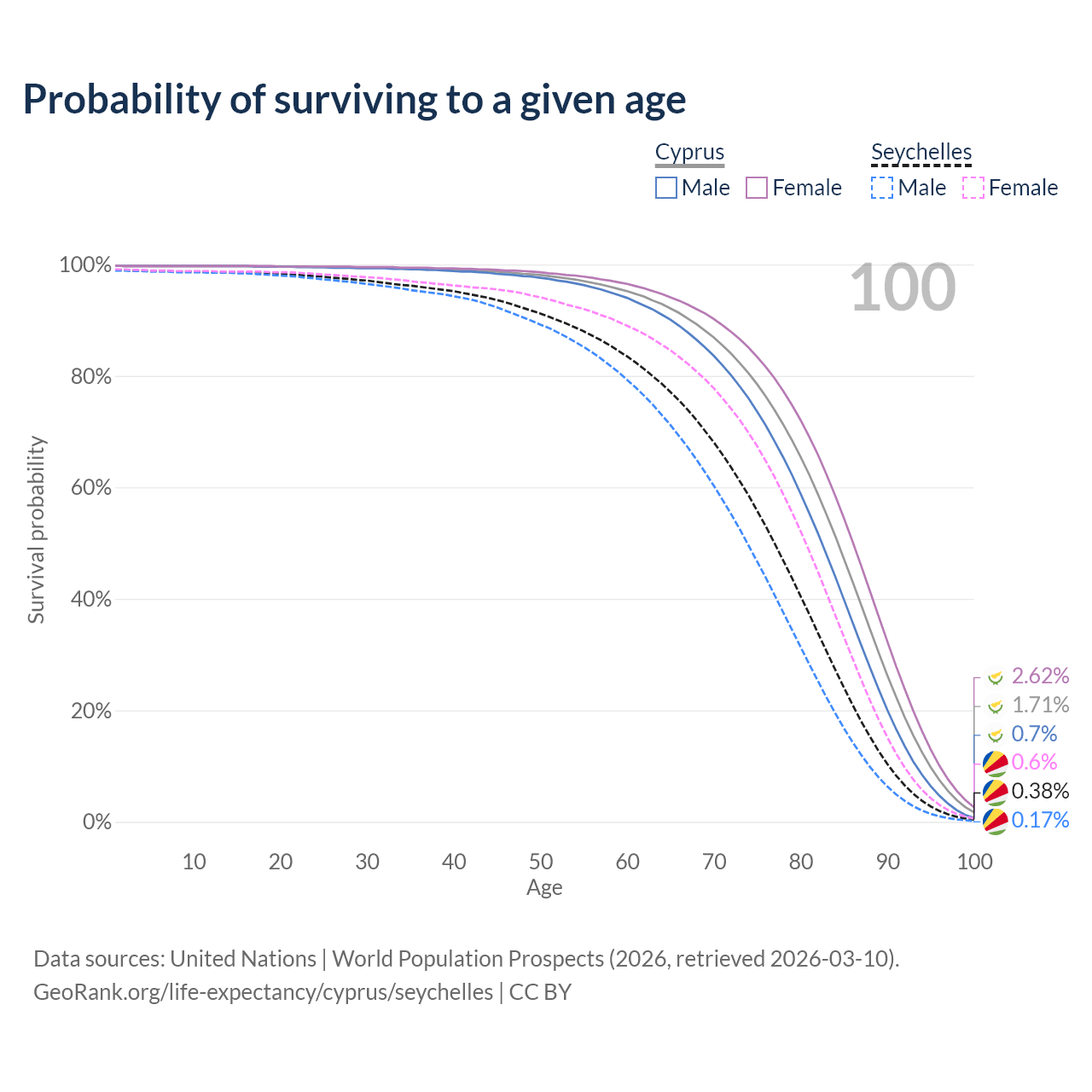 This life expectancy calculator shows the odds of living to 100, 95, 90, and below based on current age for both males and females in Cyprus and the Seychelles, along with mean and median age of death. The calculations are based on the 2026 life tables (actuarial tables) from the UN World Population Prospects.