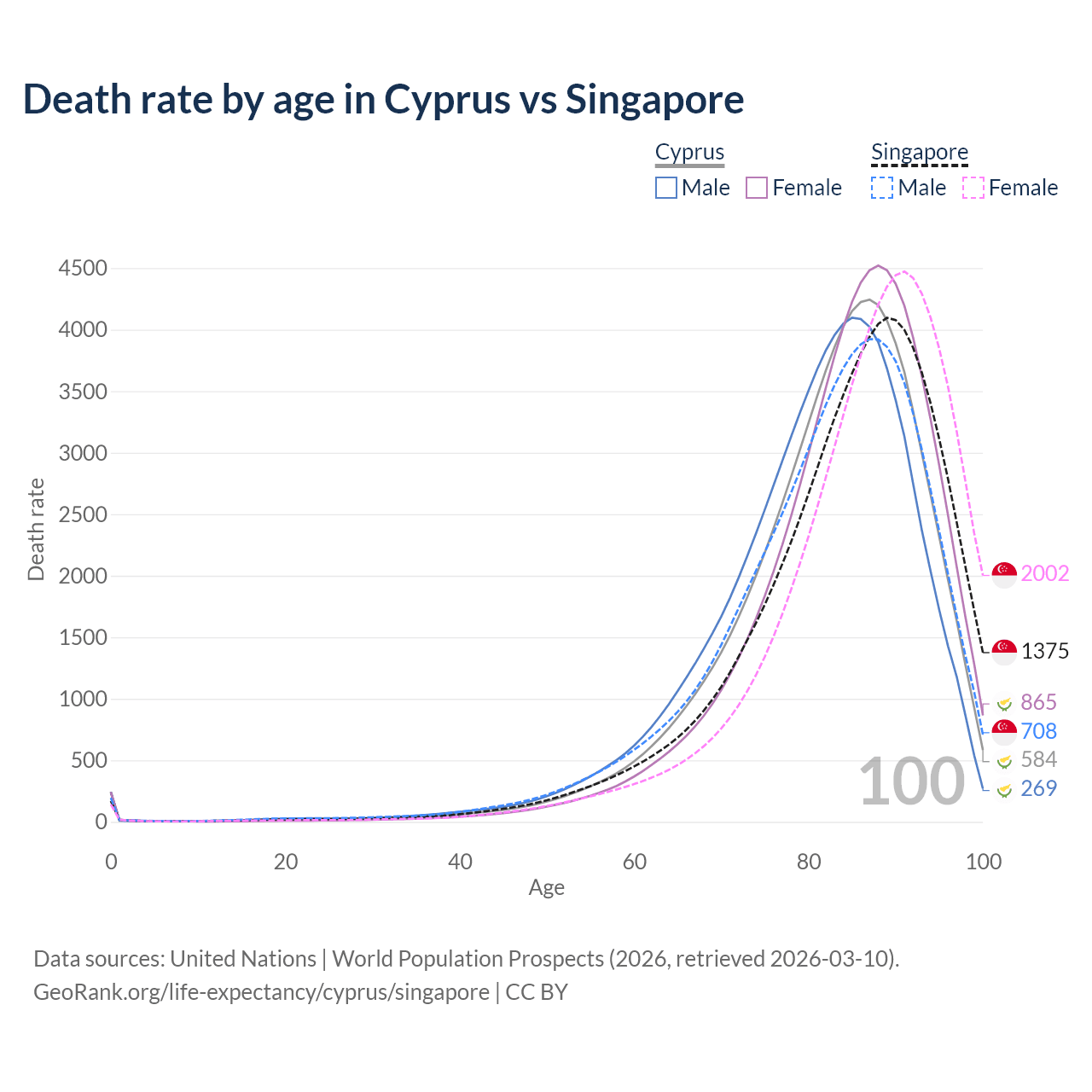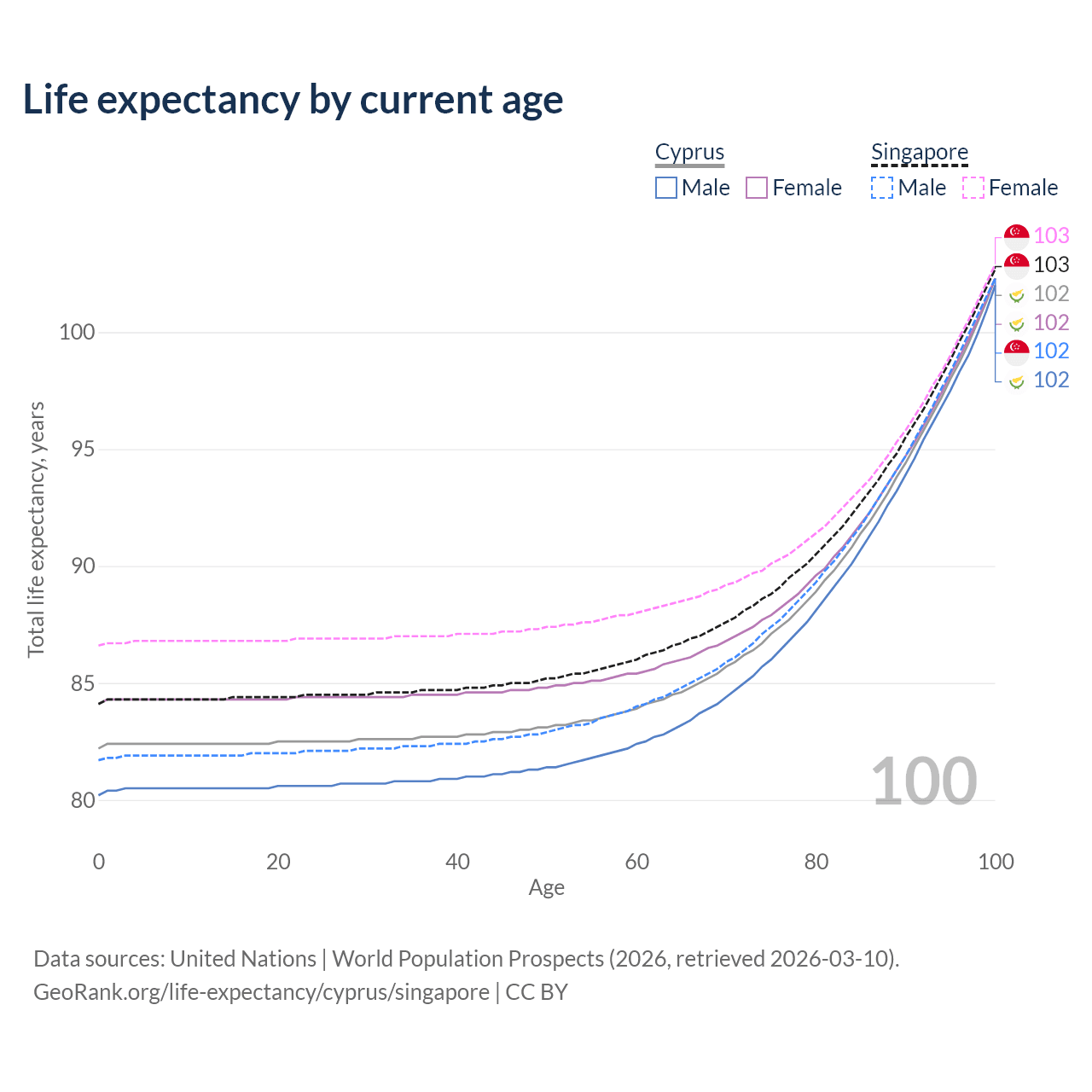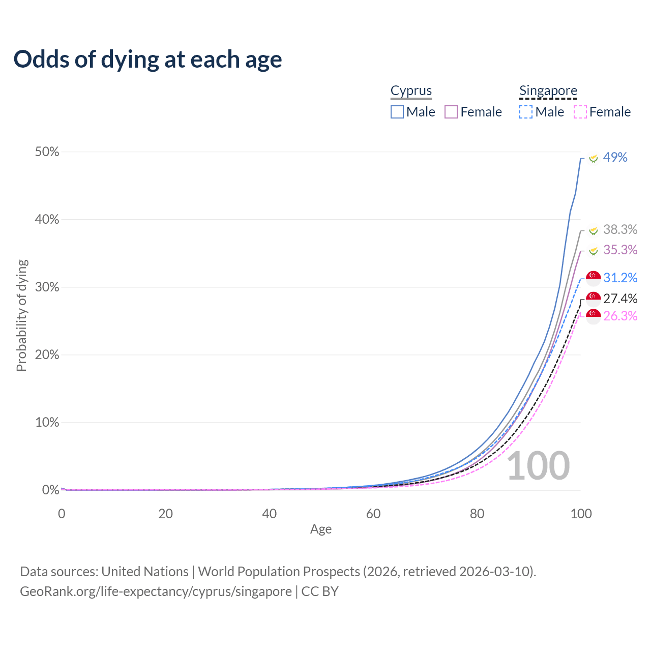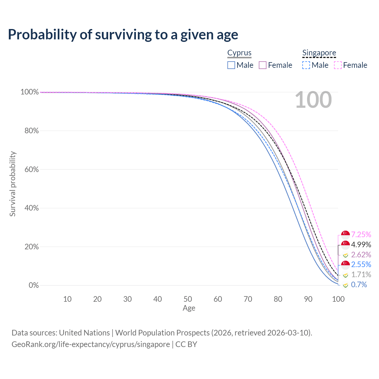 This life expectancy calculator shows the odds of living to 100, 95, 90, and below based on current age for both males and females in Cyprus and Singapore, along with mean and median age of death. The calculations are based on the 2026 life tables (actuarial tables) from the UN World Population Prospects.