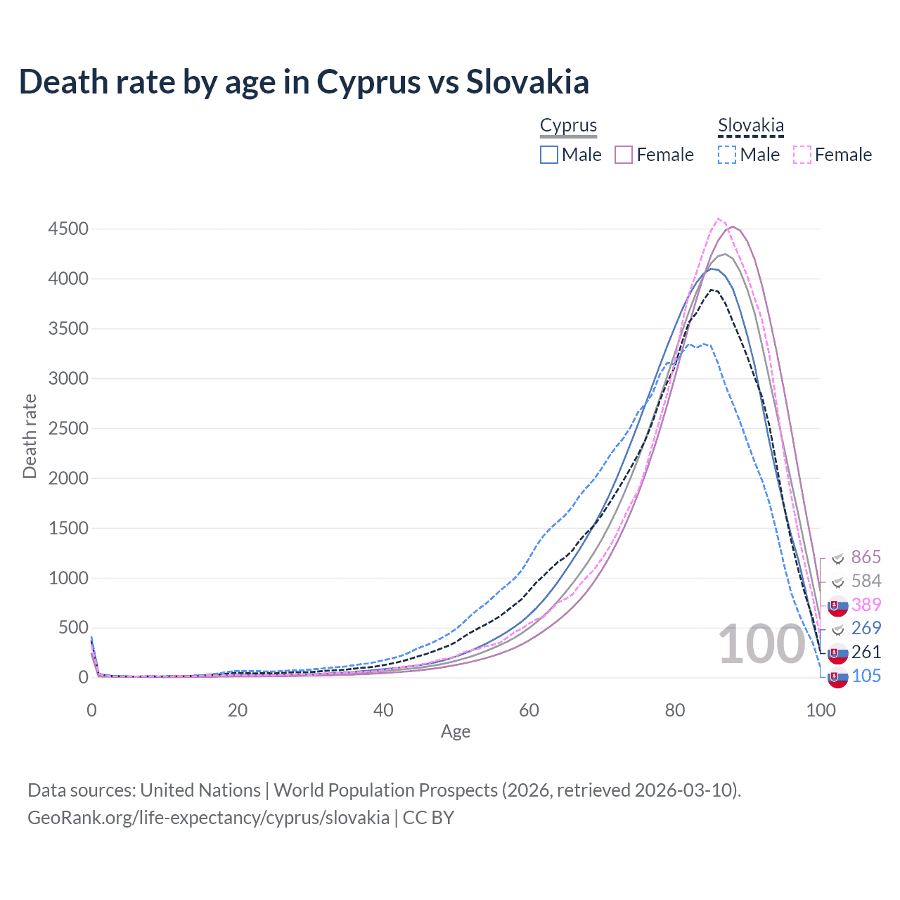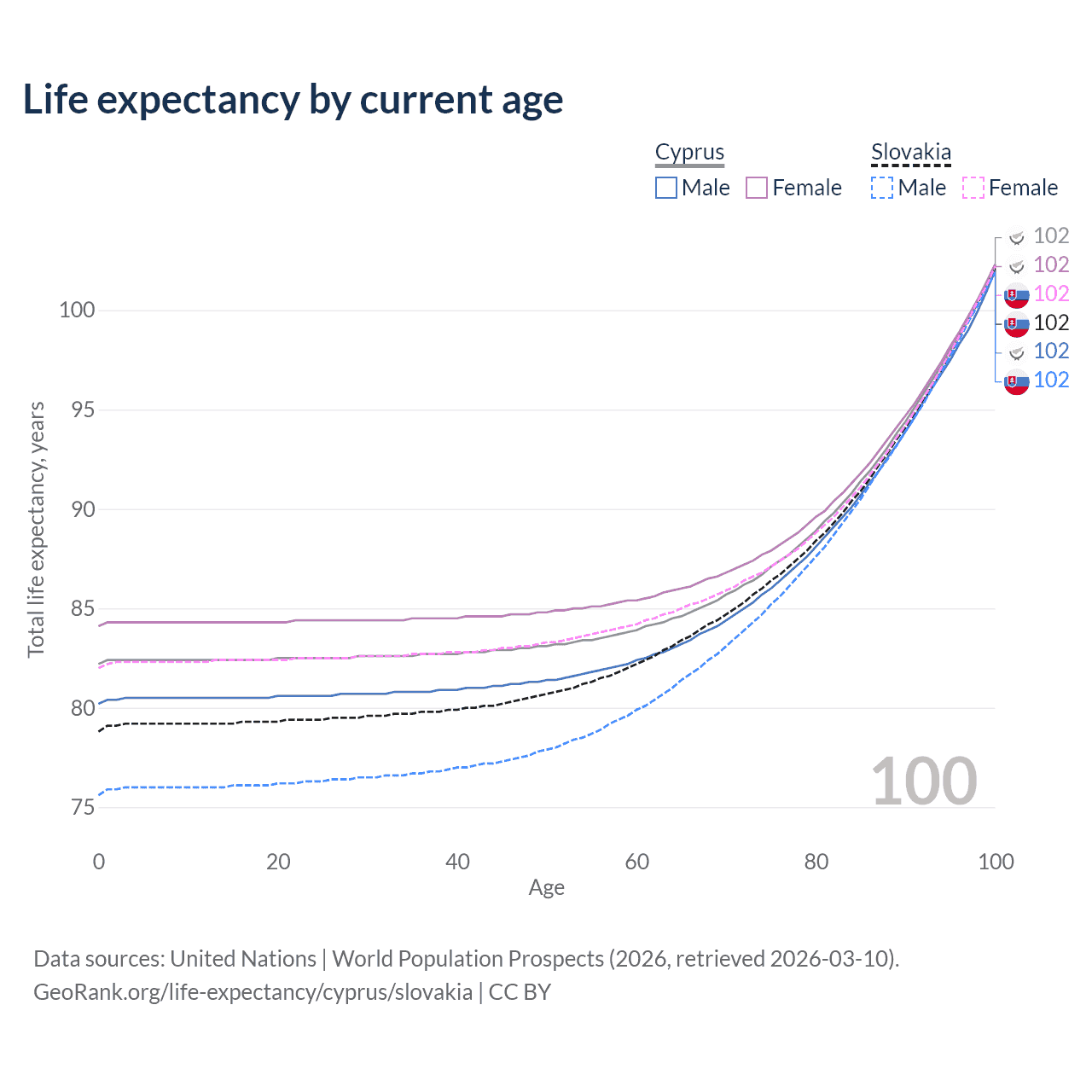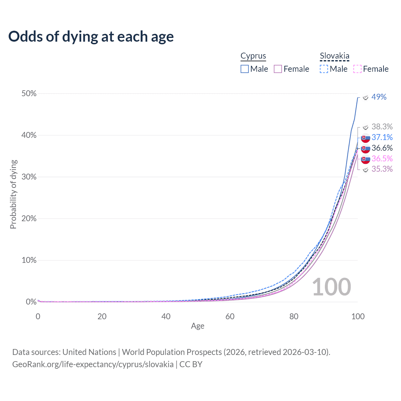 This life expectancy calculator shows the odds of living to 100, 95, 90, and below based on current age for both males and females in Cyprus and Slovakia, along with mean and median age of death. The calculations are based on the 2026 life tables (actuarial tables) from the UN World Population Prospects.