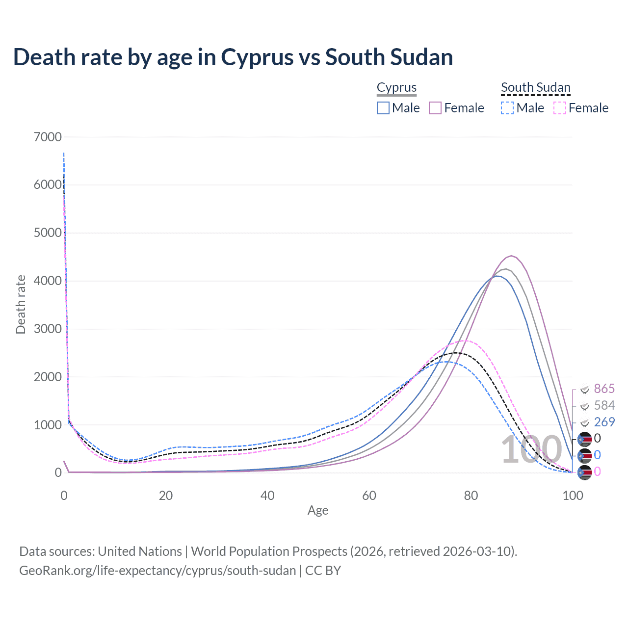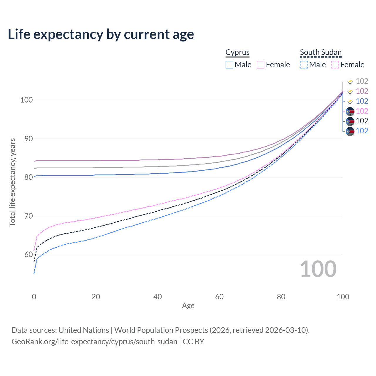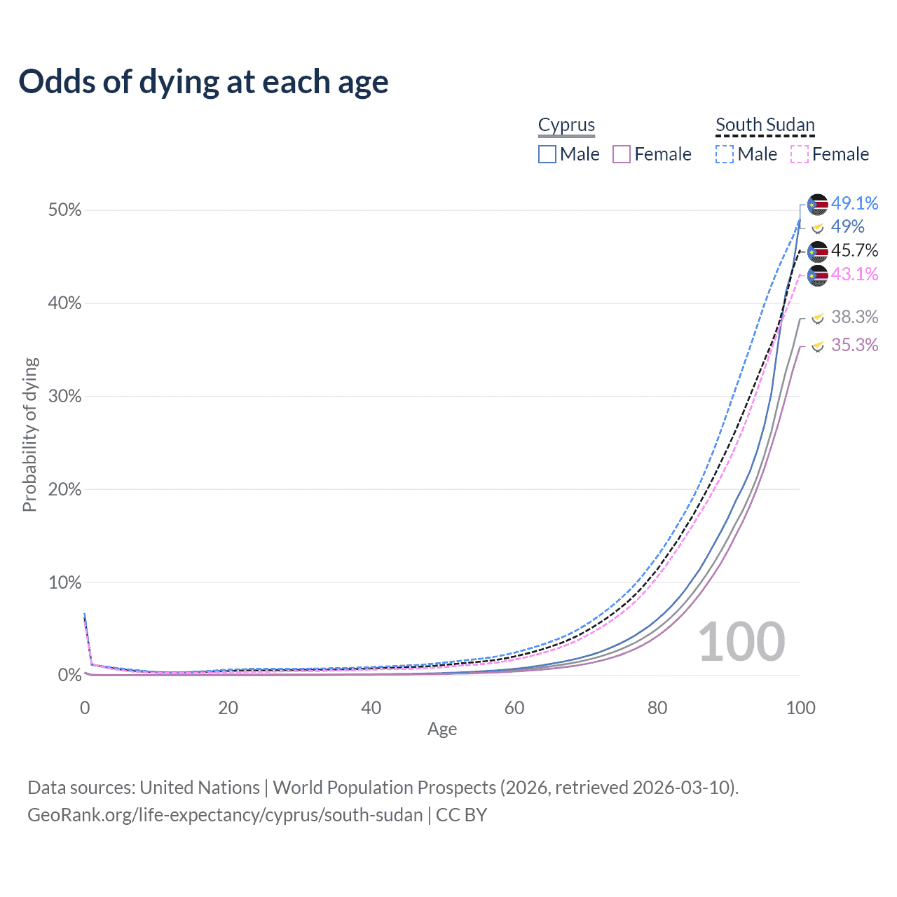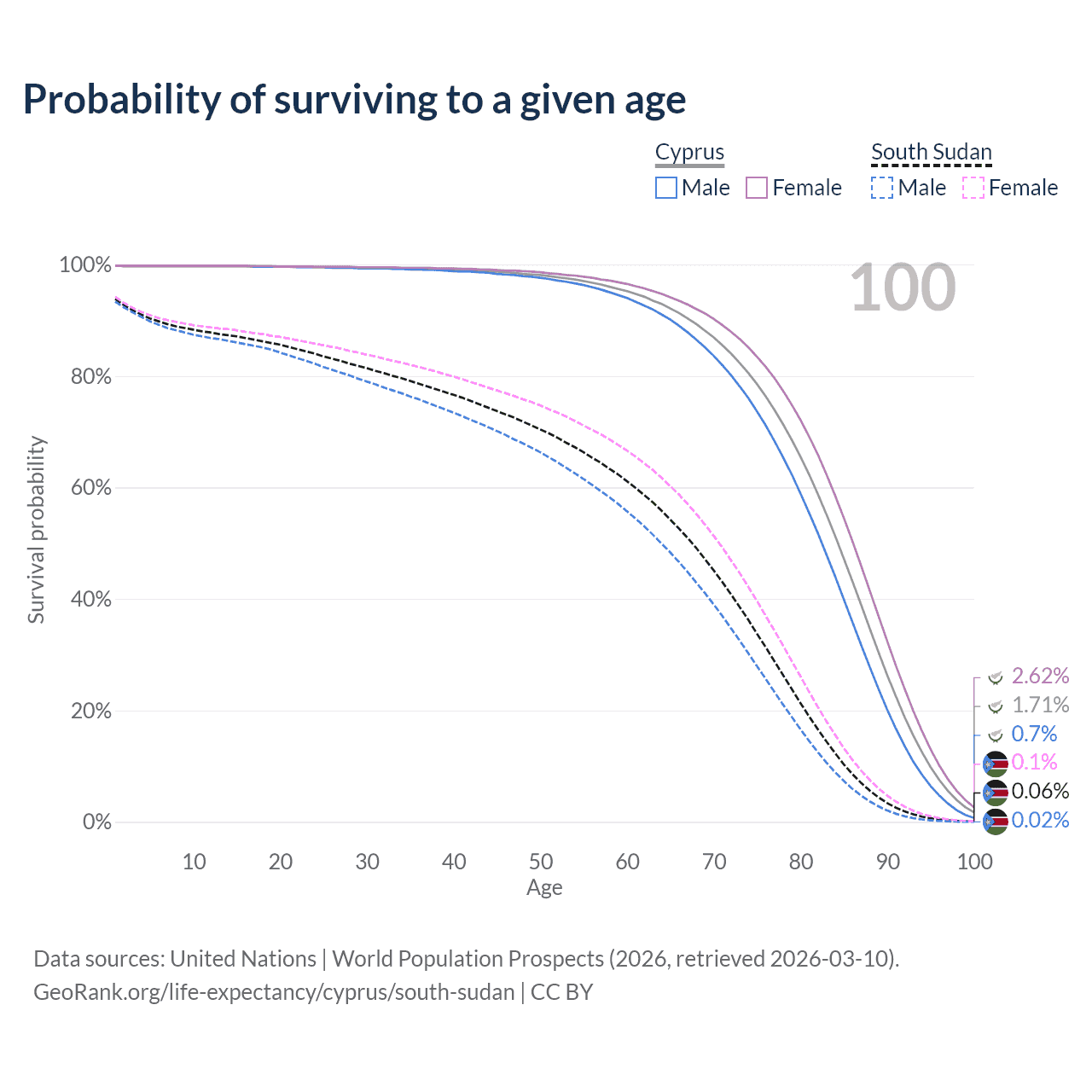 This life expectancy calculator shows the odds of living to 100, 95, 90, and below based on current age for both males and females in Cyprus and South Sudan, along with mean and median age of death. The calculations are based on the 2026 life tables (actuarial tables) from the UN World Population Prospects.