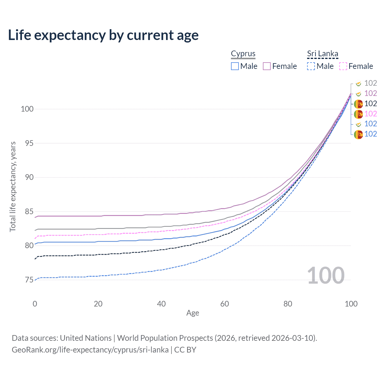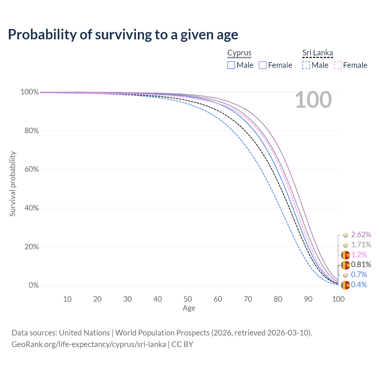This life expectancy calculator shows the odds of living to 100, 95, 90, and below based on current age for both males and females in Cyprus and Sri Lanka, along with mean and median age of death. The calculations are based on the 2026 life tables (actuarial tables) from the UN World Population Prospects.